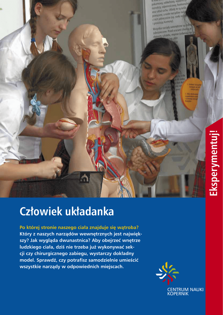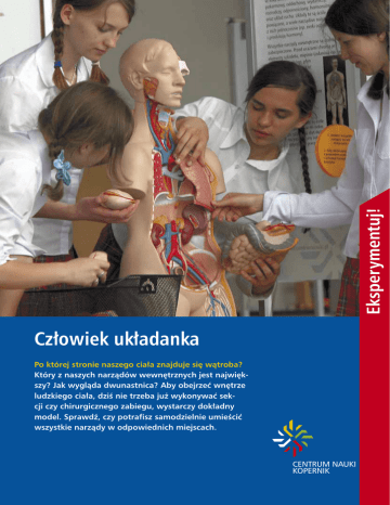 Eksperymentuj! Człowiek układanka Po której stronie naszego ciała znajduje się wątroba? Który z naszych narządów wewnętrznych jest największy? Jak wygląda dwunastnica? Aby obejrzeć wnętrze ludzkiego ciała, dziś nie trzeba już wykonywać sekcji czy chirurgicznego zabiegu, wystarczy dokładny model. Sprawdź, czy potrafisz samodzielnie umieścić wszystkie narządy w odpowiednich miejscach. CENTRUM NAUKI KOPERNIK Trochę teorii asze narządy wewnętrzne można pogrupować w kilka układów: np. krwionośny, nerwowy, pokarmowy, oddechowy, wydalniczy, rozrodczy, odpornościowy, hormonalny oraz układ ruchu. Są one ściśle powiązane, a wiele narządów należy do kilku z nich jednocześnie (np. nerki oczyszczają krew i produkują hormony). Wszystkie narządy wewnętrzne są dobrze zabezpieczone. Przed urazami chronią je elementy szkieletu, mięśnie (osłaniają np. jamę brzuszną), płyny (np. płyn otaczający mózg), a także tłuszcz i skóra. Te ostatnie chronią nas także przed wyziębieniem lub przegrzaniem oraz przed utratą wody. W ciele człowieka, jak w dobrze zorganizowanym przedsiębiorstwie, nad porządkiem czuwa „szef” – mózg. Kontroluje funkcjonowanie całego ciała i odpowiada za myśli, uczucia i pamięć. Mózg składa się z dwóch półkul. Lewa – dominująca u naukowców i umysłów ścisłych – odpowiada za logiczne, analityczne myślenie, tworzenie zdań, które wypowiadamy, oraz „widzi” szczegóły obiektów. Prawa półkula – dominująca u artystów i humanistów – odpowiada za wyobraźnię, intuicję, poczucie rytmu, odbiór kolorów oraz „widzi” zarys obiektów. Centralną część klatki piersiowej zajmuje serce. Wraz z naczyniami krwionośnymi zapewnia transport substancji w organizmie. Serce ma wielkość zaciśniętej pięści, kurczy się 100 tys. razy na dobę, przepompowując w tym czasie ok. 10 tys. l krwi. Serce jest otoczone z obu stron przez płuca, czyli nasz „klimatyzator”. Płuca zbudowane są z pięciu płatów: lewe składa się z dwóch płatów, a prawe z trzech. Płuca mają budowę pęcherzykowatą. U dorosłego człowieka mogą pomieścić około 5 l powietrza. Dla kobiet wartość ta wynosi średnio 3,2 l, a dla mężczyzn 4 l. Natomiast pojemność płuc sportowców to aż 7 l! Człowiek oddycha średnio 16 do 24 razy na minutę, za każdym razem wymieniając zaledwie od 0,35 do 0,5 l powietrza. Oznacza to, że pozostałe kilka litrów gazu znajdującego się w płucach pozostaje w nich dłużej niż przez jeden oddech. Jamę brzuszną wypełniają głównie narządy układu pokarmowego: płuca serce żołądek pęcherzyk żółciowy śledziona wątroba jelito cienkie trzustka jelito grube wyrostek robaczkowy żołądek, dwunastnica, wątroba, trzustka i jelita. Żołądek jest elastycznym workiem, do którego trafia pożywienie. Jest ono poddawane działaniu soku żołądkowego – mieszaniny kwasu solnego i enzymów. Kwas solny zabija bakterie, a enzymy ułatwiają trawienie białek, cukrów oraz wchłanianie witaminy B12. Ściany żołądka pokrywa specjalny śluz, który zabezpiecza je przed działaniem własnych żrących wydzielin. Nadtrawione pożywienie trafia do dwunastnicy, czyli do pierwszego odcinka jelita cienkiego. Zachodzą tu dalsze procesy trawienia białek, cukrów, a także tłuszczów dzięki trzustce wydzielającej enzymy trawienne i wątrobie wydzielającej żółć. Produkowana przez wątrobę żółć jest magazynowana w pęcherzyku żółciowym i w trakcie posiłku jest uwalniana do dwunastnicy. Wątroba leżąca tuż pod przeponą po prawej stronie jamy brzusznej oprócz produkcji żółci odpowiada również za wytwarzanie i wydzielanie do krwi prawie wszystkich białek osocza, magazynuje glikogen, tłuszcze, witaminy i żelazo. Czuwa też nad tym, by krew nie dostarczyła do organizmu trujących składników. Wątroba jest niezbędna do życia. Jej rozległe uszkodzenie, spowodowane np. przez toksyny (np. alkohol), leki, wirusy lub pasożyty, prowadzi do śmierci. Trzustka jest położona na tylnej ścianie jamy brzusznej na wysokości pierwszego kręgu lędźwiowego. W ciągu doby wydziela do dwunastnicy ok. 2,5 l soku zawierającego dużą ilość enzymów, które trawią białka, Fot. Corbis, Uppsala Universitet/Anneli Waara; rys. Małgorzata Świentczak Eksperymentuj! N O historii B adanie wewnętrznej budowy ciała jest jedną z najstarszych dyscyplin biologii. Anatomia rozwinęła się już 500 lat p.n.e. Najwybitniejszym przedstawicielem tej nauki w czasach starożytnych był Hipokrates (V–IV w. p.n.e.). Rozwój nowożytnej anatomii zapoczątkował flamandzki uczony Andreas Vesalius (1514–1564). Anatomia przez bardzo długi czas była nauką wyłącznie opisową, a do badań wykorzystywano sekcje zwłok. Zmieniło się to 23 stycznia 1896 roku, kiedy to niemiecki naukowiec Wilhelm K. Roentgen zaprezentował światu swoje genialne odkrycie – promienie X. Odkrycie Roentgena zrewolucjonizowało medycynę. Dzięki niemu bez użycia skalpela można było oglądać ludzkie kości i niektóre narządy. Już w tym samym roku polski chirurg prof. Alfred Obaliński na podstawie zdjęcia rentgenowskiego rozpoznał zwichnięcie w stawie łokciowym. Następnym wielkim krokiem w historii anatomii były przeszczepy narządów. Pierwszego przeszczepu dokonali bostońscy lekarze Joseph Murray i John Merrill w 1954 roku. Przeszczepionym organem była nerka. W Polsce pierwszy przeszczep (również nerki) wykonał w 1965 roku wrocławski chirurg Wiktor Bross. Współczesne zastosowania D ziś nowoczesne techniki pozwalają obejrzeć niemal każdy narząd wewnętrzny bez chirurgicznego zabiegu. Oprócz zdjęć rentgenowskich wykorzystuje się w tym celu m.in. ultrasonografię (USG), w której używa się fal o wysokiej częstotliwości. Wnikają one do naszego ciała i odbijają się od narządów wewnętrznych. Odbicia są przetwarzane przez komputer i wyświetlane na mon