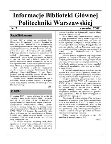 Informacje Biblioteki Głównej Politechniki Warszawskiej Nr 2 Rada Biblioteczna 18 maja 2007 r. odbyło się posiedzenie Rady Bibliotecznej. W spotkaniu uczestniczył Prorektor ds. Nauki Prof. dr hab. Tadeusz Kulik. Rada Biblioteczna po wysłuchaniu przedstawionej informacji i krótkiej dyskusji przyjęła Sprawozdanie za rok 2006 Biblioteki Głównej i systemu biblioteczno-informacyjnego. Podczas spotkania dyskutowano również o przyjętych na Uczelni nowych zasadach finansowania prenumeraty czasopism zagranicznych i zakupu licencji na dostęp do baz danych na 2008 rok. Rada podjęła Uchwałę wskazująca na potrzebę zwiększenia dotacji przeznaczonej na ten cel oraz zagwarantowania możliwości utrzymania dostępu do źródeł informacji na dotychczasowym poziomie. Rada Biblioteczna pozytywnie zaopiniowała wnioski o awans na starszego bibliotekarza dla mgr Małgorzaty Muszyńskiej-Małczak i mgr Doroty Szczęsnej oraz na stanowisko kustosza dla mgr Jacka Trojanowskiego. Gratulujemy kolegom awansu. Dyrektor Jolanta Stępniak poinformowała Radę o przekazanej Radzie Wydziału Geodezji i Kartografii ofercie przekształcenia Biblioteki Wydziałowej w Filię Biblioteki Głównej. (J.S.) ALEPH 23 kwietnia 2007 r. została włączona do użytku dla czytelników nowa wersja systemu Aleph. Pracownicy rozpoczęli w niej pracę już od 18 kwietnia– w wypożyczalniach od wprowadzania danych o zwrotach i wypożyczeniach dokonywanych funkcją „offline” (nowość w obecnej wersji) lub za pomocą ręcznie wypisywanych rewersów. Od soboty 14 kwietnia system (OPAC WWW) był dostępny dla czytelników tylko offline, czyli dane nie były aktualizowane na bieżąco. Tego dnia rozpoczęła się konwersja danych z poprzednio użytkowanej przez nas wersji systemu (wer. 14.2) do wersji bieżącej (wer. 16). Już miesiąc wcześniej pracownicy mieli okazję zapoznać się z nową wersją systemu, albowiem w tym czasie dane zostały próbnie przeniesione na serwer testowy. Była to więc nie tylko nauka nowej wersji czerwiec 2007 systemu, interfejsu, ale jednocześnie kontrola jakości przekonwertowanych danych. Był to bardzo trudny, intensywny czas – zwłaszcza dla grupy pracowników, którzy zostali wytypowani do przetestowania działania nowej wersji. Nie tylko sami musieli się nauczyć zasad pracy w nowym interfejsie, ale również sprawdzić, które elementy działają bardziej lub mniej zawodnie lub wadliwie. Niezwykle ważną sprawą było sprawdzenie jakości przekonwertowanych danych w każdej z baz bibliograficznych i danych administracyjnych. Pomocne podczas przygotowań były cotygodniowe spotkania, na których wymieniano się informacjami, uwagami, próbowano rozwikłać zasady pewnych działań, toku pracy, aby jak najłatwiej osiągnąć zamierzony cel. Jest to bardzo potrzebne przede wszystkim w agendach obsługujących czytelników, gdzie liczy się szybkość i pewność działania. W tym czasie również przygotowywaliśmy wszelkie wydruki, m.in. rewers, listy do czytelników, raporty (np. z półki rezerwacji). Nie było to najłatwiejsze, ponieważ od tej wersji systemu wydruki przygotowywane są w XML. Kolejnym elementem przygotowywanym w tym samym czasie był OPAC WWW, czyli opracowanie stron WWW. Wraz z zainstalowanych oprogramowaniem otrzymaliśmy szablon www, który należało dostosować do „naszego” systemu, naszych danych, potrzeb i wymagań. Obecny interfejs OPAC WWW jest zdecydowanie łatwiejszy dla użytkowników, ponieważ uległ „spłaszczeniu”. Nie ma teraz otwierających się „piętrowo” okien typu pop-up. Obecnie powoli system „dociera się”, a my stajemy się pewniejsi w codziennej pracy. Dobra znajomość zasad pracy w poprzedniej wersji ALEPHa bardzo pomogła przy wejściu w nowe oprogramowanie. Mimo, że ilość modułów zmniejszyła się, niektóre zostały połączone i teraz gdzie indziej należy szukać odpowiedzi na pytanie – większość koleżanek i kolegów po krótkim zawahaniu z zainteresowaniem przyjęła wyzwanie. System pracuje na zakupionym w tym roku specjalnie do tego celu serwerze SUN. (grkiw) 2 > http://www.bg.pw.edu.pl/informacjeBGPW.html < Biblioteka cyfrowa PW W kwietniu 2007 r. zainstalowana została nowa wersja – 3.0 oprogramowania dLibra, na którym oparta jest Biblioteka Cyfrowa PW (http://bcpw.bg.pw.edu.pl). Aktualizacja oprogramowania przeprowadzona przez autorów dLibry z Poznańskiego Centrum Superkomputerowo Sieciowego praktycznie nie spowodowała dłuższych przerw w dostępie do zawartości BCPW. Wymagała jednak dodatkowych działań ze strony Oddziału Informatyzacji, mających na celu dostosowanie strony www do potrzeb BG. Interfejs www w wersji 3.0 jest na wejściu jednakowy dla wszystkich bibliotek opartych na oprogramowaniu dLibra. Jednak wygląd strony może być zmieniany już przez administratorów konkretnych bibliotek cyfrowych i dopasowywany do ich indywidualnych potrzeb. Na stronie BCPW dołączone zostało nasze logo, zmienione adresy stron i adresy kontaktów email, poprawione formularze i zmienione nieco barwy na lepiej pasujące do kolorystyki strony domowej BG. W wersji 3.0 wprowadzone zostały zmiany w aplikacji redaktora i administratora. Opis bibliograficzny może być teraz wprowadzany w języku uniwersalnym, specjalnie utworzonym w języku opisu bibliograficznego. Wartości atrybutów z języka uniwersalnego są dodawane do wartości tych samych atrybutów w innych językach podczas prezentowania opisu bibliograficznego na stronach WWW. Zmienił się sposób importowania metadanych, które można teraz importować z pliku (lub można podać adres WWW do pliku z metadanymi - opcja „URL (Adress WWW)". Podobnie zmienił się sposób eksportowania metadanych, które też można zapisywać do pliku. W aplikacji redaktora i administratora w wersji 3.0 wbudowany jest eksport metadanych do formatu RDF. W oknie wyszukiwania została dodana informacja o liczbie znalezionych wyników. Doda