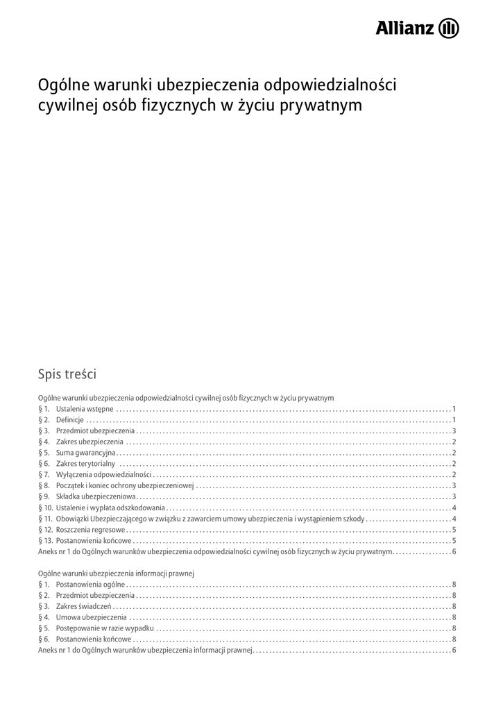 Ogólne warunki ubezpieczenia odpowiedzialności cywilnej osób fizycznych w życiu prywatnym Spis treści Ogólne warunki ubezpieczenia odpowiedzialności cywilnej osób fizycznych w życiu prywatnym § 1. Ustalenia wstępne . . . . . . . . . . . . . . . . . . . . . . . . . . . . . . . . . . . . . . . . . . . . . . . . . . . . . . . . . . . . . . . . . . . . . . . . . . . . . . . . . . . . . . . . . . . . . . . . . . . . . 1 § 2. Definicje . . . . . . . . . . . . . . . . . . . . . . . . . . . . . . . . . . . . . . . . . . . . . . . . . . . . . . . . . . . . . . . . . . . . . . . . . . . . . . . . . . . . . . . . . . . . . . . . . . . . . . . . . . . . . . 1 § 3. Przedmiot ubezpieczenia . . . . . . . . . . . . . . . . . . . . . . . . . . . . . . . . . . . . . . . . . . . . . . . . . . . . . . . . . . . . . . . . . . . . . . . . . . . . . . . . . . . . . . . . . . . . . . . 3 § 4. Zakres ubezpieczenia . . . . . . . . . . . . . . . . . . . . . . . . . . . . . . . . . . . . . . . . . . . . . . . . . . . . . . . . . . . . . . . . . . . . . . . . . . . . . . . . . . . . . . . . . . . . . . . . . . 2 § 5. Suma gwarancyjna . . . . . . . . . . . . . . . . . . . . . . . . . . . . . . . . . . . . . . . . . . . . . . . . . . . . . . . . . . . . . . . . . . . . . . . . . . . . . . . . . . . . . . . . . . . . . . . . . . . . 2 § 6. Zakres terytorialny . . . . . . . . . . . . . . . . . . . . . . . . . . . . . . . . . . . . . . . . . . . . . . . . . . . . . . . . . . . . . . . . . . . . . . . . . . . . . . . . . . . . . . . . . . . . . . . . . . . . 2 § 7. Wyłączenia odpowiedzialności . . . . . . . . . . . . . . . . . . . . . . . . . . . . . . . . . . . . . . . . . . . . . . . . . . . . . . . . . . . . . . . . . . . . . . . . . . . . . . . . . . . . . . . . . . 2 § 8. Początek i koniec ochrony ubezpieczeniowej . . . . . . . . . . . . . . . . . . . . . . . . . . . . . . . . . . . . . . . . . . . . . . . . . . . . . . . . . . . . . . . . . . . . . . . . . . . . . 3 § 9. Składka ubezpieczeniowa . . . . . . . . . . . . . . . . . . . . . . . . . . . . . . . . . . . . . . . . . . . . . . . . . . . . . . . . . . . . . . . . . . . . . . . . . . . . . . . . . . . . . . . . . . . . . . 3 § 10. Ustalenie i wypłata odszkodowania . . . . . . . . . . . . . . . . . . . . . . . . . . . . . . . . . . . . . . . . . . . . . . . . . . . . . . . . . . . . . . . . . . . . . . . . . . . . . . . . . . . . . 4 § 11.Obowiązki Ubezpieczającego w związku z zawarciem umowy ubezpieczenia i wystąpieniem szkody . . . . . . . . . . . . . . . . . . . . . . . . . . 4 § 12. Roszczenia regresowe . . . . . . . . . . . . . . . . . . . . . . . . . . . . . . . . . . . . . . . . . . . . . . . . . . . . . . . . . . . . . . . . . . . . . . . . . . . . . . . . . . . . . . . . . . . . . . . . . 5 § 13. Postanowienia końcowe . . . . . . . . . . . . . . . . . . . . . . . . . . . . . . . . . . . . . . . . . . . . . . . . . . . . . . . . . . . . . . . . . . . . . . . . . . . . . . . . . . . . . . . . . . . . . . . . 5 Aneks nr 1 do Ogólnych warunków ubezpieczenia odpowiedzialności cywilnej osób fizycznych w życiu prywatnym . . . . . . . . . . . . . . . . . 6 Ogólne warunki ubezpieczenia informacji prawnej § 1. Postanowienia ogólne . . . . . . . . . . . . . . . . . . . . . . . . . . . . . . . . . . . . . . . . . . . . . . . . . . . . . . . . . . . . . . . . . . . . . . . . . . . . . . . . . . . . . . . . . . . . . . . . . 8 § 2. Przedmiot ubezpieczenia . . . . . . . . . . . . . . . . . . . . . . . . . . . . . . . . . . . . . . . . . . . . . . . . . . . . . . . . . . . . . . . . . . . . . . . . . . . . . . . . . . . . . . . . . . . . . . . 8 § 3. Zakres świadczeń . . . . . . . . . . . . . . . . . . . . . . . . . . . . . . . . . . . . . . . . . . . . . . . . . . . . . . . . . . . . . . . . . . . . . . . . . . . . . . . . . . . . . . . . . . . . . . . . . . . . . 8 § 4. Umowa ubezpieczenia . . . . . . . . . . . . . . . . . . . . . . . . . . . . . . . . . . . . . . . . . . . . . . . . . . . . . . . . . . . . . . . . . . . . . . . . . . . . . . . . . . . . . . . . . . . . . . . . . 8 § 5. Postępowanie w razie wypadku . . . . . . . . . . . . . . . . . . . . . . . . . . . . . . . . . . . . . . . . . . . . . . . . . . . . . . . . . . . . . . . . . . . . . . . . . . . . . . . . . . . . . . . . . 8 § 6. Postanowienia końcowe . . . . . . . . . . . . . . . . . . . . . . . . . . . . . . . . . . . . . . . . . . . . . . . . . . . . . . . . . . . . . . . . . . . . . . . . . . . . . . . . . . . . . . . . . . . . . . . . 8 Aneks nr 1 do Ogólnych warunków ubezpieczenia informacji prawnej . . . . . . . . . . . . . . . . . . . . . . . . . . . . . . . . . . . . . . . . . . . . . . . . . . . . . . . . . . . 6 Ogólne warunki ubezpieczenia odpowiedzialności cywilnej osób fizycznych w życiu prywatnym 1. Ogólne warunki ubezpieczenia odpowiedzialności cywilnej osób fizycznych w życiu prywatnym, zwane dalej o.w.u., stosuje się w umowach ubezpieczenia zawieranych z osobami fizycznymi przez Towarzystwo Ubezpieczeń i Reasekuracji Allianz Polska Spółka Akcyjna zwane dalej Allianz. 2. Wprowadzenie do umowy ubezpieczenia postanowień dodatkowych lub odmiennych od o.w.u. wymaga formy pisemnej i przyjęcia tych postanowień przez obie strony umowy pod rygorem nieważności. Różnicę pomiędzy treścią umowy ubezpieczenia a o.w.u. Allianz przedstawi Ubezpieczającemu na piśmie przed zawarciem umowy, chyba że do zawarcia umowy dochodzi w wyniku negocjacji stron. 3. Wybór zakresu ochrony ubezpieczeniowej jest dokonywany przez Ubezpieczającego we wniosku o ubezpieczenie i potwierdzony przez Allianz na polisie ubezpieczeniowej. § 2. Definicje Użyte w niniejszych o.w.u. określenia mają następujące znaczenie: 1) Budynek – obiekt budowlany trwale związany z gruntem, wydzielony z przestrzeni za pomocą przegród budowlanych, posiadający fundamenty i dach, wraz z wbudowanymi instalacjami, urządzeniami technicznymi zapewniający