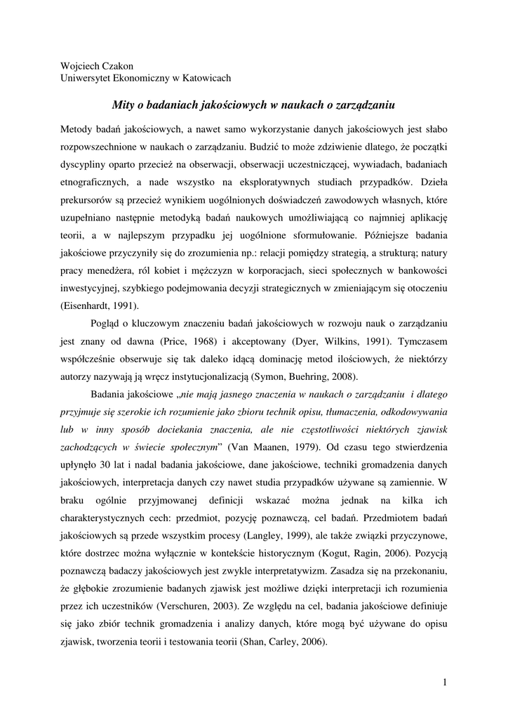 Wojciech Czakon Uniwersytet Ekonomiczny w Katowicach Mity o badaniach jakościowych w naukach o zarządzaniu Metody badań jakościowych, a nawet samo wykorzystanie danych jakościowych jest słabo rozpowszechnione w naukach o zarządzaniu. Budzić to może zdziwienie dlatego, że początki dyscypliny oparto przecież na obserwacji, obserwacji uczestniczącej, wywiadach, badaniach etnograficznych, a nade wszystko na eksploratywnych studiach przypadków. Dzieła prekursorów są przecież wynikiem uogólnionych doświadczeń zawodowych własnych, które uzupełniano następnie metodyką badań naukowych umożliwiającą co najmniej aplikację teorii, a w najlepszym przypadku jej uogólnione sformułowanie. Późniejsze badania jakościowe przyczyniły się do zrozumienia np.: relacji pomiędzy strategią, a strukturą; natury pracy menedżera, ról kobiet i mężczyzn w korporacjach, sieci społecznych w bankowości inwestycyjnej, szybkiego podejmowania decyzji strategicznych w zmieniającym się otoczeniu (Eisenhardt, 1991). Pogląd o kluczowym znaczeniu badań jakościowych w rozwoju nauk o zarządzaniu jest znany od dawna (Price, 1968) i akceptowany (Dyer, Wilkins, 1991). Tymczasem współcześnie obserwuje się tak daleko idącą dominację metod ilościowych, że niektórzy autorzy nazywają ją wręcz instytucjonalizacją (Symon, Buehring, 2008). Badania jakościowe „nie mają jasnego znaczenia w naukach o zarządzaniu i dlatego przyjmuje się szerokie ich rozumienie jako zbioru technik opisu, tłumaczenia, odkodowywania lub w inny sposób dociekania znaczenia, ale nie częstotliwości niektórych zjawisk zachodzących w świecie społecznym” (Van Maanen, 1979). Od czasu tego stwierdzenia upłynęło 30 lat i nadal badania jakościowe, dane jakościowe, techniki gromadzenia danych jakościowych, interpretacja danych czy nawet studia przypadków używane są zamiennie. W braku ogólnie przyjmowanej definicji wskazać można jednak na kilka ich charakterystycznych cech: przedmiot, pozycję poznawczą, cel badań. Przedmiotem badań jakościowych są przede wszystkim procesy (Langley, 1999), ale także związki przyczynowe, które dostrzec można wyłącznie w kontekście historycznym (Kogut, Ragin, 2006). Pozycją poznawczą badaczy jakościowych jest zwykle interpretatywizm. Zasadza się na przekonaniu, że głębokie zrozumienie badanych zjawisk jest możliwe dzięki interpretacji ich rozumienia przez ich uczestników (Verschuren, 2003). Ze względu na cel, badania jakościowe definiuje się jako zbiór technik gromadzenia i analizy danych, które mogą być używane do opisu zjawisk, tworzenia teorii i testowania teorii (Shan, Carley, 2006). 1 Pomimo powszechnie znanych słabości metod ilościowych (Kogut, Ragin, 2006) i osiągnięcia przez nie granic przydatności do badania kluczowych problemów np. w zarządzaniu strategicznym (Greckhamer, Misangyi i in. 2007) badania jakościowe traktowane są z nieufnością. Tak wielką, że wokół nich narosło wiele mitów. Celem artykułu jest krytyczne rozprawienie się z pięcioma spośród nich: przypadkowością gromadzenia danych, nie systematycznością analizy danych, niemożliwością testowania teorii, dowolności w tworzeniu teorii oraz najbardziej krzywdzący – braku spełnienia kryteriów teorii. Mit 1 – badania jakościowe przypadkowo gromadzą dane Katalog danych jakościowych, który tworzy instrumentarium badacza obejmuje m.in.: obserwacje, wywiady, dokumenty archiwalne (Eisenhardt, Greabner, 2007; Shah, Corley, 2006). Na obserwację składają się techniki stosunkowo mało inwazyjne jak obserwacja prosta znana z badań antropologów i etnografii, a także obserwacja uczestnicząca, która stwarza badaczowi lepszy dostęp do badanej rzeczywistości dzięki możliwości interakcji i zanurzeniu w takich samych okolicznościach jak badana organizacja (Verschuren, 2003). Wywiady w badaniach jakościowych są zwykle półstrukturyzowane i raczej zwierają otwarte pytania kierunkowe niż odpowiedzi w skali Likerta czy zamknięte katalogi, spośród których respondent dokonuje wyboru. Dokumenty archiwalne obejmują zwykle fotografie, e-maile, nagrania video, schematy organizacyjne, procedury i inne artefakty organizacyjne. Zalety danych jakościowych wydają się niezbite, są one przecież: „treściwe, pełne, rzeczywiste, całościowe, rzeczywiste, fasadowo trafne, mało podatne na zniekształcenia retrospekcji, stwarzają dostęp do przyczynowości w zjawiskach organizacyjnych, wymagają niewielkiego przygotowania ex ante do gromadzenia”. Oprócz tych niezbitych zalet pojawiają się jednakże wątpliwości, lub wręcz zarzuty, dotyczące: pracochłonności gromadzenia danych, skażenia danych przez badacza, nadmiernej obfitości, słabego stopnia uporządkowania metod analizy (Miles 1979). Rozpocząć trzeba od przypomnienia kryteriów oceny interpretatywnej analizy danych. Otóż powinna ona dostarczać wiarygodnych oraz racjonalnych wyjaśnień badanego zjawiska, umożliwiających jego głębsze zrozumienie. Z tego powodu ogólna procedura gromadzenia danych przebiega zupełnie inaczej niż w modelu badań ilościowych. Tradycyjny sposób ma przebieg liniowy i sekwencyjny: od hipotez badawczych, przez przygotowanie protokołów gromadzenia danych, gromadzenie danych, aż do analizy i dyskusji wniosków. Tymczasem w badaniach jakościowych zachodzi raczej iteracyjno-równoległy model postępowania. Gromadzone dane zwykle otwierają nowe pola eksploracji, które uruchamiają kolejny etap 2 gromadzenia po to, aby końcowe opracowanie, analiza porównawcza i wynikające z niej propozycje były wykonalne i wiarygodne (Miles, 1979). Ponadto, badania jakościowe stosują standardowo wiele technik gromadzenia danych (Gaphart, 2004). Kluczową sprawą w gromadzeniu danych jakościowych jest wielość źródeł, a następnie ich wykorzystanie „konfrontując każde źródło i każdego informatora po to, aby odczyta