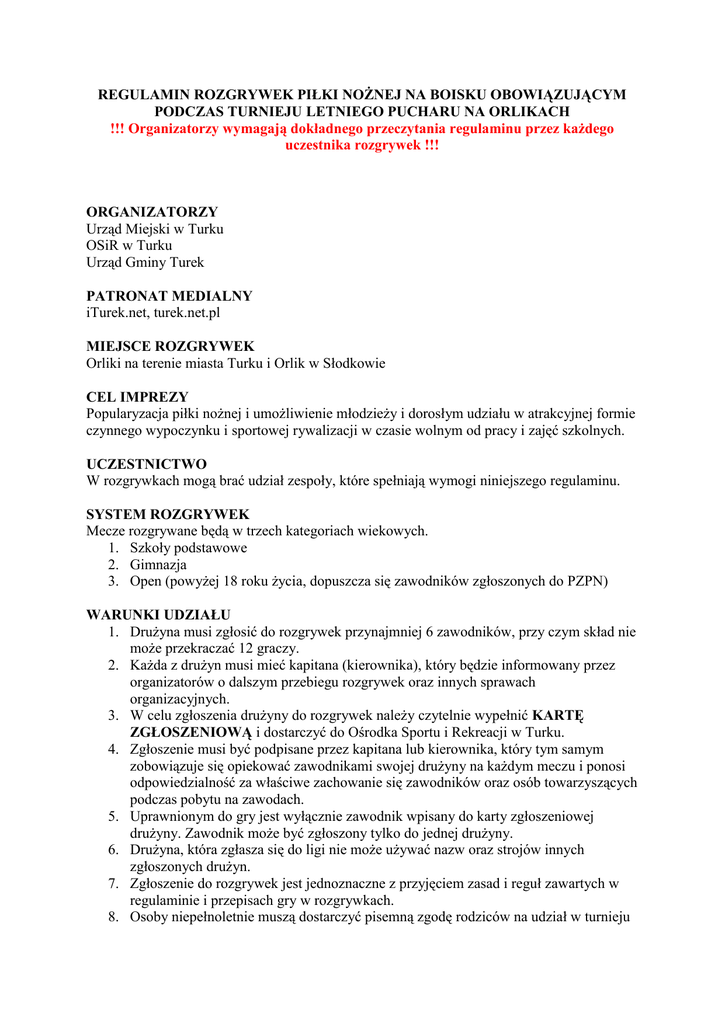 REGULAMIN ROZGRYWEK PIŁKI NOŻNEJ NA BOISKU OBOWIĄZUJĄCYM PODCZAS TURNIEJU LETNIEGO PUCHARU NA ORLIKACH !!! Organizatorzy wymagają dokładnego przeczytania regulaminu przez każdego uczestnika rozgrywek !!! ORGANIZATORZY Urząd Miejski w Turku OSiR w Turku Urząd Gminy Turek PATRONAT MEDIALNY iTurek.net, turek.net.pl MIEJSCE ROZGRYWEK Orliki na terenie miasta Turku i Orlik w Słodkowie CEL IMPREZY Popularyzacja piłki nożnej i umożliwienie młodzieży i dorosłym udziału w atrakcyjnej formie czynnego wypoczynku i sportowej rywalizacji w czasie wolnym od pracy i zajęć szkolnych. UCZESTNICTWO W rozgrywkach mogą brać udział zespoły, które spełniają wymogi niniejszego regulaminu. SYSTEM ROZGRYWEK Mecze rozgrywane będą w trzech kategoriach wiekowych. 1. Szkoły podstawowe 2. Gimnazja 3. Open (powyżej 18 roku życia, dopuszcza się zawodników zgłoszonych do PZPN) WARUNKI UDZIAŁU 1. Drużyna musi zgłosić do rozgrywek przynajmniej 6 zawodników, przy czym skład nie może przekraczać 12 graczy. 2. Każda z drużyn musi mieć kapitana (kierownika), który będzie informowany przez organizatorów o dalszym przebiegu rozgrywek oraz innych sprawach organizacyjnych. 3. W celu zgłoszenia drużyny do rozgrywek należy czytelnie wypełnić KARTĘ ZGŁOSZENIOWĄ i dostarczyć do Ośrodka Sportu i Rekreacji w Turku. 4. Zgłoszenie musi być podpisane przez kapitana lub kierownika, który tym samym zobowiązuje się opiekować zawodnikami swojej drużyny na każdym meczu i ponosi odpowiedzialność za właściwe zachowanie się zawodników oraz osób towarzyszących podczas pobytu na zawodach. 5. Uprawnionym do gry jest wyłącznie zawodnik wpisany do karty zgłoszeniowej drużyny. Zawodnik może być zgłoszony tylko do jednej drużyny. 6. Drużyna, która zgłasza się do ligi nie może używać nazw oraz strojów innych zgłoszonych drużyn. 7. Zgłoszenie do rozgrywek jest jednoznaczne z przyjęciem zasad i reguł zawartych w regulaminie i przepisach gry w rozgrywkach. 8. Osoby niepełnoletnie muszą dostarczyć pisemną zgodę rodziców na udział w turnieju ORGANIZACJA ROZGRYWEK Rozgrywki zostaną przeprowadzone w trzech kategoriach wiekowych: Szkoły podstawowe; gimnazja oraz w kategorii „OPEN”. 1. Dokładny system rozgrywania zostanie podany po upływie terminu zgłoszeń. 2. Terminy i miejsca spotkań wyznacza organizator. Każda drużyna otrzyma terminarz rozgrywek. 3. Za zwycięstwo drużyna otrzymuje 3 punkty, za remis 1 pkt., przegrana (w tym walkowerem) 0 pkt., wygrana walkowerem 3 pkt. O kolejności w tabeli w fazie eliminacyjnej decyduje w kolejności: - ilość zdobytych punktów, - wynik bezpośredniego pojedynku między drużynami (w przypadku 3 lub więcej drużyn „mała tabela” uwzględniająca wyniki bezpośrednich pojedynków), - ilość goli dodatnich wynikająca z różnicy goli zdobytych i straconych, - ilość zdobytych goli w turnieju, - dodatkowy mecz. 4. Mecze Rundy Finałowej muszą wyłonić zwycięzcę. W przypadku remisu w regulaminowym czasie, zwycięzców wyłonią serie rzutów karnych (najpierw 5, a jeżeli te nie przyniosą rozstrzygnięcia – seria „do skutku” – według Przepisów gry w Piłkę Nożną – PZPN). 5. Godzina podana w terminarzu jest godziną rozpoczęcia rozgrzewki, która trwa 10 minut. 6. Mecz może rozpocząć tylko wtedy, gdy w każdej drużynie jest min. 6 zawodników. Jeżeli drużyna jest reprezentowana przez mniejszą liczbę zawodników, uznawana jest za drużynę niekompletną, a wynik meczu zostanie zweryfikowany na jej niekorzyść w stosunku 3:0 i 0 punktów. 7. Niestawienie się drużyny do czasu zakończenia rozgrzewki oznacza walkower na korzyść drużyny przeciwnej w stosunku 3:0 i 0 punktów. 8. Zawodnicy powinni posiadać jednolite stroje. 9. Kapitan przed meczem zobowiązany jest do powiadomienia sędziów o stanie liczebnym drużyny i wpisania nazwisk zawodników z numerami do protokołu. 10. Uwagi kapitanów dotyczące nieprawidłowości organizacyjnych, sędziowania itp. można po meczu wpisać na odwrocie protokołu. 11. Podczas rozgrywek nie ma możliwości przełożenia meczu. POSTANOWIENIA KOŃCOWE 1. W przypadku nieprzestrzegania regulaminu lub przepisów gry organizator ma prawo: weryfikacji wyniku meczu; dyskwalifikacji zawodnika lub drużyny z rozgrywek. 2. Organizator nie ponosi żadnej odpowiedzialności prawnej za wypadki wynikające z udziału w zajęciach osób chorych oraz skutki wypadków przed, po i w czasie gry. 3. Organizator ma prawo do sprawdzenia tożsamości osób zgłoszonych do meczu. 4. Protokół meczu musi być wypełniony przed meczem, prawidłowość zapisu potwierdza kapitan lub kierownik czytelnym podpisem. Możliwe jest dopisanie spóźnionych osób do składu drużyny, ale tylko do momentu rozpoczęcia drugiej połowy meczu. Zawodnik spóźniony nie może uczestniczyć w meczu do momentu wpisania go do protokołu. 5. Do interpretacji niniejszego regulaminu uprawniony jest jedynie organizator. 6. Organizator nie ponosi odpowiedzialności za rzeczy pozostawione na terenie obiektu. 7. Organizator zastrzega sobie możliwość zmiany terminów meczu podczas trwania rozgrywek. PRZEPISY GRY 1. Zespoły występują w sześcioosobowych składach (bramkarz + 5 zawodników w polu). - Gra może być rozpoczęta w sytuacji, gdy drużyna liczy 6 zawodników. - Jeżeli w wyniku wykluczeń z boiska w którymkolwiek zespole pozostanie mniej niż 3 zawodników, mecz należy zakończyć. - Ilość zmian w locie zawodników z pola podczas trwania rozgrywek jest nieograniczona i nie wymaga przerw w grze. - Zawodnik, który został zmieniony może powtórnie wrócić na boisko podczas kolejnej zmiany. - Zmiana bramkarza może być dokonana tylko w przypadku, kiedy piłka nie jest w grze. - Zmiana w locie ma miejsce wtedy, gdy piłka jest w grze. W Tym przypadku muszą być spełnione następujące warunki: a/ zawodnik opuszcza boisko wyłącznie w miejscu zwanym strefą zmian 