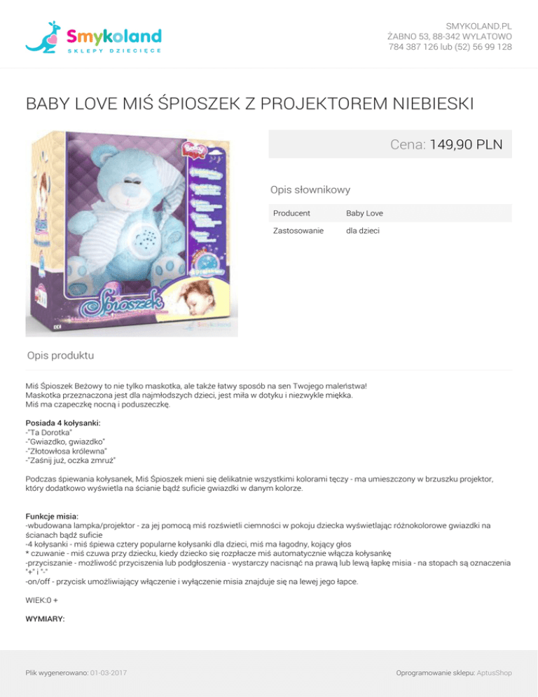SMYKOLAND.PL ŻABNO 53, 88-342 WYLATOWO 784 387 126 lub (52) 56 99 128 BABY LOVE MIŚ ŚPIOSZEK Z PROJEKTOREM NIEBIESKI Cena: 149,90 PLN Opis słownikowy Producent Baby Love Zastosowanie dla dzieci Opis produktu Miś Śpioszek Beżowy to nie tylko maskotka, ale także łatwy sposób na sen Twojego maleństwa! Maskotka przeznaczona jest dla najmłodszych dzieci, jest miła w dotyku i niezwykle miękka. Miś ma czapeczkę nocną i poduszeczkę. Posiada 4 kołysanki: -"Ta Dorotka" -"Gwiazdko, gwiazdko" -"Złotowłosa królewna" -"Zaśnij już, oczka zmruż" Podczas śpiewania kołysanek, Miś Śpioszek mieni się delikatnie wszystkimi kolorami tęczy - ma umieszczony w brzuszku projektor, który dodatkowo wyświetla na ścianie bądź suficie gwiazdki w danym kolorze. Funkcje misia: -wbudowana lampka/projektor - za jej pomocą miś rozświetli ciemności w pokoju dziecka wyświetlając różnokolorowe gwiazdki na ścianach bądź suficie -4 kołysanki - miś śpiewa cztery popularne kołysanki dla dzieci, miś ma łagodny, kojący głos * czuwanie - miś czuwa przy dziecku, kiedy dziecko się rozpłacze miś automatycznie włącza kołysankę -przyciszanie - możliwość przyciszenia lub podgłoszenia - wystarczy nacisnąć na prawą lub lewą łapkę misia - na stopach są oznaczenia "+" i "-" -on/off - przycisk umożliwiający włączenie i wyłączenie misia znajduje się na lewej jego łapce. WIEK:0 + WYMIARY: Plik wygenerowano: 01-03-2017 Oprogramowanie sklepu: AptusShop SMYKOLAND.PL ŻABNO 53, 88-342 WYLATOWO 784 387 126 lub (52) 56 99 128 -opakowania: 29 x 26 x 18 cm -wysokość misia: ok 27 cm ZASILANIE: 3 x baterie AA 1,5 V - dołączone baterie testowe Instrukcja użytkowania baterii w Regulaminie. Plik wygenerowano: 01-03-2017 Powered by TCPDF (www.tcpdf.org) Oprogramowanie sklepu: AptusShop