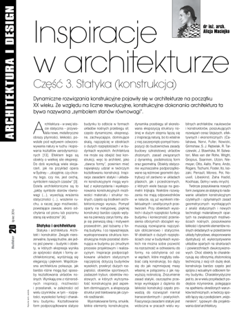 ARCHITEKTURA I DESIGN Inspiracje w architekturze dr inż. arch. Alicja Maciejko Część 3. Statyka (konstrukcja) Dynamiczne rozwiązania konstrukcyjne pojawiły się w architekturze na początku XX wieku. Ze względu na liczne rewolucyjne, konstrukcyjne dokonania architektura ta bywa nazywana „symbolem stanów równowagi”. A lipiec 2016 rchitektura – w swej istocie statyczna – przywołała nowe, metaforyczne obrazy płynności, lekkości, powstałe pod wpływem odwzorowywania natury w ruchu i kopiowania kształtów aerodynamicznych [13]. Efektem tego są obiekty o wielkiej sile ekspresji. Do dziś wywołują wiele skojarzeń, jak na przykład opera w Sydney – „obojętnie, czy chcemy tego, czy nie, jest cechą, symbolem naszych czasów” [3]. Dzieła architektoniczne są to „jakby symbole stanów równowagi (…), wywołują wrażenia statyczności (…), wrażenie ruchu, a raczej jego możliwości, powstające zawsze, skoro odchylenia od pionu lub poziomu staną się widoczne” [4]. Rysunki arch. autorki, Builder 20 Statyka i architektura Statyka i architektura. Architekt i konstruktor. Związki nierozerwalne, bywają trudne, ale jedno jest pewne – budynki i obiekty, w których ekspresja wynika ze spójności statyki i formy architektonicznej, wyróżniają się elegancją i pięknem. Współczesna architektura pokazuje, jak bardzo różne mogą być sposoby kształtowania układów nośnych. Wynikają one z różnorodnych inspiracji, możliwości i przesłanek, w zależności od wielu czynników, w tym – rozpiętości, wysokości funkcji i charakteru budynku. Kształtowanie form podporządkowane statyce budynku to odbicie w formach układów nośnych przebiegu sił, często dynamiczne, ekspresyjne, zachwycające, dominujące skalą, najczęściej w obiektach o dużych rozpiętościach i w budynkach wysokich. Architektura nie może się obejść bez konstrukcji, więc to architekt, jako „dawca formy”, powinien mieć największy udział w twórczym kształtowaniu konstrukcji. Inspiracje zasadami statyki i układami konstrukcyjnymi mogą wynikać z wykorzystania i wyeksponowania konstrukcyjnych możliwości materiału i struktur nośnych, często są środkiem architektonicznego wyrazu. Pomysł oparty na nietypowej, pięknej konstrukcji bardzo często wpływa na pierwszy zarys formy, staje się pierwszą ideą i motywem przewodnim, jest tożsamy z formą budynku. I co najważniejsze, wyeksponowana struktura konstrukcyjna może pozostać dominująca w budynku po żmudnym procesie projektowym i realizacyjnym. Inspiracje podporządkowane układom statycznym najczęściej dotyczą budynków wysokich, przekryć dużych rozpiętości, obiektów sportowych, zadaszeń trybun, obiektów mostowych, w których wytrzymałość konstrukcyjna jest aspektem dominującym, a ekspozycja struktur jest traktowana jak czynnik rzeźbiarski. Wysmakowane formy, smukłe, lekkie elementy konstrukcyjne, dynamika przebiegu sił skorelowana ekspozycją struktury nośnej w dużym stopniu łączą się z inspiracją naturą, bo to właśnie z niej zaczerpnięto pomysł transpozycji do budownictwa zasady budowy szkieletowej układów złożonych, zasad związanych z dynamiką, podatnością form oraz geometrią. Obiekty statycznie wyznaczalne podporządkowane są reżimowi geometrii dystrybucji sił zarówno w układach płaskich, jak i przestrzennych, z których wiele bazuje na geometrii trójkąta. Niektóre rozwiązania nie mają odpowiedników w naturze, są już wynikiem intelektualnych i analitycznych przetworzeń. Przy obiektach wysokich i dużych rozpiętości funkcja budynku i konieczność przeniesienia olbrzymich obciążeń wymuszają rozwiązania najczystsze obliczeniowo i statycznie. W obiektach o dużych rozpiętościach oraz w budynkach wysokich nie można sobie pozwolić na rozrzutność w odniesieniu do formy, na odchylenia od osi w węzłach, które mogłyby osłabiać całą konstrukcję, bo dąży się do jak najmniejszej masy własnej w połączeniu z jak najwyższą nośnością. Zrozumienie zasad statyki, oszczędne przekroje wynikające z dążenia do lekkości konstrukcji często prowadzą do rozwiązań niemal transcendentnych i poetyckich. Fascynacja zasadami statyki jest widoczna w pracach wielu wy- bitnych architektów, naukowców i konstruktorów, poszukujących rozwiązań coraz lżejszych, efektywnych i ekonomicznych. (Calatrawa, Nervi, Fuller, Nowicki, Grimshaw, S. J. Rębielak, R. Tarczewski, J. Sławińska, M. Salwatori, Mies van der Rohe, Wright, Gropius, Saarinen, Utzon, Niemeyer, Otto, Aalto, Piano, Ando, Rogers, Tschumi, Foster, Ito, Isozaki, Perrault, Moneo, Pei, Nouvell, Libeskind, Zaha Hadid, Koolhaas, Gehry i wielu innych). Twórcze poszukiwania nowych form związane ze statyką to nadawanie układom konstrukcyjnym czytelnych i optymalnych zasad geometrycznych wynikających z analiz statycznych i nowych technologii materiałowych opartych na zwiększonych możliwościach nośnych, poszukiwanie lekkości i dynamiki elementów nośnych składanych w przestrzenne układy hybrydowe, eksponowanie dystrybucji sił, wykorzystywanie układów opartych na strukturach i powierzchniach dwukrzywiznowych. Choć obiekty te charakteryzują się olbrzymią złożonością techniczną z racji ich dużej skali, konstrukcja bardzo często jest spójna z wizualnym odbiorem formy budynku. Charakterystyczne jest to, że w wielu przykładach podejście inżynierskie, polegające na spełnieniu określonych warunków technicznych, w twórczy sposób łączy się z podejściem „wizjonerskim”, typowym dla projektowania dzieł architektury. dla jakości dzieła architektury jak prawa mechaniki, czystość logiki konstrukcyjnej, perfekcja dopasowania i rytm elementów. Z pozoru mechaniczne powtarzanie prowadzi w dwie strony: ku obiektom o charakterze niemal trans- cendentnym i ku budowlom z pozoru obojętnym, a także do obiektów rzeźbiarskich, rozbudowanych w formie i struk
