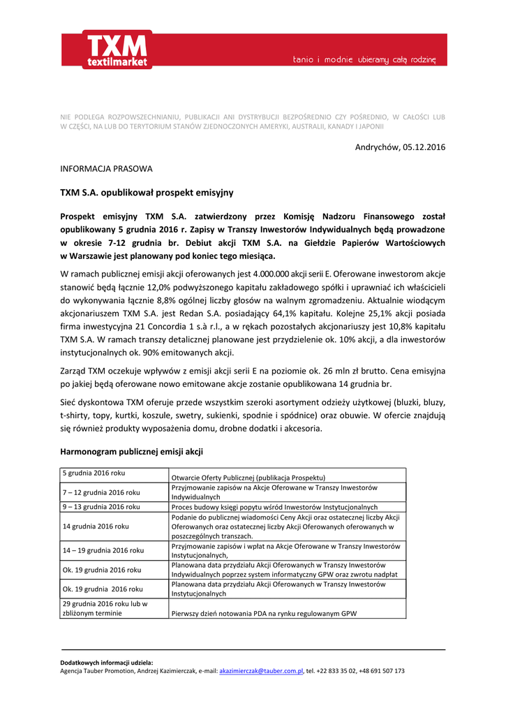 NIE PODLEGA ROZPOWSZECHNIANIU, PUBLIKACJI ANI DYSTRYBUCJI BEZPOŚREDNIO CZY POŚREDNIO, W CAŁOŚCI LUB W CZĘŚCI, NA LUB DO TERYTORIUM STANÓW ZJEDNOCZONYCH AMERYKI, AUSTRALII, KANADY I JAPONII Andrychów, 05.12.2016 INFORMACJA PRASOWA TXM S.A. opublikował prospekt emisyjny Prospekt emisyjny TXM S.A. zatwierdzony przez Komisję Nadzoru Finansowego został opublikowany 5 grudnia 2016 r. Zapisy w Transzy Inwestorów Indywidualnych będą prowadzone w okresie 7-12 grudnia br. Debiut akcji TXM S.A. na Giełdzie Papierów Wartościowych w Warszawie jest planowany pod koniec tego miesiąca. W ramach publicznej emisji akcji oferowanych jest 4.000.000 akcji serii E. Oferowane inwestorom akcje stanowić będą łącznie 12,0% podwyższonego kapitału zakładowego spółki i uprawniać ich właścicieli do wykonywania łącznie 8,8% ogólnej liczby głosów na walnym zgromadzeniu. Aktualnie wiodącym akcjonariuszem TXM S.A. jest Redan S.A. posiadający 64,1% kapitału. Kolejne 25,1% akcji posiada firma inwestycyjna 21 Concordia 1 s.à r.l., a w rękach pozostałych akcjonariuszy jest 10,8% kapitału TXM S.A. W ramach transzy detalicznej planowane jest przydzielenie ok. 10% akcji, a dla inwestorów instytucjonalnych ok. 90% emitowanych akcji. Zarząd TXM oczekuje wpływów z emisji akcji serii E na poziomie ok. 26 mln zł brutto. Cena emisyjna po jakiej będą oferowane nowo emitowane akcje zostanie opublikowana 14 grudnia br. Sieć dyskontowa TXM oferuje przede wszystkim szeroki asortyment odzieży użytkowej (bluzki, bluzy, t-shirty, topy, kurtki, koszule, swetry, sukienki, spodnie i spódnice) oraz obuwie. W ofercie znajdują się również produkty wyposażenia domu, drobne dodatki i akcesoria. Harmonogram publicznej emisji akcji 5 grudnia 2016 roku 7 – 12 grudnia 2016 roku 9 – 13 grudnia 2016 roku 14 grudnia 2016 roku 14 – 19 grudnia 2016 roku Ok. 19 grudnia 2016 roku Ok. 19 grudnia 2016 roku 29 grudnia 2016 roku lub w zbliżonym terminie Otwarcie Oferty Publicznej (publikacja Prospektu) Przyjmowanie zapisów na Akcje Oferowane w Transzy Inwestorów Indywidualnych Proces budowy księgi popytu wśród Inwestorów Instytucjonalnych Podanie do publicznej wiadomości Ceny Akcji oraz ostatecznej liczby Akcji Oferowanych oraz ostatecznej liczby Akcji Oferowanych oferowanych w poszczególnych transzach. Przyjmowanie zapisów i wpłat na Akcje Oferowane w Transzy Inwestorów Instytucjonalnych, Planowana data przydziału Akcji Oferowanych w Transzy Inwestorów Indywidualnych poprzez system informatyczny GPW oraz zwrotu nadpłat Planowana data przydziału Akcji Oferowanych w Transzy Inwestorów Instytucjonalnych Pierwszy dzień notowania PDA na rynku regulowanym GPW Dodatkowych informacji udziela: Agencja Tauber Promotion, Andrzej Kazimierczak, e-mail: [email protected], tel. +22 833 35 02, +48 691 507 173 Strategia TXM „Naszym celem jest zdobycie jednej z wiodących pozycji w sektorze odzieżowych sklepów dyskontowych w regionie Europy Środkowo-Wschodniej. Jesteśmy przekonani, że nasz model biznesowy jest bardzo efektywny, co potwierdzają osiągane wyniki finansowe. Dlatego wszystkie środki pozyskane z emisji akcji zamierzamy przeznaczyć na skokowe przyspieszenie wzrostu organicznego, a tym samym dynamiczne zwiększenie skali działania. Prowadzić to będzie do wzrostu wartości Grupy TXM” – powiedział Lech Przemieniecki, Prezes TXM S.A. Zarząd TXM zamierza przeznaczyć środki pozyskane z emisji akcji, w szczególności na: Rozwój sieci sklepów stacjonarnych w kraju Ekspansję zagraniczną Dynamiczny rozwój kanału e-commerce Dostosowanie zaplecza logistycznego do rozwoju sieci sprzedaży W ramach sieci krajowej do roku 2018 planowane jest osiągnięcie poziomu około 382 sklepów, o łącznej powierzchni sprzedaży ok. 98 tys. m2. Z kolei na rynkach zagranicznych w 2018 r. sieć powinna liczyć około 94 sklepów, z czego większość w Rumunii, a pozostałe na Słowacji i w Czechach. „Poza Polską to rynek rumuński jest dla nas obecnie najatrakcyjniejszy. Dlatego ekspansja za granicą powinna w tym kraju być najszybsza” – podkreślił Lech Przemieniecki. Na wszystkich rynkach wdrażany jest nowy, większy format sklepów, których średnia powierzchnia liczy około 350 m2. Jest to odpowiedź na zmieniające się oczekiwania klientów, którzy preferują robienie zakupów w większych placówkach oferujących szerszy asortyment towarów. Z kolei w ramach rozwoju kanału ecommerce w planie jest uruchomienie sprzedaży on-line we wszystkich krajach, w których będą sklepy stacjonarne. W zakresie dywidendy w strategii Spółki leży coroczna jej wypłata w kwocie niemniejszej niż 35% wypracowanego zysku netto. Przewagi konkurencyjne TXM jest drugą pod względem liczby placówek siecią dyskontową w Polsce. Posiada unikalny model biznesowy zapewniający osiąganie wysokiej efektywności działania. TXM korzysta m.in. z zakupu gotowych produktów bez wcześniejszego zamawiania, co powoduje skrócenie cyklu logistycznego oraz zmniejszenia ryzyka nadmiernych zapasów. Na bieżąco dostosowuje ofertę w sklepach do aktualnych potrzeb klientów. Oferta odzieżowa odpowiada aktualnym trendom, lecz jest dostępna w cenie znacznie niższej niż w sieciach modowych. Dodatkowo w marketach TXM część oferty stanowią produkty wysokiej jakości w bardzo konkurencyjnych cenach. Rozwój sieci jest realizowany przy niskich nakładach inwestycyjnych. Zapewnia to relatywnie krótki zwrot z inwestycji. Dodatkowych informacji udziela: Agencja Tauber Promotion, Andrzej Kazimierczak, e-mail: [email protected], tel. +22 833 35 02, +48 691 507 173 Rozwojowi sieci TXM sprzyja koniunktura rynkowa. Według firmy badawczej PMR w ciągu najbliższych pięciu lat krajowy rynek dyskontów odzieżowych podwoi swoją wartość, czyli w tym okresie ten segment rynku będzie osiągał blisko 20% średnioroczne tempo wzrostu. Sytuacja finansowa Prognoza Zarządu zakłada, że w 2016 r. Grupa osi