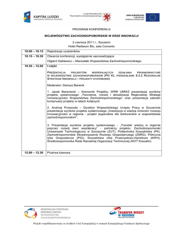 PROGRAM KONFERENCJI WOJEWÓDZTWO ZACHODNIOPOMORSKIE W ERZE INNOWACJI 2 czerwca 2011 r., Szczecin Hotel Radisson Blu, sala Concerto 10.00 – 10.15 Rejestracja uczestników 10.15 – 10.30 Otwarcie konferencji, wystąpienie wprowadzające Olgierd Geblewicz – Marszałek Województwa Zachodniopomorskiego. 10.30 – 12.00 I CZĘŚĆ PREZENTACJA PROJEKTÓW WSPIERAJĄCYCH DZIAŁANIA W WOJEWÓDZTWIE ZACHODNIOPOMORSKIM (PO KL PODDZIAŁANIE STRATEGIE INNOWACJI – PROJEKTY SYSTEMOWE) PROINNOWACYJNE 8.2.2 REGIONALNE Moderator: Dariusz Baranik 1. Jacek Baraniecki – Kierownik Projektu, WRR UMWZ prezentacja wyników projektu systemowego „Tworzenie, rozwój i aktualizacja Regionalnej Strategii Innowacyjności Województwa Zachodniopomorskiego” oraz prezentacja załoŜeń kontynuacji projektu w latach kolejnych. 2. Andrzej Przewoda – Dyrektor Wojewódzkiego Urzędu Pracy w Szczecinie prezentacja wyników projektu systemowego „Inwestycja w wiedzę motorem rozwoju innowacyjności w regionie - projekt stypendiów dla doktorantów w województwie zachodniopomorskim”. 3. Prezentacja wyników projektu systemowego - „Transfer wiedzy w regionie poprzez rozwój sieci współpracy” - partnerzy projektu: Zachodniopomorski Uniwersytet Technologiczny w Szczecinie (ZUT), Politechnika Koszalińska (PK), Zachodniopomorskie Stowarzyszenie Rozwoju Gospodarczego (ZSRG), Północna Izba Gospodarcza (PIG), Koszalińska Izba Przemysłowo-Handlowa (KIPH), Środkowopomorska Rada Naczelnej Organizacji Technicznej (NOT Koszalin). 12.00 – 12.30 Przerwa kawowa Projekt współfinansowany ze środków Unii Europejskiej w ramach Europejskiego Funduszu Społecznego II CZĘŚĆ POLITYKA INNOWACJI W NOWYM OKRESIE PROGRAMOWANIA Moderator: Dariusz Baranik 12.30 – 13.30 Panel 1 Rola uczelni wyŜszych w innowacyjnym rozwoju gospodarczym regionu Eksperci kluczowi dr Agnieszka Turyńska - Gmur – Kierownik Działu Transferu Technologii, Wrocławskie Centrum Transferu Technologii, Politechnika Wrocławska, Koordynator Sieci EEN na Polskę Zachodnią, Tomasz Cichocki – niezaleŜny ekspert i trener w zakresie zarządzania pracami badawczymi i komercjalizacji wyników prac naukowych, Przedstawiciele szkół wyŜszych: dr hab. prof. US Piotr Niedzielski – Dziekan Wydziału Zarządzania i Ekonomiki Usług, Uniwersytet Szczeciński, prof. dr hab. inŜ. Artur Bartkowiak – Dyrektor Centrum Bioimmobilizacji i Innowacyjnych Materiałów. Opakowaniowych, Zachodniopomorski Uniwersytet Technologiczny w Szczecinie, prof. dr hab. inŜ. Tomasz Heese – Politechnika Koszalińska. 13.30 – 13.45 Przerwa kawowa 13.45 – 15.00 Panel 2 Jakiego wsparcia oczekują zachodniopomorskie firmy od władz samorządowych? Uczestnicy: Jacek Baraniecki – Kierownik Projektów, Wydział Rozwoju Regionalnego, Urząd Marszałkowski Województwa Zachodniopomorskiego, Marcin Szmyt - Dyrektor Wydziału Zarządzania Regionalnym Programem Operacyjnym Województwa Zachodniopomorskiego, Urząd Marszałkowski Województwa Zachodniopomorskiego, Anna Kornacka – Prezes Zarządu Związku Pracodawców Pomorza Zachodniego Lewiatan, Przedstawiciele innowacyjnych firm regionu: Kemipol S.A., BTC Sp. z o.o., Grempco S.A. Dyskusja. Zakończenie konferencji. 15.00 Lunch – sala Vivaldi’s Projekt współfinansowany ze środków Unii Europejskiej w ramach Europejskiego Funduszu Społecznego