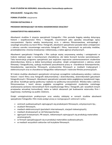 PLAN STUDIÓW NA KIERUNKU: dziennikarstwo i komunikacja społeczna SPECJALNOŚĆ: Fotografia i film FORMA STUDIÓW: stacjonarne POZIOM KSZTAŁCENIA: II PROGRAM OBOWIĄZUJĄCY OD ROKU AKADEMICKIEGO 2016/2017 CHARAKTERYSTYKA ABSOLWENTA Absolwent studiów II stopnia specjalność Fotografia i film posiada bogatą wiedzę dotyczącą historii i współczesności filmu i fotografii, rozumianych jako sposoby wizualnego opisu rzeczywistości. Oprócz wiedzy teoretycznej m.in. z zakresu filmoznawstwa, antropologii i socjologii wizualnej czy teorii filmu i fotografii, absolwent specjalności posiada także umiejętności z zakresu szeroko rozumianego warsztatu fotografii i filmu, tworzonych na potrzeby mediów, przedsiębiorstw z branży kreatywnej i reklamowej, a także agencji artystycznych. Absolwent specjalności Fotografia i film zyskuje wyżej zarysowaną wiedzę i umiejętności w trakcie realizacji zajęć o teoretycznym charakterze, ale także licznych kursów warsztatowych. Taka konstrukcja programu specjalności jest wyjściem naprzeciw zainteresowaniom studentów dziennikarstwa, którzy w dobie komunikacji wizualnej dzięki umiejętnościom z zakresu sztuki filmowej i fotograficznej, zyskują możliwość poszukiwania pracy w charakterze fotoreporterów, fotoedytorów, operatorów filmowych, producentów filmowych w mediach tradycyjnych i elektronicznych oraz w charakterze fotografów reklamowych i twórców filmów promocyjnych. W trakcie studiów absolwent specjalności otrzymuje szczególnie rozbudowaną wiedzę z zakresu historii i teorii filmu oraz fotografii dokumentalnej i dziennikarskiej, dziennikarskich gatunkach fotograficznych i filmowych. Absolwent specjalności posiada także pogłębioną świadomość tego, jak obraz kształtuje opinię społeczną i wpływa na społeczną rzeczywistość. Wiedza taka z zakresu filmoznawstwa i teorii obrazu pogłębia szczególnie umiejętności studentów rzetelnego analizowania zarówno różnorodnych form współczesnego filmu i fotografii, jak i wszelkich innych przejawów wizualnej komunikacji, także w takich obszarach jak budowanie wizerunku firm i organizacji, marketing czy public relations. Dzięki umiejętnościom praktycznym oraz wiedzy zdobytej w ramach studiów absolwent specjalności Fotografia i film może podjąć pracę w następujących sektorach rynku: • • • • • centrach audiowizualnych zajmujących się produkcjami filmowymi, artystycznymi itp.; studiach filmowych; mediach elektronicznych (portalach internetowych, stacjach telewizyjnych); mediach drukowanych w roli fotoreporterów; agencjach kreatywnych, PR-owych, reklamowych zajmujących się produkcją materiałów promocyjnych; • w firmach specjalizujących się w produkcji materiałów audiowizualnych; • w mediach wszystkich sektorów roli krytyków filmowych. PRZEDMIOTY OBOWIĄZKOWE Nr Nazwa przedmiotu Liczba godzin ECTS 1. Kultura współczesna 30 5 2. Wstęp do medioznawstwa 30 4 3. Pragmatyka języka 30 4 4. Filozofia współczesna 30 4 5. Media lokalne 30 4 6. Komunikowanie międzynarodowe i międzykulturowe 30 5 7. Metody badań medioznawczych 30 4 8. Prawne aspekty funkcjonowania mediów 15 3 9. Wstęp do filmoznawstwa 30 4 10. Warsztat fotografii 30 4 11. Socjologia wizualna 30 4 12. Techniki pracy operatora 30 3 13. Dyskursy mediów 30 3 14. Sztuka obrazu filmowego 30 3 15. 30 3 16. Grafika komputerowa w pracy z fotografią Fotografia użytkowa 30 4 17. Nowe media 30 6 18. Seminarium magisterskie 90 28 19. 30 6 20. Fotografia reportażowa i dokumentalna Język obcy 60 4 21. Wychowanie fizyczne 30 1 22. Przedsiębiorczość 15 1 Uwagi PRZEDMIOTY DO WYBORU: Nr Nazwa przedmiotu Liczba godzin ECTS 1. Warsztat krytyka filmowego 30 2 2. Przemysł filmowy w Polsce i na świecie 30 2 3. Animacja multimedialna 30 2 4. Język reklamy telewizyjnej 30 2 5. Polityka kulturalna i pozyskiwanie funduszy 30 2 Uwagi 6. Warsztat reklamy 30 2 7. Warsztat kreatywności 30 2 8. Mistrzowie kina 30 2 9. Powstawanie dzieła filmowego 30 2 10. Produkcja filmowa 30 2 11. Formy i gatunki scenariuszowe 30 2 12. Postprodukcja 30 2 13. Poetyka kina dokumentalnego 30 2 14. o Technika i technologia w fotografii 30 2 15. Zarządzanie barwą 30 2 16. Przestrzeń studyjna i praca w studio 30 2 17. Organizacja pracy na planie filmowym 30 2 18. Cyfrowa obróbka obrazów – warsztat 30 2 WARUNKI UKOŃCZENIA STUDIÓW I UZYSKANIA TYTUŁU DANEGO KIERUNKU/SPECJALNOŚCI/SPECJALIZACJI Pozytywna ocena z pracy dyplomowej oraz pozytywna ocena z egzaminu magisterskiego. Praca może mieć charakter projektu poprzedzonego wprowadzeniem teoretycznym. INNE WYMAGANIA Egzamin z języka obcego na poziomie biegłości B2+ Europejskiego Opisu Kształcenia Językowego Rady Europy PLAN STUDIÓW NA KIERUNKU: dziennikarstwo i komunikacja społeczna SPECJALNOŚĆ: Fotografia i film POZIOM: II ROK I I semestr Lp. Nazwa przedmiotu 1. 2. 3. 4. 5. 6. 7. 8. Razem O/F* Kultura współczesna Prawne aspekty funkcjonowania mediów Pragmatyka języka Filozofia współczesna Media lokalne Komunikowanie międzynarodowe i międzykulturowe Metody badań medioznawczych Język obcy II semestr Lp. Nazwa przedmiotu 1 2 3 4 5 6 7 8 Razem Wstęp do medioznawstwa Wstęp do filmoznawstwa Warsztat fotografii Socjologia wizualna Techniki pracy operatora Przedmiot opcyjny I Seminarium magisterskie Wychowanie fizyczne O O Forma zajęć** Wykład Wykład 30 15 5 4 E E O O O O ćwiczenia Ćwiczenia ćwiczenia ćwiczenia 30 30 30 30 4 4 4 5 Z/o Z/o Z/o Z/o O ćwiczenia 30 4 Z/o O ćwiczenia 60 255 0 O/F* Forma zajęć** Liczba godzin ECTS Forma zaliczenia Z 30 --------- O ćwiczenia Liczba godzin 30 ECTS 4 Forma zaliczenia Z/o O Ćwiczenia 30 4 Z/o O O O Ćwiczenia Ćwiczenia Warsztat 30 30 30 4 4 3 Z/o Z/o Z/o F O Ćwiczenia Seminarium 30 30 2 8 Z/o Z/o O Ćwiczenia 30 240 1 30 Z/o --------- II ROK III semestr Lp. Nazwa przedmiotu 1 2 3 4 5 6 Dyskursy mediów Seminarium magisterskie Sztuka obrazu filmowego Grafika komputerowa w 