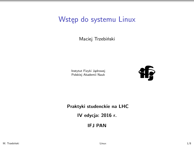 Wstęp do systemu Linux Maciej Trzebiński Instytut Fizyki Jądrowej Polskiej Akademii Nauk Praktyki studenckie na LHC IV edycja: 2016 r. IFJ PAN M. Trzebiński Linux 1/8 Uruchomienie terminala Jeżeli na komputerze zainstalowany jest system Linuks, należy go uruchomić. Po zalogowaniu należy otworzyć Terminal. Jeżeli nie posiadamy Linuksa, można go za darmo ściągnąć (polecana wersja: Ubuntu) i zainstalować. Krótka instrukcja jest dostępna tutaj: https://help.ubuntu.com/community/WindowsDualBoot W czasie trwania praktyk posiadanie systemu Linuks na własnym komputerze nie jest wymagane – będziemy pracować na systemie zainstalowanym w chmurze CC1 (http://cc1.ifj.edu.pl/pl/), która jest dostępna przez przeglądarkę internetową. Do wykonania ćwiczeń z tej prezentacji można posłużyć się jednym z emulatorów dostępnych online: http://bellard.org/jslinux/ http://www.masswerk.at/jsuix/ Więcej materiałów n/t podstaw obsługi systemu z poziomu terminala można znaleźć tutaj: http://linuxcommand.org/index.php http://www.arturpyszczuk.pl/terminal.html http://www.gabo.hi.pl/linux/polecenia.htm oraz na stronie praktyk. M. Trzebiński Linux 2/8 Cel: gdzie jestem? Wyświetlenie ścieżki do katalogu, w którym się teraz znajdujemy: $ pwd Wyświetlenie zawartości katalogu: $ ls Wyświetlenie zawartości katalogu z opcjami: $ ls -lh Znak zachęty $ W tej prezentacji $ symbolizuje tzw. znak zachęty (ang. command prompt) – wykorzystywany w wierszu poleceń znak lub sekwencja znaków wskazująca gotowość komputera do przyjmowania poleceń. Przykładowa postać: w systemie DOS: C:\> w systemie Uniks: user@host: ∼ $ M. Trzebiński Linux 3/8 Cel: operacje na katalogach Stworzenie katalogu: $ mkdir moj drugi katalog Wyświetlenie zawartości katalogu głównego: $ ls -lh Przejście do katalogu (proszę zwrócić uwagę, że zmienił się znak zachęty): $ cd moj drugi katalog Przejście do katalogu nadrzędnego: $ cd .. Zmiana nazwy katalogu: $ mv moj drugi katalog moj pierwszy katalog Wyświetlenie zawartości katalogu głównego: $ ls -lh Wyświetlenie zawartości katalogu moj pierwszy katalog: $ ls -lh moj pierwszy katalog Usunięcie katalogu: $ rm moj pierwszy katalog Nie wyszło? Katalogi z zawartością usuwamy z opcją ”-r” (recursive): $ rm -r moj pierwszy katalog M. Trzebiński Linux 4/8 Przycisk Tabulacji Po wciśnięciu przycisku tabulacji system podpowie listę możliwych opcji lub uzupełni komendę w przypadku, gdy jest ona jednoznaczna. Przykłady: w teminalu wpisać ”p” i dwukrotnie wcisnąć tabulację – wyświetli się lista komend na ”p” wpisać ”pw” i dwukrotnie wcisnąć tabulację – system uzupełni do ”pwd”, gdyż jest to jedyna komenda, która spełnia kryteria stworzyć katalog moj pierwszy katalog, przy przechodzeniu do niego wpisać ”cd mo” i dwukrotnie wcisnąć tabulację – system uzupełni resztę nazwy Posługiwanie się tabulacją jest bardzo wygodne i znacznie przyśpiesza pracę z terminalem! M. Trzebiński Linux 5/8 Cel: wyświetlanie i zapisanie informacji Wyświetlenie na ekranie napisu ”Witaj swiecie!”: $ echo ”Witaj swiecie!” Zapisanie napisu ”Witaj swiecie”w pliku tekstowym: $ echo ”Witaj swiecie!”> plik1.txt Wyświetlenie zawartości pliku ”plik1.txt”: $ cat plik1.txt $ less plik1.txt Dopisanie do pliku napisu ”Jestem studentem!”: $ echo ”Jestem studentem!”>> plik1.txt Wyświetlenie zawartości pliku ”plik1.txt”: $ cat plik1.txt Wynik: Witaj swiecie! Jestem studentem! M. Trzebiński Linux 6/8 Poniższe ćwiczenia są bardziej zaawansowane. Nie są wygodne do wykonania na emulatorze, ze względu na brak prostego edytora tekstu. Dla upartych jest to jednak możliwe, np. tworząc plik za pomocą dodawania kolejnych linijek komendą echo lub przy pomocy edytora vi (https://www.cs.colostate.edu/helpdocs/vi.html). Cel: stworzenie prostego skryptu w języku bash Utworzyć plik moj pierwszy skrypt.sh zawierający następującą treść: #!/bin/bash echo ”Dzien dobry” #to jest komentarz w jezyku bash, bo zaczyna sie od znaku ’#’ #utworzymy zmienne STR1=”Dzien” STR2=”dobry” #wyswietlimy napis przy uzyciu zmiennych echo $STR1 $STR2 Przejść do konsoli i nadać prawo wykonywalności: $ chmod +x moj pierwszy skrypt.sh Uruchomić skrypt: $ ./moj pierwszy skrypt.sh M. Trzebiński Linux 7/8 Zadania dodatkowe (dla chętnych i ambitnych) 1 Napisać skrypt, który: utworzy katalog cw2, wylistuje zawartość katalogu cw2, przejdzie do niego, utworzy plik tekstowy wynik1.txt zawierający imię oraz datę urodzenia (format dd/mm/rrrr), zmieni nazwę katalogu na cw1, wyświetli zawartość pliku wynik1.txt oraz pełną (bezwzględną) ścieżkę do niego. 2 3 Napisać skrypt, który wyświetli na ekran argument podany przez użytkownika. Napisać skrypt, który: w przypadku podania w argumencie cyfry utworzy katalog o nazwie kat PodanaCyfra, w przypadku podania pojedynczego znaku utworzy plik tekstowy plik PodanyZnak.txt zawierający napis ”witaj swiecie”, w przypadku podania ciągu znaków utworzy plik tekstowy plik.txt zawierający ten ciąg znaków. Napisać skrypt, który utworzy n katalogów o nazwie kat n. Każdy katalog ma zawierać m plików o nazwie plik m.txt. Każdy z plików ma zawierać k linijek: w pierwszej ma być jeden znak ’∗’, w drugiej ’∗∗’ itd. aż do k znaków ’∗’. Wartości n, m, k mają być podawane przez użytkownika jako argumenty. Warto posłużyć się www.google.pl. Wszystkie powyższe problemy są rozwiązywalne! 4 M. Trzebiński Linux 8/8