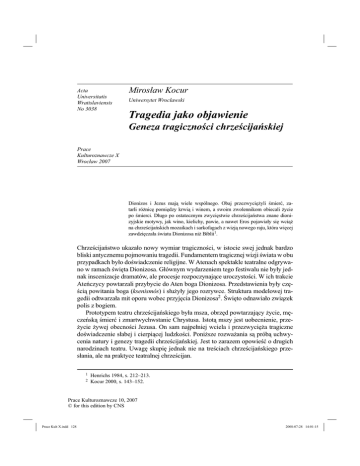 Acta Universitatis Wratislaviensis No 3038 Mirosław Kocur Uniwersytet Wrocławski Tragedia jako objawienie Geneza tragiczności chrześcijańskiej Prace Kulturoznawcze X Wrocław 2007 Dionizos i Jezus mają wiele wspólnego. Obaj przezwyciężyli śmierć, zatarli różnicę pomiędzy krwią i winem, a swoim zwolennikom obiecali życie po śmierci. Długo po ostatecznym zwycięstwie chrześcijaństwa znane dionizyjskie motywy, jak wino, kielichy, pawie, a nawet Eros pojawiały się wciąż na chrześcijańskich mozaikach i sarkofagach z wizją nowego raju, która więcej zawdzięczała światu Dionizosa niż Biblii1. Chrześcijaństwo ukazało nowy wymiar tragiczności, w istocie swej jednak bardzo bliski antycznemu pojmowaniu tragedii. Fundamentem tragicznej wizji świata w obu przypadkach było doświadczenie religijne. W Atenach spektakle teatralne odgrywano w ramach święta Dionizosa. Głównym wydarzeniem tego festiwalu nie były jednak inscenizacje dramatów, ale procesje rozpoczynające uroczystości. W ich trakcie Ateńczycy powtarzali przybycie do Aten boga Dionizosa. Przedstawienia były częścią powitania boga (ksenismós) i służyły jego rozrywce. Struktura modelowej tragedii odtwarzała mit oporu wobec przyjęcia Dionizosa2. Święto odnawiało związek polis z bogiem. Prototypem teatru chrześcijańskiego była msza, obrzęd powtarzający życie, męczeńską śmierć i zmartwychwstanie Chrystusa. Istotą mszy jest uobecnienie, przeżycie żywej obecności Jezusa. On sam najpełniej wciela i przezwycięża tragiczne doświadczenie słabej i cierpiącej ludzkości. Poniższe rozważania są próbą uchwycenia natury i genezy tragedii chrześcijańskiej. Jest to zarazem opowieść o drugich narodzinach teatru. Uwagę skupię jednak nie na treściach chrześcijańskiego przesłania, ale na praktyce teatralnej chrześcijan. 1 2 Henrichs 1984, s. 212–213. Kocur 2000, s. 143–152. Prace Kulturoznawcze 10, 2007 © for this edition by CNS Prace Kult X.indd 128 2008-07-28 14:01:15 129 Tragedia jako objawienie Rezygnuję zatem z teologicznych czy filozoficznych interpretacji tragiczności3. Tragedię rozumiem jako zespół praktyk artystycznych rozwiniętych z obrzędów towarzyszących składaniu żywej ofiary w ramach kultów fundatorów religii, Dionizosa i Jezusa. Święto Dionizosa w Atenach wywodzi się prawdopodobnie z pieśni rytualnych wykonywanych w trakcie zabijania kozła podczas ceremonii powitania boga. W późniejszym okresie na ołtarzu w Teatrze Dionizosa, widocznym z widowni, zabijano żywe zwierzęta przypuszczalnie także w czasie występu tragików. Śmierć ogniskowała fabułę wszystkich greckich tragedii. Ofiary, z kilkoma wyjątkami, były nie tylko zabijane czy mordowane, ale – zgodnie z „religijną retoryką tragedii” – były „zarzynane” lub „poświęcane”4. Tragedia grecka sakralizowała przemoc. W teatrze chrześcijańskim fundamentalnym wydarzeniem było misterium Męki Pańskiej na Krzyżu. Pierwszym twórcą tragedii chrześcijańskiej był sam Chrystus. Złota legenda zachowała świadectwo modelowego dramatu sakralnego w przypowieści o rzymskiej matronie szydzącej z Eucharystii w Bazylice św. Piotra. Oburzony jej zachowaniem św. Grzegorz, który celebrował mszę, umieścił Hostię na ołtarzu i począł się żarliwie modlić. Nagle Hostia przemieniła się w ciało Chrystusa. W wersji późniejszej, łączącej to zdarzenie z kościołem Santa Croce, Chrystus ukazał się otoczony „instrumentami Pasji” i pokazał stygmaty5. I. Wizja 1. Słowo „rewelacja” (po grecku apokálypsis) opisuje doświadczenie teatralne od strony widowni. Aby rewelacja mogła się wydarzyć, istnieć musi ktoś, kto chce coś objawić (przed-patrzącego-stawić), a także ów patrzący, czyli ten, kto może objawienie zobaczyć, a więc uznać je za realne i w efekcie u-obecnić. Aktor zamieszkuje świat dzieła sztuki, jego działania nabierają sensu jedynie wtedy, gdy na widowni znajdą się jacyś ludzie, którzy zgodzą się go oglądać. Taka zgoda to jednak coś więcej niż tylko statyczne przyzwolenie. Aby zobaczyć przed-stawiany świat dzieła sztuki, widz bowiem musi go uobecnić. Publiczność współtworzy widowisko teatralne, sprawiając, że to, co przedstawiane, staje się obecne tu i teraz. Sceptyczna rzymska matrona „współtworzyła” cudowne przemienienie Hostii w „widzialne” ciało Chrystusa. W podobny sposób Szaweł z Tarsu „współtworzył” wizję, która ob3 Temat ten wciąż wywołuje gorące spory. Za możliwością istnienia „chrześcijańskiej tragedii” opowiedzieli się m.in. W.H. Auden, R. Hazelton i N. Frye. Szwajcarski teolog Hans Urs von Balthasar (1905–1988) centralną metaforą swych refleksji uczynił theatrum mundi, twierdził też, że grecka tragedia zapowiada „tragedię Chrystusa” (por. Denny 2006). Inni – jak Georges Steiner czy Laurence Michel – dostrzegali w chrześcijaństwie „anty-tragiczną wizję świata”. Przeciw „chrześcijańskiej tragedii” najmocniej argumentowała Barbara Joan Hunt (1985). 4 Henrichs 2000, s. 174. 5 Hardison 1965, s. 35. Prace Kulturoznawcze 10, 2007 © for this edition by CNS Prace Kult X.indd 129 2008-07-28 14:01:15 130 Mirosław Kocur jawiła mu się w drodze do Damaszku, a doświadczenie to nie tylko określiło jego własną teologię, ale i ostatecznie zdefiniowało chrześcijaństwo. 2. Pierwszy pełny opis rewelacji6 znajduje się w dziewiątym rozdziale Dziejów Apostolskich i pochodzi od samego narratora, Łukasza: „Gdy zbliżał się już w swojej podróży do Damaszku, olśniła go nagle światłość z nieba. A gdy upadł na ziemię, usłyszał głos, który mówił: »Szawle, Szawle, dlaczego Mnie prześladujesz?« »Kto jesteś, Panie?« – powiedział. A On: »Ja jestem Jezus, którego ty prześladujesz. Wstań i wejdź do miasta, tam ci powiem, co masz czynić«”7. „Niebiańska wizja” była przeżyciem potę