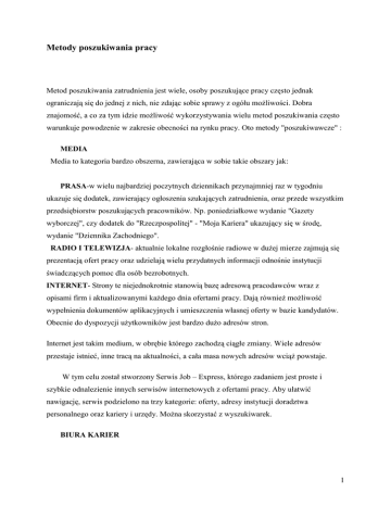 Metody poszukiwania pracy Metod poszukiwania zatrudnienia jest wiele, osoby poszukujące pracy często jednak ograniczają się do jednej z nich, nie zdając sobie sprawy z ogółu możliwości. Dobra znajomość, a co za tym idzie możliwość wykorzystywania wielu metod poszukiwania często warunkuje powodzenie w zakresie obecności na rynku pracy. Oto metody "poszukiwawcze" : MEDIA Media to kategoria bardzo obszerna, zawierająca w sobie takie obszary jak: PRASA-w wielu najbardziej poczytnych dziennikach przynajmniej raz w tygodniu ukazuje się dodatek, zawierający ogłoszenia szukających zatrudnienia, oraz przede wszystkim przedsiębiorstw poszukujących pracowników. Np. poniedziałkowe wydanie "Gazety wyborczej", czy dodatek do "Rzeczpospolitej" - "Moja Kariera" ukazujący się w środę, wydanie "Dziennika Zachodniego". RADIO I TELEWIZJA- aktualnie lokalne rozgłośnie radiowe w dużej mierze zajmują się prezentacją ofert pracy oraz udzielają wielu przydatnych informacji odnośnie instytucji świadczących pomoc dla osób bezrobotnych. INTERNET- Strony te niejednokrotnie stanowią bazę adresową pracodawców wraz z opisami firm i aktualizowanymi każdego dnia ofertami pracy. Dają również możliwość wypełnienia dokumentów aplikacyjnych i umieszczenia własnej oferty w bazie kandydatów. Obecnie do dyspozycji użytkowników jest bardzo dużo adresów stron. Internet jest takim medium, w obrębie którego zachodzą ciągłe zmiany. Wiele adresów przestaje istnieć, inne tracą na aktualności, a cała masa nowych adresów wciąż powstaje. W tym celu został stworzony Serwis Job – Express, którego zadaniem jest proste i szybkie odnalezienie innych serwisów internetowych z ofertami pracy. Aby ułatwić nawigację, serwis podzielono na trzy kategorie: oferty, adresy instytucji doradztwa personalnego oraz kariery i urzędy. Można skorzystać z wyszukiwarek. BIURA KARIER 1 Misją Ogólnopolskiej Sieci Biur Karier jest "służyć informacją, radą i pomocą uczniom i absolwentom szkół średnich, studentom i absolwentom wyższych uczelni w skutecznym przejściu z okresu nauki do etapu poszukiwania zatrudnienia, a następnie porażającym funkcjonowaniu na współczesnym rynku pracy". URZĘDY PRACY Są to instytucje państwowe znajdujące się we wszystkich miastach powiatowych naszego kraju. W zakresie Powiatowych Urzędów Pracy jest: pośrednictwo pracy, poradnictwo zawodowe, szkolenia, pożyczki, prace interwencyjne, roboty publiczne oraz czynne uczestnictwo w programach specjalnych. Urząd Pracy naszego powiatu mieści się w Będzinie przy ul.1-go Maja 2( naprzeciw Dworca PKP Będzin Miasto). ZNAJOMI Obecnie to najskuteczniejsza z metod poszukiwania pracy, dlatego też osoby poszukujące zatrudnienia w pierwszej kolejności powinny o tym fakcie poinformować swoich znajomych. Szanse ich wzrosną, bowiem "poczta pantoflowa" to najskuteczniejsza z możliwych dróg przepływu informacji w naszym kraju. BEZPOŚREDNIE WIZYTY W FIRMACH I WYSYŁANIE DO NICH SWOICH APLIKACJI Metoda ta należy do niezwykle czasochłonnych i kosztownych, ale prawdą jest że wiele informacji o wolnych miejscach pracy nigdy nie pojawia się w ogłoszeniach prasowych czy urzędach pracy. Dlatego też poszukując zatrudnienia należy wykazać się nieco większą inicjatywą. FIRMY DORADZTWA ZAWODOWEGO Obecnie na rynku pracy wkroczyło wiele firm zajmujących się w imieniu pracodawcy zamieszczaniem ofert pracy, a następnie doborem kandydatów i przeprowadzaniem rozmów kwalifikacyjnych. Należałoby wspomnieć, że osoby poszukujące pracy nie ponoszą żadnych opłat, całość kosztów spoczywa na barkach pracodawcy!!! AGENCJE PRACY TYMCZASOWEJ 2 Działają one bardzo podobnie jak firmy doradztwa personalnego, jedyna różnica polega na tym, że oferty pracy są tymczasowe lub sezonowe. Często z tego rodzaju pośrednictwa korzystają uczniowie szkół średnich, studenci. WŁASNE OGŁOSZENIA Ta metoda nie należy do najskuteczniejszych, jednak może ona okazać się efektywna w przypadku zamieszczania ogłoszeń w fachowych czasopismach poświęconych konkretnej branży. OCHOTNICZE HUFCE PRACY Są państwową jednostką wyspecjalizowaną w działaniach na rzecz młodzieży do 25 lat. Realizują zadania państwa w zakresie zatrudnienia oraz przeciwdziałania marginalizacji i wykluczeniu społecznemu młodzieży, a także zadania w zakresie jej kształcenia i wychowania. Tworzą sieć poradnictwa zawodowego i informacji zawodowej poprzez powołanie do życia Mobilnych Centrów Informacji Zawodowej i Młodzieżowych Centrów Kariery, a także oddziałów Młodzieżowych Biur Pracy. A oto adresy siedzib MBP działających w naszym rejonie : • Młodzieżowe Biuro Pracy w Katowicach Plac Grunwaldzki 8 - 10 tel./ fax 032/209 08 59 , e – mail [email protected] • Młodzieżowe Biuro Pracy -Filia Radzionków ul. Kużaja 19, tel. 032/289- 08 - 03 ; e – mail [email protected] • Młodzieżowe Biuro Pracy - Filia Dąbrowa Górnicza ul. Jana III Sobieskiego 12 tel. 032/262 02 93; • e – mail [email protected] Młodzieżowe Biuro pracy- Filia Sosnowiec ul. Rzeźnicza 12 tel. 032/ 297 23 74 wew. 108 e – mail [email protected] 3 • Młodzieżowe Biuro pracy- Filia Siemianowice Śląskie ul. Św. Barbary 2b tel. 032/ 765 – 95- 40 • e – mail [email protected] Młodzieżowe Biuro pracy- Filia Tarnowskie Góry ul. Towarowa 1 tel. 032/ 768- 34- 39 e – mail [email protected] MOBILNE CENTRA INFORMACJI ZAWODOWEJ (MCIZ) Jest to nowoczesna sieć oferująca wysoką jakość informacji i poradnictwa zawodowego oparta na zintegrowanej sieci 49 jednostek działających na terenie całego kraju. MCIZ świadczą usługi w formie stacjonarnej i mobilnej. Doradcy zawodowi docierają do młodzieży specjalnie oznakowanymi busami, wyposażonymi w nowoczesny sprzęt multimedialny i zasoby informacyjne. Służą pomocą młodzieży w podejmowaniu ważnych decyzji edukacyjnych i zawodowych. MŁODZIEŻOW