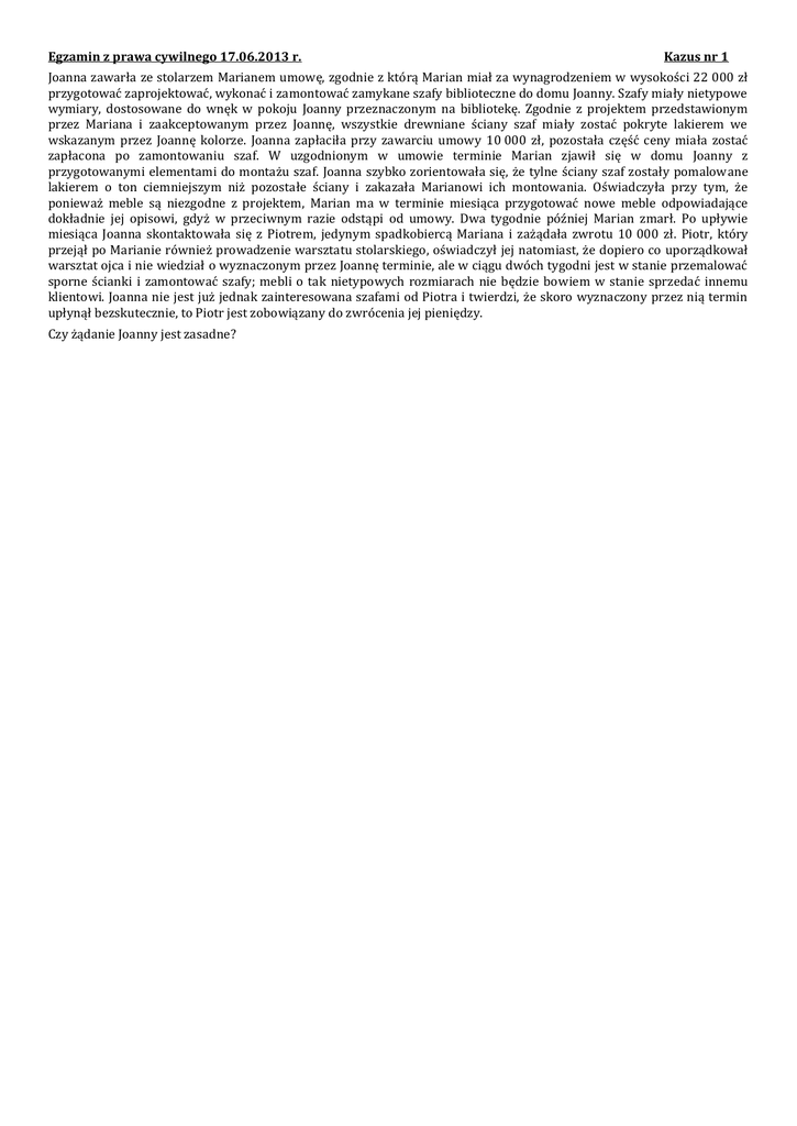 Egzamin z prawa cywilnego 17.06.2013 r. Kazus nr 1 Joanna zawarła ze stolarzem Marianem umowę, zgodnie z którą Marian miał za wynagrodzeniem w wysokości 22 000 zł przygotować zaprojektować, wykonać i zamontować zamykane szafy biblioteczne do domu Joanny. Szafy miały nietypowe wymiary, dostosowane do wnęk w pokoju Joanny przeznaczonym na bibliotekę. Zgodnie z projektem przedstawionym przez Mariana i zaakceptowanym przez Joannę, wszystkie drewniane ściany szaf miały zostać pokryte lakierem we wskazanym przez Joannę kolorze. Joanna zapłaciła przy zawarciu umowy 10 000 zł, pozostała część ceny miała zostać zapłacona po zamontowaniu szaf. W uzgodnionym w umowie terminie Marian zjawił się w domu Joanny z przygotowanymi elementami do montażu szaf. Joanna szybko zorientowała się, że tylne ściany szaf zostały pomalowane lakierem o ton ciemniejszym niż pozostałe ściany i zakazała Marianowi ich montowania. Oświadczyła przy tym, że ponieważ meble są niezgodne z projektem, Marian ma w terminie miesiąca przygotować nowe meble odpowiadające dokładnie jej opisowi, gdyż w przeciwnym razie odstąpi od umowy. Dwa tygodnie później Marian zmarł. Po upływie miesiąca Joanna skontaktowała się z Piotrem, jedynym spadkobiercą Mariana i zażądała zwrotu 10 000 zł. Piotr, który przejął po Marianie również prowadzenie warsztatu stolarskiego, oświadczył jej natomiast, że dopiero co uporządkował warsztat ojca i nie wiedział o wyznaczonym przez Joannę terminie, ale w ciągu dwóch tygodni jest w stanie przemalować sporne ścianki i zamontować szafy; mebli o tak nietypowych rozmiarach nie będzie bowiem w stanie sprzedać innemu klientowi. Joanna nie jest już jednak zainteresowana szafami od Piotra i twierdzi, że skoro wyznaczony przez nią termin upłynął bezskutecznie, to Piotr jest zobowiązany do zwrócenia jej pieniędzy. Czy żądanie Joanny jest zasadne? Egzamin z prawa cywilnego 17.06.2013 r. Kazus nr 2 Dwóch wspólników, Andrzej i Janusz prowadziło, na podstawie umowy spółki cywilnej pod nazwą „Autohandel s. c.” komis samochodowy. W widocznym miejscu w budynku, w którym prowadzili działalność znajdowała się wywieszka: „Autohandel s.c. nie odpowiada za wady prawne i ukryte pojazdów”. W dniu 5.7.2009 r. Władysław zakupił w tym komisie używany samochód dostawczy, na potrzeby prowadzonego przez siebie sklepu zoologicznego. Dnia 12.8.2012 r. Władysław uległ wypadkowi, wskutek zderzenia z samochodem, stanowiącym własność Filipa, ale udostępnionym z grzeczności Anieli, która ten samochód prowadziła w momencie wypadku. Do wypadku doszło wskutek tego, że 10-letni Krzyś wyskoczył niespodziewanie za piłką na jezdnię. W tym czasie matka Krzysia stała obok na chodniku i rozmawiała z sąsiadką, nie zwracając uwagi na to, co robi jej syn. Aniela próbowała zahamować, jednak nie zdążyła ukończyć tego manewru, potrąciła Krzysia, oraz zderzyła się z jadącym z naprzeciwka autem Władysława, które po tym zderzeniu nadawało się tylko do kasacji. W czasie dochodzenia policyjnego okazało się, że auto Władysława było kradzione. Władysław wręczył Andrzejowi 10.9.2012 r. pisemne oświadczenie o odstąpieniu od umowy sprzedaży samochodu, z powołaniem się na okoliczność, że auto było kradzione. Jednocześnie Władysław zażądał od Andrzeja i Janusza zwrotu zapłaconej ceny. Umowa spółki Autohandel została rozwiązana 31.12.2011 r. i po tej dacie komis prowadzi jednoosobowo Andrzej. 1. Czy Filip i Aniela, ponoszą odpowiedzialność za szkodę wyrządzoną Krzysiowi? Na jakiej zasadzie opiera się ich odpowiedzialność? 2. Czy odstąpienie od umowy sprzedaży było skuteczne? Jakie znaczenie ma wywieszka znajdująca się w komisie? 3. Gdyby odstąpienie od umowy sprzedaży było skuteczne, kto i w jaki sposób będzie zobowiązany do zwrotu ceny? Odpowiedzi na pytanie 3. proszę udzielić niezależnie od odpowiedzi za pytanie 2 (a więc także w przypadku uznania bezskuteczności odstąpienia). Każdą odpowiedź proszę uzasadnić, poprzez wskazanie podstawy prawnej.