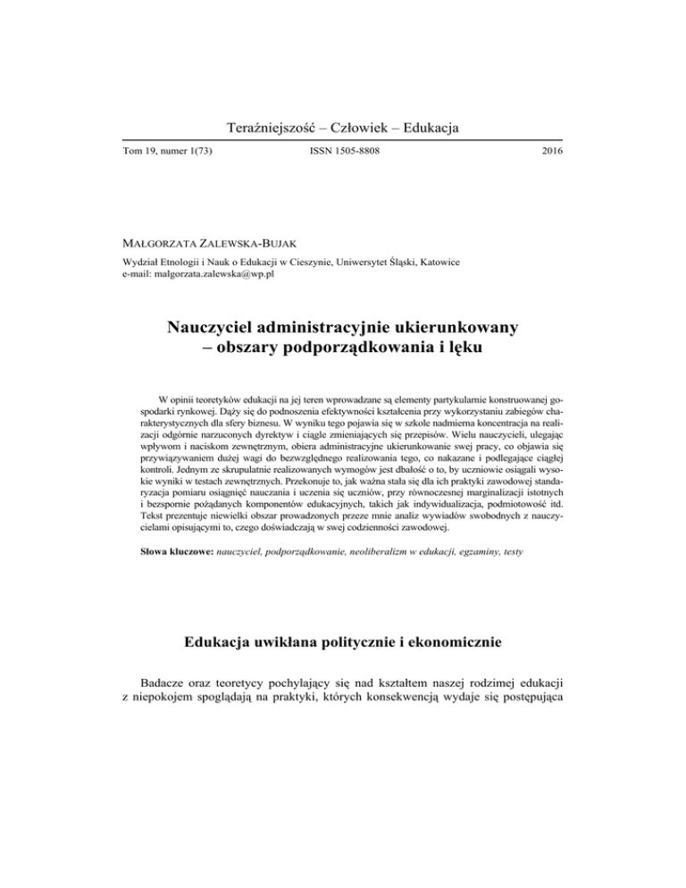 Teraźniejszość – Człowiek – Edukacja Tom 19, numer 1(73) ISSN 1505-8808 2016 MAŁGORZATA ZALEWSKA-BUJAK Wydział Etnologii i Nauk o Edukacji w Cieszynie, Uniwersytet Śląski, Katowice e-mail: [email protected] Nauczyciel administracyjnie ukierunkowany – obszary podporządkowania i lęku W opinii teoretyków edukacji na jej teren wprowadzane są elementy partykularnie konstruowanej gospodarki rynkowej. Dąży się do podnoszenia efektywności kształcenia przy wykorzystaniu zabiegów charakterystycznych dla sfery biznesu. W wyniku tego pojawia się w szkole nadmierna koncentracja na realizacji odgórnie narzuconych dyrektyw i ciągle zmieniających się przepisów. Wielu nauczycieli, ulegając wpływom i naciskom zewnętrznym, obiera administracyjne ukierunkowanie swej pracy, co objawia się przywiązywaniem dużej wagi do bezwzględnego realizowania tego, co nakazane i podlegające ciągłej kontroli. Jednym ze skrupulatnie realizowanych wymogów jest dbałość o to, by uczniowie osiągali wysokie wyniki w testach zewnętrznych. Przekonuje to, jak ważna stała się dla ich praktyki zawodowej standaryzacja pomiaru osiągnięć nauczania i uczenia się uczniów, przy równoczesnej marginalizacji istotnych i bezspornie pożądanych komponentów edukacyjnych, takich jak indywidualizacja, podmiotowość itd. Tekst prezentuje niewielki obszar prowadzonych przeze mnie analiz wywiadów swobodnych z nauczycielami opisującymi to, czego doświadczają w swej codzienności zawodowej. Słowa kluczowe: nauczyciel, podporządkowanie, neoliberalizm w edukacji, egzaminy, testy Edukacja uwikłana politycznie i ekonomicznie Badacze oraz teoretycy pochylający się nad kształtem naszej rodzimej edukacji z niepokojem spoglądają na praktyki, których konsekwencją wydaje się postępująca 102 Małgorzata ZALEWSKA-BUJAK dehumanizacja polskiej szkoły. Istota tychże praktyk związana jest z przemycaniem racjonalności ekonomicznej na grunt edukacji. Owa racjonalność nakazuje asymilowanie ze sfery komercyjnej do edukacji praktyk związanych z dążeniem do obniżania nakładów z równoczesnym podnoszeniem jakości uzyskiwanych rezultatów. Kierowanie się nią sprowadza instytucje edukacyjne do rangi przedsiębiorstw usługowych, w których prymat wiodą reguły myślenia i zarządzania charakterystyczne dla sfer biznesowych, dających przyzwolenie spoglądania na człowieka jedynie przez pryzmat kapitału (Szkudlarek 2001, s. 182). Ma to swoje konsekwencje dla wszystkich podmiotów edukacyjnych, a szczególnie brzemiennie wpływa na losy uczniów i praktyki zawodowe nauczycieli, którzy – zdaniem B. Śliwerskiego – stają się grupą ulegającą zniewoleniu (Śliwerski 2010, s. 77). Poddawani odgórnym naciskom, ciągłej inwigilacji (podważającej ich kompetencje, autorytet i świadczącej o braku zaufania) i manipulacji rezygnują z bycia niezależnym „reżyserem” sytuacji dydaktyczno-wychowawczych w szkole. Tym samym wyzbywają się własnej podmiotowości zawodowej i skupiają się na wdrażaniu odgórnych ustaleń oraz realizacji wskazywanych założeń. Podporządkowują swą działalność standardom, które ustala się poza edukacją i które są związane z ideologią rynkowego (ekonomicznego, nie pedagogicznego) liberalizmu (Szkudlarek 2001, s. 168) czy też neoliberalizmu – dominującej ideologii globalnego kapitału, polityczno-ekonomicznego paradygmatu, swoistej „monokultury” (Potulicka 2010, s. 39). Wpasowując się w te standardy, nauczyciele stają się wykonawcami usług edukacyjnych, podczas gdy uczniowie i ich rodzice konsumentami na rynku edukacyjnym (Śliwerski 2003, s. 334–335). Wszystko to przebiega na gruncie utrzymującego się niezmiennie statusu szkoły jako instytucji traktowanej w sposób instrumentalny, (...) jako środek dla realizowanych interesów przez inne podmioty życia społecznego, indywidualnego i funkcjonowania naszego państwa (Śliwerski 2015). Ideologia neoliberalna wniosła w rzeczywistość szkolną „standardy” nauczania mające przyczynić się do podniesienia jakości kształcenia i pozwolić na zobiektywizowane ocenianie rezultatów osiąganych przez uczniów. Narzędziem do tego mają być standaryzowane testy, umożliwiające porównywanie osiągnięć pojedynczych szkół i okręgów szkolnych. Wprowadzona została więc praktyka nasilonej kontroli i rozliczania szkół z pominięciem toczącego się dyskursu edukacyjnego oraz ignorowaniem pedagogicznych kosztów standaryzacji, co należy wiązać zarówno z wywieranym bezpośrednim wpływem na procesy nauczania i uczenia się, jak i z pomijaniem głosów profesjonalnych ekspertów oraz marginalizowaniem kwestii etycznych w edukacji (Potulicka 2010, s. 177–183). Szkolnictwo traci możliwości demokratycznego zarządzania, a praktyki nauczycielskie odsłaniają motywację przetrwania i uległości wobec struktur władzy. Nauczyciele ustępują naciskom ekonomicznym i nie udaje się im unikać takich zagrożeń jak nadmierne koncentrowanie się na parametryzacji jakości pracy szkoły i efektów kształcenia, bezrefleksyjne zabieganie o osiąganie wskazanych efektów nauczania itd. Prowadzone przez B. Zamorską badania pokazują, że obrane przez nauczycieli sposoby radzenia sobie z problemami szkolnymi niejedno- Nauczyciel administracyjnie ukierunkowany – obszary podporządkowania i lęku 103 krotnie powielają wzór bycia sprawnym urzędnikiem i wiążą się z ograniczaniem swojej roli do ram instytucjonalnych (Zamorska 2008, s. 155–157). Niektórzy spośród nich absorbują przekonanie, że egzaminy zewnętrzne mogą stać się instrumentem podnoszenia efektywności procesu kształcenia. Tymczasem, jak zauważają przyglądający się szkole badacze, pełnią one głównie funkcję selektywną, wspieraną specyficzną racjonalnością ekonomiczną, narzucającą przeświadczenie o tym, że status społeczny jednostki uzależniony jest od jej udokumentowanych o
