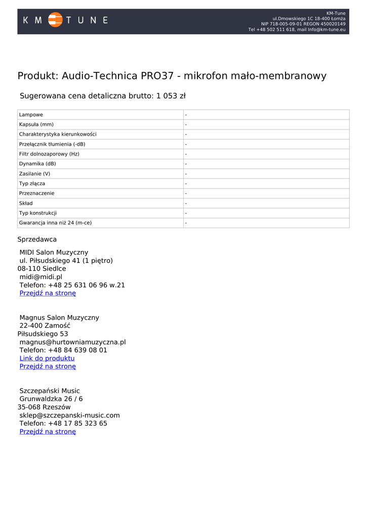 KM-Tune ul.Dmowskiego 1C 18-400 Łomża NIP 718-005-09-01 REGON 450020149 Tel +48 502 511 618, mail [email protected] Produkt: Audio-Technica PRO37 - mikrofon mało-membranowy Sugerowana cena detaliczna brutto: 1 053 zł Lampowe - Kapsuła (mm) - Charakterystyka kierunkowości - Przełącznik tłumienia (-dB) - Filtr dolnozaporowy (Hz) - Dynamika (dB) - Zasilanie (V) - Typ złącza - Przeznaczenie - Skład - Typ konstrukcji - Gwarancja inna niż 24 (m-ce) - o Sprzedawca MIDI Salon Muzyczny ul. Piłsudskiego 41 (1 piętro) 08-110 Siedlce [email protected] Telefon: +48 25 631 06 96 w.21 Przejdź na stronę Magnus Salon Muzyczny 22-400 Zamość Piłsudskiego 53 [email protected] Telefon: +48 84 639 08 01 Link do produktu Przejdź na stronę Szczepański Music Grunwaldzka 26 / 6 35-068 Rzeszów [email protected] Telefon: +48 17 85 323 65 Przejdź na stronę Powered by TCPDF (www.tcpdf.org)