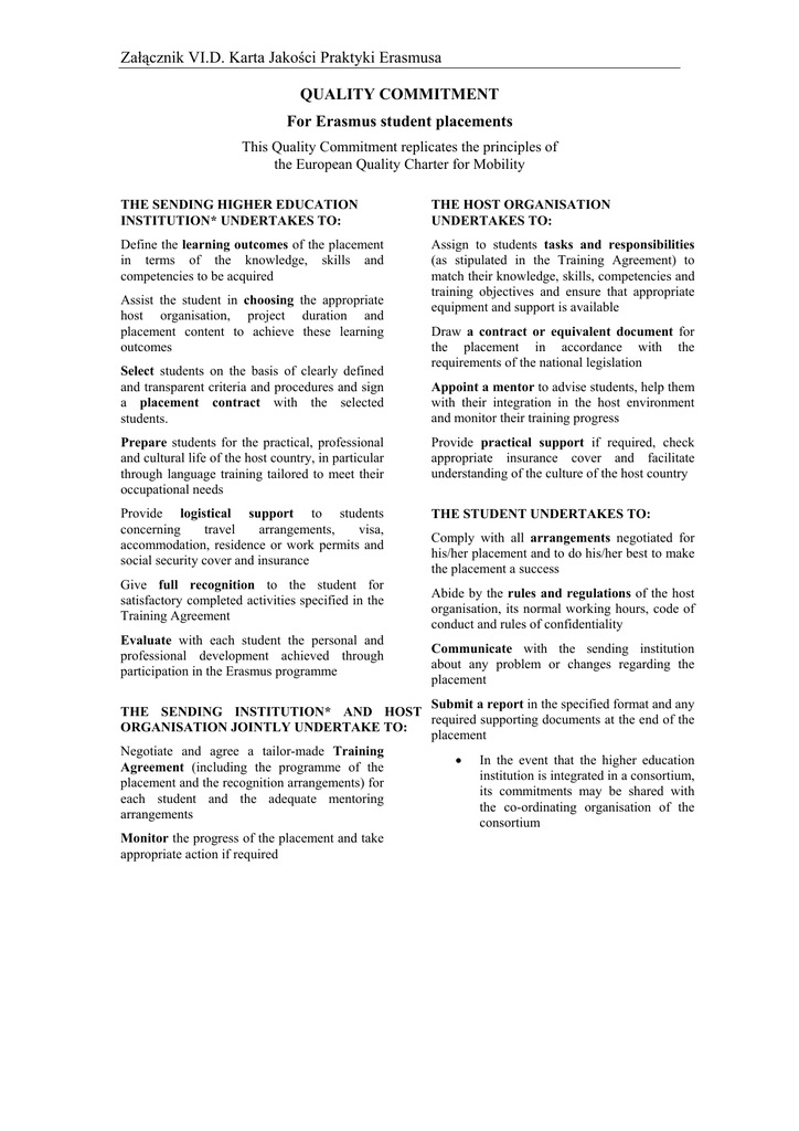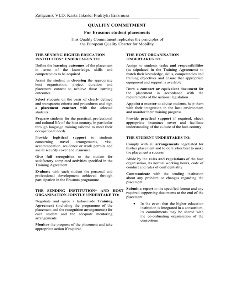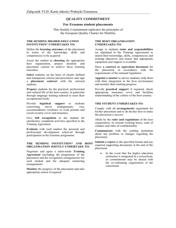 Załącznik VI.D. Karta Jakości Praktyki Erasmusa QUALITY COMMITMENT For Erasmus student placements This Quality Commitment replicates the principles of the European Quality Charter for Mobility THE SENDING HIGHER EDUCATION INSTITUTION* UNDERTAKES TO: THE HOST ORGANISATION UNDERTAKES TO: Define the learning outcomes of the placement in terms of the knowledge, skills and competencies to be acquired Assign to students tasks and responsibilities (as stipulated in the Training Agreement) to match their knowledge, skills, competencies and training objectives and ensure that appropriate equipment and support is available Assist the student in choosing the appropriate host organisation, project duration and placement content to achieve these learning outcomes Select students on the basis of clearly defined and transparent criteria and procedures and sign a placement contract with the selected students. Draw a contract or equivalent document for the placement in accordance with the requirements of the national legislation Appoint a mentor to advise students, help them with their integration in the host environment and monitor their training progress Prepare students for the practical, professional and cultural life of the host country, in particular through language training tailored to meet their occupational needs Provide practical support if required, check appropriate insurance cover and facilitate understanding of the culture of the host country Provide logistical support to students concerning travel arrangements, visa, accommodation, residence or work permits and social security cover and insurance THE STUDENT UNDERTAKES TO: Give full recognition to the student for satisfactory completed activities specified in the Training Agreement Evaluate with each student the personal and professional development achieved through participation in the Erasmus programme Comply with all arrangements negotiated for his/her placement and to do his/her best to make the placement a success Abide by the rules and regulations of the host organisation, its normal working hours, code of conduct and rules of confidentiality Communicate with the sending institution about any problem or changes regarding the placement Submit a report in the specified format and any THE SENDING INSTITUTION* AND HOST required supporting documents at the end of the ORGANISATION JOINTLY UNDERTAKE TO: placement Negotiate and agree a tailor-made Training • In the event that the higher education Agreement (including the programme of the institution is integrated in a consortium, placement and the recognition arrangements) for its commitments may be shared with each student and the adequate mentoring the co-ordinating organisation of the arrangements consortium Monitor the progress of the placement and take appropriate action if required Załącznik VI.D. Karta Jakości Praktyki Erasmusa KARTA JAKOŚCI PRAKTYKI ERASMUSA Niniejsza Karta Jakości odzwierciedla założenia Europejskiej Karty na rzecz Jakości Mobilności INSTYTUCJA WYSYŁAJĄCA BĘDĄCA INSTYTUCJĄ SZKOLNICTWA WYŻSZEGO* ZOBOWIĄZUJE SIĘ: Określić oczekiwane efekty praktyki w kategoriach wiedzy, umiejętności i kwalifikacji, jakie mają nabyć studenci. Pomóc studentom w wyborze odpowiedniej instytucji przyjmującej, programu praktyki oraz jej czasu trwania, ażeby umożliwić studentowi osiągnięcie tych rezultatów. Wybrać studentów na podstawie przejrzystych, jasno określonych kryteriów i procedur oraz podpisać umowę na realizację wyjazdu w celu odbycia praktyki z wybranymi studentami. Przygotować studentów do życia zawodowego i kulturalnego, a także do warunków życia codziennego panujących w kraju goszczącym, przede wszystkim poprzez szkolenie językowe ukierunkowane na ich potrzeby zawodowe. Zapewnić studentom wsparcie logistyczne w odniesieniu do podróży, zakwaterowania, kwestii związanych z uzyskaniem wizy/ pozwolenia na pobyt lub pracę, ubezpieczenia społecznego oraz innego typu ubezpieczenia. W pełni uznać praktykę zrealizowaną w zadawalającym stopniu przez studenta, zgodnie z „Porozumieniem o programie praktyki”. Dokonać - wraz z każdym studentem - oceny jego rozwoju osobistego i zawodowego, jaki miał miejsce dzięki uczestnictwu w programie Erasmus. INSTYTUCJA WYSYŁAJĄCA* I INSTYTUCJA PRZYJMUJĄCA WSPÓLNIE ZOBOWIĄZUJĄ SIĘ: Wynegocjować i podpisać „Porozumienie o programie praktyki” dostosowane do indywidualnych potrzeb studenta (uwzględniające program praktyki i warunki uznania) oraz poczynić odpowiednie ustalenia dotyczące opieki mentora (indywidualnego doradcy/opiekuna). Monitorować postępy studenta podczas praktyki oraz podjąć odpowiednie działania, o ile zajdzie taka potrzeba. INSTYTUCJA PRZYJMUJĄCA ZOBOWIĄZUJE SIĘ: Przydzielić studentom zadania i obowiązki (jak wyszczególniono w „Porozumieniu o programie praktyki”) odpowiadające ich wiedzy, umiejętnościom, kwalifikacjom oraz celom szkolenia, a także zapewnić im dostęp do odpowiedniego wyposażenia i materiałów. Sporządzić umowę lub równorzędny dokument dot. praktyki zgodnie z wymogami prawa krajowego. Wyznaczyć mentora (opiekuna), odpowiedzialnego za doradzanie studentom, pomoc w integrowaniu się ze środowiskiem lokalnym oraz śledzenie ich postępów w procesie szkoleniowym. Zapewnić wsparcie praktyczne, o ile zajdzie taka potrzeba, sprawdzać czy studenci posiadają odpowiednie polisy ubezpieczeniowe oraz ułatwiać im zrozumienie kultury kraju goszczącego. STUDENT ZOBOWIĄZUJE SIĘ: Przestrzegać wszystkich ustaleń wynegocjowanych w związku z daną praktyką i dołożyć wszelkich starań, aby pomyślnie ukończyć praktykę. Stosować się do zasad i przepisów instytucji przyjmującej, obowiązujących w niej godzin pracy, kodeksu postępowania oraz zasad zachowania poufności. Kontaktować się z instytucją wysyłającą w przypadku wszelkich problemów lub zmian dotyczących praktyki. Po zakończeniu praktyki 