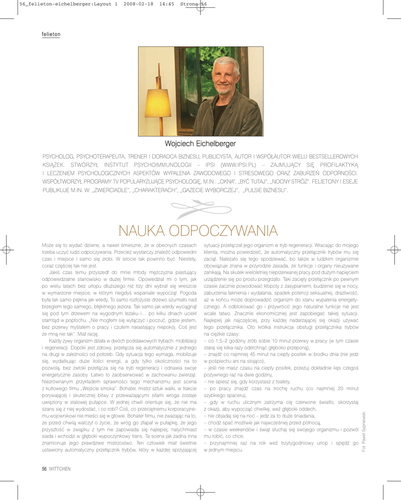 56_felieton-eichelberger:Layout 1 2008-02-18 14:45 Strona 56 felieton Wojciech Eichelberger PSYCHOLOG, PSYCHOTERAPEUTA, TRENER I DORADCA BIZNESU, PUBLICYSTA, AUTOR I WSPÓŁAUTOR WIELU BESTSELLEROWYCH KSIĄŻEK. STWORZYŁ INSTYTUT PSYCHOIMMUNOLOGII – IPSI (WWW.IPSI.PL) – ZAJMUJĄCY SIĘ PROFILAKTYKĄ I LECZENIEM PSYCHOLOGICZNYCH ASPEKTÓW WYPALENIA ZAWODOWEGO I STRESOWEGO ORAZ ZABURZEŃ ODPORNOŚCI. WSPÓŁTWORZYŁ PROGRAMY TV POPULARYZUJĄCE PSYCHOLOGIĘ, M.IN.: „OKNA”, „BYĆ TUTAJ”, „NOCNY STRÓŻ”. FELIETONY I ESEJE PUBLIKUJE M.IN. W: „ZWIERCIADLE”, „CHARAKTERACH”, „GAZECIE WYBORCZEJ”, „PULSIE BIZNESU”. Może się to wydać dziwne, a nawet śmieszne, że w obecnych czasach trzeba uczyć ludzi odpoczywania. Przecież wystarczy znaleźć odpowiedni czas i miejsce i samo się zrobi. W istocie tak powinno być. Niestety, coraz częściej tak nie jest. Jakiś czas temu przyszedł do mnie młody mężczyzna piastujący odpowiedzialne stanowisko w dużej firmie. Opowiedział mi o tym, jak po wielu latach bez urlopu dłuższego niż trzy dni wybrał się wreszcie w wymarzone miejsce, w którym niegdyś wspaniale wypoczął. Pogoda była tak samo piękna jak wtedy. To samo rozłożyste drzewo szumiało nad brzegiem tego samego, błękitnego jeziora. Tak samo jak wtedy wyciągnął się pod tym drzewem na wygodnym leżaku i… po kilku dniach uciekł stamtąd w popłochu. „Nie mogłem się wyłączyć i poczuć, gdzie jestem, bez przerwy myślałem o pracy i czułem narastający niepokój. Coś jest ze mną nie tak”. Miał rację. Każdy żywy organizm działa w dwóch podstawowych trybach: mobilizacji i regeneracji. Dopóki jest zdrowy, przełącza się automatycznie z jednego na drugi w zależności od potrzeb. Gdy sytuacja tego wymaga, mobilizuje się, wydatkując duże ilości energii, a gdy tylko okoliczności na to pozwolą, bez zwłoki przełącza się na tryb regeneracji i odnawia swoje energetyczne zasoby. Łatwo to zaobserwować w zachowaniu zwierząt. Niezrównanym przykładem sprawności tego mechanizmu jest scena z kultowego filmu „Wejście smoka”. Bohater, mistrz sztuk walki, w trakcie porywającej i skutecznej bitwy z przeważającymi siłami wroga zostaje uwięziony w stalowej pułapce. W jednej chwili orientuje się, że nie ma szans się z niej wydostać, i co robi? Coś, co przeciętnemu korporacyjnemu wojownikowi nie mieści się w głowie. Bohater filmu, nie zważając na to, że przed chwilą walczył o życie, że wróg go złapał w pułapkę, że jego przyszłość w związku z tym nie zapowiada się najlepiej, natychmiast siada i wchodzi w głęboki wypoczynkowy trans. Ta scena jak żadna inna znamionuje jego prawdziwe mistrzostwo. Ten człowiek miał świetnie ustawiony automatyczny przełącznik trybów, który w każdej sprzyjającej 56 WITTCHEN sytuacji przełączał jego organizm w tryb regeneracji. Wracając do mojego klienta, można powiedzieć, że automatyczny przełącznik trybów mu się zaciął. Należało się tego spodziewać, bo także w ludzkim organizmie obowiązuje znana w przyrodzie zasada, że funkcje i organy nieużywane zanikają. Na skutek wieloletniej nieprzerwanej pracy pod dużym napięciem urządzenie się po prostu przegrzało. Taki zacięty przełącznik po pewnym czasie zacznie powodować kłopoty z zasypianiem, budzenie się w nocy, zaburzenia łaknienia i wydalania, spadek potencji seksualnej, drażliwość, aż w końcu może doprowadzić organizm do stanu wypalenia energetycznego. A odblokować go i przywrócić jego naturalne funkcje nie jest wcale łatwo. Znacznie ekonomiczniej jest zapobiegać takiej sytuacji. Najlepiej jak najczęściej, przy każdej nadarzającej się okazji używać tego przełącznika. Oto krótka instrukcja obsługi przełącznika trybów na ciężkie czasy: – co 1,5–2 godziny zrób sobie 10 minut przerwy w pracy (w tym czasie staraj się kilka razy odetchnąć głęboko przeponą), – znajdź co najmniej 45 minut na ciepły posiłek w środku dnia (nie jedz w pośpiechu ani na stojąco), – jeśli nie masz czasu na ciepły posiłek, przeżuj dokładnie kęs czegoś pożywnego raz na dwie godziny, – nie spiesz się, gdy korzystasz z toalety, – po pracy znajdź czas na trochę ruchu (co najmniej 20 minut szybkiego spaceru), – gdy w ruchu ulicznym zatrzyma cię czerwone światło, skorzystaj z okazji, aby wypocząć chwilkę, weź głęboki oddech, – nie objadaj się na noc – jedz za to duże śniadania, – chodź spać możliwie jak najwcześniej przed północą, – w czasie weekendów i świąt słuchaj się swojego organizmu i pozwól mu robić, co chce, – przynajmniej raz na rok weź trzytygodniowy urlop i spędź go w jednym miejscu. Fot. Paweł Sypniewski NAUKA ODPOCZYWANIA