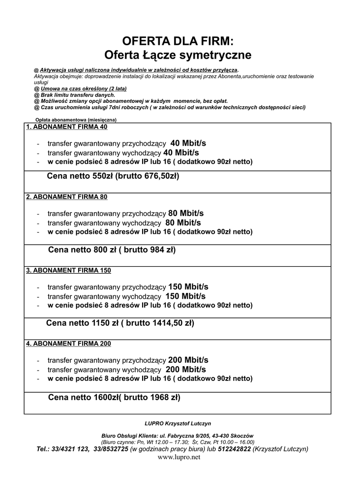 OFERTA DLA FIRM: Oferta Łącze symetryczne @ Aktywacja usługi naliczona indywidualnie w zależności od kosztów przyłącza. Aktywacja obejmuje: doprowadzenie instalacji do lokalizacji wskazanej przez Abonenta,uruchomienie oraz testowanie usługi @ Umowa na czas określony (2 lata) @ Brak limitu transferu danych. @ Możliwość zmiany opcji abonamentowej w każdym momencie, bez opłat. @ Czas uruchomienia usługi 7dni roboczych ( w zależności od warunków technicznych dostępności sieci) Opłata abonamentowa (miesięczna) 1. ABONAMENT FIRMA 40 - transfer gwarantowany przychodzący 40 Mbit/s transfer gwarantowany wychodzący 40 Mbit/s w cenie podsieć 8 adresów IP lub 16 ( dodatkowo 90zł netto) Cena netto 550zł (brutto 676,50zł) 2. ABONAMENT FIRMA 80 - transfer gwarantowany przychodzący 80 Mbit/s transfer gwarantowany wychodzący 80 Mbit/s w cenie podsieć 8 adresów IP lub 16 ( dodatkowo 90zł netto) Cena netto 800 zł ( brutto 984 zł) 3. ABONAMENT FIRMA 150 - transfer gwarantowany przychodzący 150 Mbit/s transfer gwarantowany wychodzący 150 Mbit/s w cenie podsieć 8 adresów IP lub 16 ( dodatkowo 90zł netto) Cena netto 1150 zł ( brutto 1414,50 zł) 4. ABONAMENT FIRMA 200 - transfer gwarantowany przychodzący 200 Mbit/s transfer gwarantowany wychodzący 200 Mbit/s w cenie podsieć 8 adresów IP lub 16 ( dodatkowo 90zł netto) Cena netto 1600zł( brutto 1968 zł) LUPRO Krzysztof Lutczyn Biuro Obsługi Klienta: ul. Fabryczna 9/205, 43-430 Skoczów (Biuro czynne: Pn, Wt 12.00 – 17.30; Śr, Czw, Pt 10.00 – 16.00) Tel.: 33/4321 123, 33/8532725 (w godzinach pracy biura) lub 512242822 (Krzysztof Lutczyn) www.lupro.net