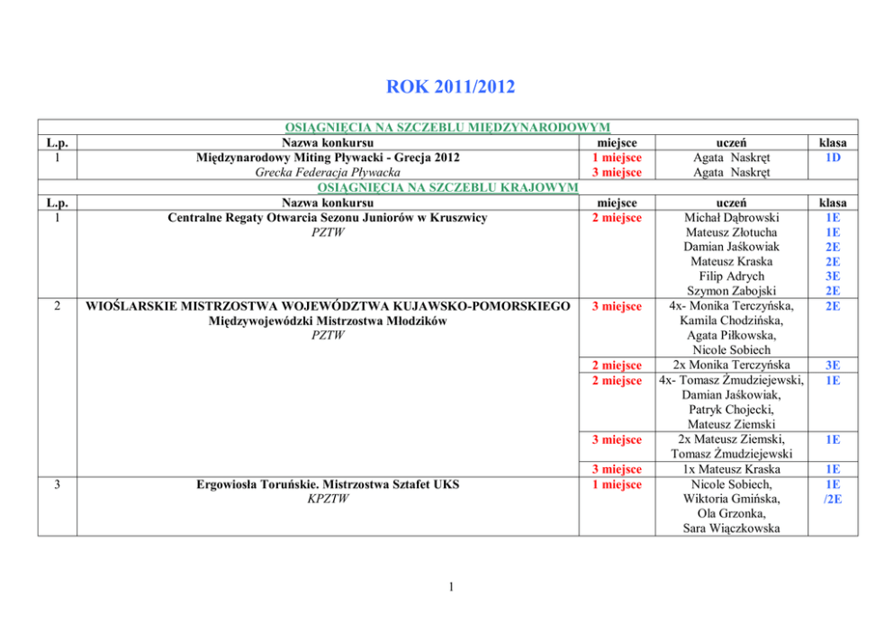 ROK 2011/2012 L.p. 1 L.p. 1 2 OSIĄGNIĘCIA NA SZCZEBLU MIĘDZYNARODOWYM Nazwa konkursu miejsce Międzynarodowy Miting Pływacki - Grecja 2012 1 miejsce Grecka Federacja Pływacka 3 miejsce OSIĄGNIĘCIA NA SZCZEBLU KRAJOWYM Nazwa konkursu miejsce Centralne Regaty Otwarcia Sezonu Juniorów w Kruszwicy 2 miejsce PZTW WIOŚLARSKIE MISTRZOSTWA WOJEWÓDZTWA KUJAWSKO-POMORSKIEGO Międzywojewódzki Mistrzostwa Młodzików PZTW 3 miejsce 2 miejsce 2 miejsce 3 miejsce 3 Ergowiosła Toruńskie. Mistrzostwa Sztafet UKS KPZTW 1 3 miejsce 1 miejsce uczeń Agata Naskręt Agata Naskręt klasa 1D uczeń Michał Dąbrowski Mateusz Złotucha Damian Jaśkowiak Mateusz Kraska Filip Adrych Szymon Zabojski 4x- Monika Terczyńska, Kamila Chodzińska, Agata Piłkowska, Nicole Sobiech 2x Monika Terczyńska 4x- Tomasz Żmudziejewski, Damian Jaśkowiak, Patryk Chojecki, Mateusz Ziemski 2x Mateusz Ziemski, Tomasz Żmudziejewski 1x Mateusz Kraska Nicole Sobiech, Wiktoria Gmińska, Ola Grzonka, Sara Wiączkowska klasa 1E 1E 2E 2E 3E 2E 2E 3E 1E 1E 1E 1E /2E 3 miejsce 4 Mistrzostwa Miasta Bydgoszczy na Ergometrze Wioślarskim KPZTW 5 Centralne Regaty Otwarcia Sezonu Juniorów w Kruszwicy PZTW 13 miejsce 6 miejsce 11 miejsce 11 miejsce 2 miejsce 2 miejsce 5 i 6 miejsce 6 IX Ogólnopolski Festiwal Tańca Nowoczesnego TAN 2012 MDK 1 miejsce Radoskiewicz Julia, Kapuścinska Sara, Torzecka Sylwia, Kamila Chodzińska Wiktoria Gmińska, Ola Grzonka Kamila Chodzińska Michał Dąbrowski, Mateusz Złotucha Damian Jaśkowiak, Mateusz Kraska, Filip Adrych, st. Szymon Zabojski 4x+ Wiączkowska Sara, Sylwia Torzecka, Wiktoria Szyman, Marlena Czekalska Anna Skowrońska 1E /2E Nicole Pietryga 2D 2E 1E 1E 2E 1E 2E, 3E 1E 1D 2 miejsce – formacje 3 miejsce – duet 3 miejsce Anna Skowrońska 1D Nicole Pietryga 7 VII Ogólnopolski Turniej Taneczny Turniej Tańca Nowoczesnego SOLO_DUET UM. Bydgoszcz 8 Ogólnopolski Turniej Tańca Nowoczesnego WCK Włocławek 5 miejsce Anna Skowrońska 1D 9 III Ogólnopolski Turniej Tańca NOK Nakło n. Notecią 2 miejsce Anna Skowrońska 1D 2 10 Ogólnopolski Turniej Tańca Nowoczesnego TranssFormacje WCK Włocławek 2 miejsce 3 miejsce Anna Skowrońska Anna Skowrońska 1D Nicole Pietryga Nicole Pietryga 2D 2D 11 VII Ogólnopolski Turniej Tańca Nowoczesnego Bydgoskie Rytmy 2012 3 miejsce – formacje 2 miejsce formacje 12 III Ogólnopolski Turniej Tańca Nowoczesnego - Nakielska Karuzela pamięci Kamili Bombe 1 miejsce – formacje Nicole Pietryga 2D 13 Techniczne Mistrzostwa Polski w Taekwondo Olimpijskim Polski Związek Taekwondo Olimpijskim 1 miejsce indywid. oraz w parze Natan Orzechowski 1C 14 Propagandowe Regaty z okazji Dni Grudziądza 1 miejsce 4+ Karol Klinger, Filip Adrych, Mateusz Kraska, Tomasz Żmudziejewski, st. Szymon Zabojski 2- Tomasz Żmudziejewski, Mateusz Kraska 4x+ Sebastian Szalaty, Dawid Kowalski, Mateusz Złotucha, Oskar Buszkiewicz 4+ Damian Jaśkowiak Patryk Chojecki, Filip Adrych Karol Klinger st.Szymon Zabojski 2E, 3E 2 miejsce 3 miejsce 3 miejsce 3 2E 1E 2E, 3E 2 miejsce 3 miejsce 1 miejsce 2 miejsce 2 miejsce 3 miejsce L.p. 1 2 3 4 5 6 7 OSIĄGNIECIA NA SZCZEBLU WOJEWÓDZTWA Nazwa konkursu miejsce Przegląd piosenki żołnierskiej i patriotycznej wyróżnienie Gminny Ośrodek Kultury w Mroczy (przygotowanie: p. mgr A Murawska z MDK-u nr 2) Olimpiada myśli Jana Pawła II wyróżnienie Kuratorium w Białymstoku 2- Tomasz Żmudziejewski, Mateusz Kraska 1x Wojciech Szala 2x Kamila Chodzińska 2x Kamila Chodzińska 4x+ Sylwia Torzecka, Ola Grzonka, Wiktoria Gmińska, Wiktoria Szyman 4x+ Wiktoria Gmińska, Wiktoria Szyman, Sylwia Torzecka, Ola Grzonka 2E uczeń Mateusz Szymanowski Ewelina Pik Jagoda Misztal Katarzyna Nowak Klaudia Zielińska Anna Cieśniewska Adam Rzęski Partycja Szczechowiak klasa 3C 2D 3D 3D 3B 2D 2D 3D 1D 1D 1D 2B 1D 1D Konkurs literacki: szkoła jaką pamiętam Pedagogiczna Biblioteka Wojewódzka i Muzeum Oświaty Festiwal artystyczny Gim-Art Kategoria literatura Zespół Szkół nr16 (G-29) Wojewódzka Gimnazjada w pływaniu dziewcząt-drużynowo WSZS, n-le wych. fiz. 1 miejsce 2 miejsce wyróżnienie Wojewódzka Gimnazjada w pływaniu dziewcząt-indywidualnie WSZS, n-le wych. fiz. Drużynowa Wojewódzka Gimnazjada w szachach 1 miejsce Agata Kasprowicz Agata Naskręt Sara Marciniak Paulina Brzycka Agata Naskręt wyróżnienie Anna Skowrońska 4 wyróżnienie 4 miejsce drużyny 3E 2E 2E 1E 1E 8 9 10 11 WSZS, n-le wych. fiz. Gdyby Wyczółkowski żył dzisiaj- konkurs grafiki komputerowej Zespół Szkół Mechanicznych nr 1 XI Festiwal Artystyczny Gimnazjów Województwa Kujawsko-Pomorskiego "Gim-Art” Zespół Szkół nr 16 (Gimnazjum nr 29) XIII Wojewódzki Konkurs Kolęd i Pastorałek MDK nr 2 Mistrzostwa Sztafet UKS w wioślarstwie halowym dziewcząt wojewódzki wyróżnienie Zofia Płachta 1D Nagroda główna w kategorii teatr- Złoty Grawerto Remigiusz Stachowicz Marcin Sakwiński Andrzej Mańko Łukasz Piórkowski Jagoda Misztal Kamil Mroczkowski Nicole Pietryga Ewelina Pik Adam Rzęski Sandra Wojtkowiak Martyna Laskowska Zofia Płachta Mateusz Szymanowski 3A 3A 3B 3B 3D 3D 2D 2D 2D 2D 1D 1D 3C Wiktoria Gmińska Aleksandra Grzonka Sara Wiączkowska JuliaRadoskiewicz Sylwia Torzecka 1E 1E 1E 1E 1E uczeń Tomasz Bloch klasa 2D Remigiusz Stachowicz Marcin Sakwiński Andrzej Mańko 3A 3A 3B wyróżnienie 1 miejsce 3 miejsce L.p. 1 2 OSIĄGNIECIA NA SZCZEBLU REGIONALNYM Nazwa konkursu miejsce III powiatowy Artystyczno- Literacko-Historyczny konkurs Młodego przyjaciela Srebrna Bydgoszczy odznaka Pałac Młodzieży i Towarzystwo Miłośników Miasta Bydgoszczy MMB XI regionalny przegląd piosenek i teatrzyków o tematyce ekologicznej Nagroda Stowarzyszenie Kujawsko-Pomorskie Centrum Edukacji Ekologicznej w Bydgoszczy specjalna Kabaret:Ale 5 jaja 3 Projekt Matematyka innego wymiaru - MATEMATYCZNE MISTRZOSTWA POLSKI firma ELITMAT szkolny opiekun Iwona Zbyszyńska 1 miejsce 2 miejsce 3 miejsce dotyczy powiatu 2 miejsce 4 Konkurs Gazetek Szkolnych KP CEN 5 