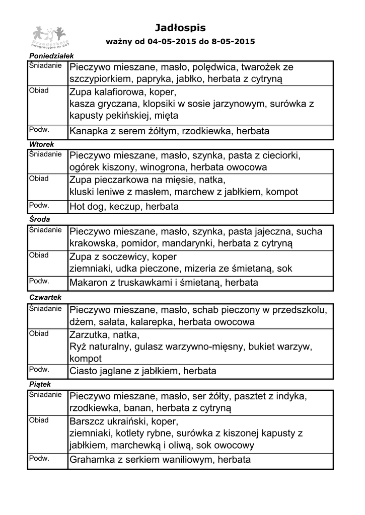 Jadłospis ważny od 04-05-2015 do 8-05-2015 Poniedziałek Śniadanie Pieczywo Obiad mieszane, masło, polędwica, twarożek ze szczypiorkiem, papryka, jabłko, herbata z cytryną Zupa kalafiorowa, koper, kasza gryczana, klopsiki w sosie jarzynowym, surówka z kapusty pekińskiej, mięta Podw. Kanapka z serem żółtym, rzodkiewka, herbata Wtorek Śniadanie Obiad Podw. Środa Śniadanie Obiad Podw. Pieczywo mieszane, masło, szynka, pasta z cieciorki, ogórek kiszony, winogrona, herbata owocowa Zupa pieczarkowa na mięsie, natka, kluski leniwe z masłem, marchew z jabłkiem, kompot Hot dog, keczup, herbata Pieczywo mieszane, masło, szynka, pasta jajeczna, sucha krakowska, pomidor, mandarynki, herbata z cytryną Zupa z soczewicy, koper ziemniaki, udka pieczone, mizeria ze śmietaną, sok Makaron z truskawkami i śmietaną, herbata Czwartek Śniadanie Obiad Podw. Piątek Śniadanie Obiad Podw. Pieczywo mieszane, masło, schab pieczony w przedszkolu, dżem, sałata, kalarepka, herbata owocowa Zarzutka, natka, Ryż naturalny, gulasz warzywno-mięsny, bukiet warzyw, kompot Ciasto jaglane z jabłkiem, herbata Pieczywo mieszane, masło, ser żółty, pasztet z indyka, rzodkiewka, banan, herbata z cytryną Barszcz ukraiński, koper, ziemniaki, kotlety rybne, surówka z kiszonej kapusty z jabłkiem, marchewką i oliwą, sok owocowy Grahamka z serkiem waniliowym, herbata