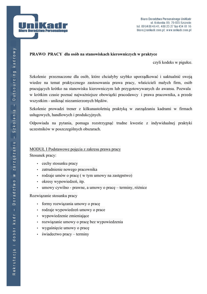 PRAWO PRACY dla osób na stanowiskach kierowniczych w praktyce czyli kodeks w pigułce. Szkolenie przeznaczone dla osób, które chciałyby szybko uporządkować i uaktualnić swoją wiedze na temat praktycznego zastosowania prawa pracy, właścicieli małych firm, osób pracujących krótko na stanowisku kierowniczym lub przygotowywanych do awansu. Pozwala w krótkim czasie poznać najważniejsze obowiązki pracodawcy i prawa pracownika, a przede wszystkim - uniknąć niezamierzonych błędów. Szkolenie prowadzi trener z kilkunastoletnią praktyką w zarządzaniu kadrami w firmach usługowych, handlowych i produkcyjnych. Odpowiada na pytania, pomaga rozstrzygnąć trudne kwestie z indywidualnej praktyki uczestników w poszczególnych obszarach. MODUŁ I Podstawowe pojęcia z zakresu prawa pracy Stosunek pracy: • • • • • cechy stosunku pracy zatrudnienie nowego pracownika rodzaje umów o pracę ( w tym umowy na zastępstwo) okresy wypowiedzeń, itp. umowy cywilno - prawne, a umowy o pracę – terminy, różnice Rozwiązanie stosunku pracy • • • • • • formy rozwiązania umowy o pracę rodzaje wypowiedzeń umowy o prace wypowiedzenie zmieniające rozwiązanie umowy o pracę bez wypowiedzenia wygaśnięcie umowy o pracę świadectwo pracy – terminy MODUŁ II Czas pracy: • • • • • • • • • • • podstawowe definicje czasu pracy normy czasu pracy okresy odpoczynku – dobowy, tygodniowy, przerwa wliczana do czasu pracy. systemy i rozkłady czasu pracy okresy rozliczeniowe analiza podstaw prawnych ustalania wymiaru czasu pracy zatrudnienie w trakcie okresu rozliczeniowego rozkład czasu pracy a harmonogram pracy, przykłady harmonogramów czasu pracy, rozkłady czasu pracy – praktyczne wskazówki i rady, zmiana harmonogramu czasu pracy – konsekwencje przerwy nie wliczane do czasu pracy Praca w godzinach nadliczbowych: • • • • • • • • • • dopuszczalność racy w godzinach nadliczbowych dodatkowe wynagrodzenie za pracę w godzinach nadliczbowych czas wolny za pracę w godzinach nadliczbowych obowiązek udzielenia dnia wolnego praca w godzinach nadliczbowych w nocy – wynagrodzenie, odpoczynek polecenie pracy w godzinach nadliczbowych odmowa pracy w godzinach nadliczbowych godziny nadliczbowych dobowe, tygodniowe oraz wynikające z okresu rozliczeniowego granice polecania pracy w godzinach nadliczbowych w ujęciu rocznym, miesięcznym, tygodniowym i dobowym, czas wolny czy wypłata wynagrodzenia za godziny nadliczbowe Praca w niedziele i święta: • wynagrodzenie za pracę w niedziele i święta Urlopy wypoczynkowe i okolicznościowe: • • • • • • • • prawo do pierwszego urlopu, prawo do kolejnego urlopu, wymiar urlopu, plany urlopowe dysponent urlopu urlop zaległy urlop na żądanie urlopy okolicznościowe – podstawy prawne rodzaje i dokumentacja Uprawnienia pracowników związane z rodzicielstwem: • • • • • • zatrudnienie kobiet w ciąży urlopy macierzyńskie urlopy wychowawcze urlop macierzyński, a urlop wypoczynkowy powrót do pracy po urlopie macierzyńskim powrót do pracy po urlopie wychowawczym MODUŁ III Odpowiedzialność porządkowa pracowników: • • • • rodzaje kar porządkowych katalog kar tryb stosowania kar porządkowych zatarcie kary Podróże służbowe: • • • podstawowe definicje dotyczące podróży służbowych podróże służbowe, a czas pracy podróże służbowe, a szkolenia pracowników wewnętrzne i zewnętrzne Naruszenie przepisów prawa pracy przez pracodawcę: • • odpowiedzialność za naruszenie przepisów sankcje za nieprzestrzeganie przepisów prawa pracy. MODUŁ IV Sesja pytań i odpowiedzi „PRAKTYCY DLA PRAKTYKÓW” Podsumowanie