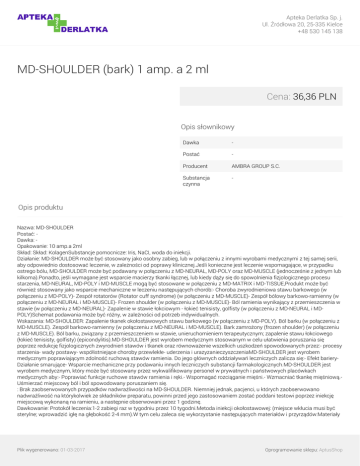 Apteka Derlatka Sp. j. Ul. Źródłowa 20, 25-335 Kielce +48 530 145 138 MD-SHOULDER (bark) 1 amp. a 2 ml Cena: 36,36 PLN Opis słownikowy Dawka - Postać - Producent AMBRA GROUP S.C. Substancja czynna - Opis produktu Nazwa: MD-SHOULDER Postać: Dawka: Opakowanie: 10 amp.a 2ml Skład: Skład: KolagenSubstancje pomocnicze: Iris, NaCI, woda do iniekcji. Działanie: MD-SHOULDER może być stosowany jako osobny zabieg, lub w połączeniu z innymi wyrobami medycznymi z tej samej serii, aby odpowiednio dostosować leczenie, w zależności od poprawy klinicznej.Jeśli konieczne jest leczenie wspomagające, w przypadku ostrego bólu, MD-SHOULDER może być podawany w połączeniu z MD-NEURAL, MD-POLY oraz MD-MUSCLE (jednocześnie z jednym lub kilkoma).Ponadto, jeśli wymagane jest wsparcie macierzy tkanki łącznej, lub kiedy dąży się do spowolnienia fizjologicznego procesu starzenia, MD-NEURAL, MD-POLY i MD-MUSCLE mogą być stosowane w połączeniu z MD-MATRIX i MD-TISSUE,Produkt może być również stosowany jako wsparcie mechaniczne w leczeniu następujących chorób:- Choroba zwyrodnieniowa stawu barkowego (w połączeniu z MD-POLY)- Zespół rotatorów (Rotator cuff syndrome) (w połączeniu z MD-MUSCLE)- Zespół bólowy barkowo-ramienny (w połączeniu z MD-NEURAL i MD-MUSCLE)- Frozen shoulder (w połączeniu z MD-MUSCLE)- Ból ramienia wynikający z przemieszczenia w stawie (w połączeniu z MD-NEURAL)- Zapalenie w stawie łokciowym - łokieć tenisisty, golfisty (w połączeniu z MD-NEURAL i MDPOLY)Schemat podawania może być różny, w zależności od potrzeb indywidualnych. Wskazania: MD-SHOULDER: Zapalenie tkanek okołostawowych stawu barkowego (w połączeniu z MD-POLY). Ból barku (w połączeniu z MD-MUSCLE). Zespół barkowo-ramienny (w połączeniu z MD-NEURAL i MD-MUSCLE). Bark zamrożony (frozen shoulder) (w połączeniu z MD-MUSCLE). Ból barku, związany z przemieszczeniem w stawie, unieruchomieniem terapeutycznym; zapalenie stawu łokciowego (łokieć tenisisty, golfisty) (epicondylitis).MD-SHOULDER jest wyrobem medycznym stosowanym w celu ułatwienia poruszania się poprzez redukcję fizjologicznych zwyrodnień stawów i tkanek oraz równoważenie wszelkich uszkodzeń spowodowanych przez:- procesy starzenia- wady postawy- współistniejące choroby przewlekłe- uderzenia i urazyzanieczyszczeniaMD-SHOULDER jest wyrobem medycznym poprawiającym zdolność ruchową stawów ramienia. Do jego głównych oddziaływań leczniczych zalicza się:- Efekt barieryDziałanie smarujące- Wsparcie mechaniczne przy podawaniu innych leczniczych substancji farmakologicznych.MD-SHOULDER jest wyrobem medycznym, który może być stosowany przez wykwalifikowany personel w prywatnych i państwowych placówkach medycznych aby:- Poprawiać funkcje ruchowe stawów ramienia i ręki.- Wspomagać rozciąganie mięśni.- Wzmacniać tkankę mięśniową.Uśmierzać miejscowy ból i ból spowodowany poruszaniem się. : Brak zaobserwowanych przypadków nadwrażliwości na MD-SHOULDER. Niemniej jednak, pacjenci, u których zaobserwowano nadwrażliwość na którykolwiek ze składników preparatu, powinni przed jego zastosowaniem zostać poddani testowi poprzez iniekcję miejscową wykonaną na ramieniu, a następnie obserwowani przez 1 godzinę. Dawkowanie: Protokół leczenia:1-2 zabiegi raz w tygodniu przez 10 tygodni.Metoda iniekcji okołostawowej: (miejsce wkłucia musi być sterylne; wprowadzić igłę na głębokość 2-4 mm).W tym celu zaleca się wykorzystanie następujących materiałów i przyrządów:Materiały Plik wygenerowano: 01-03-2017 Oprogramowanie sklepu: AptusShop Apteka Derlatka Sp. j. Ul. Źródłowa 20, 25-335 Kielce +48 530 145 138 do aseptycznego przygotowania powierzchni skóry: sterylne rękawiczki, roztwór jodyny, roztwór alkoholu, sterylne gaziki, chlorek etylu w sprayu do skóryIgły: sterylne 27 GStrzykawki: rozmiar 5 lub 10 cc, w zależności od objętości roztworu do wstrzyknięciaMetoda iniekcji dostawowej:W tym celu zaleca się wykorzystanie następujących materiałów i przyrządów:Materiały do aseptycznego przygotowania powierzchni skóry: sterylne rękawiczki, roztwór jodyny, roztwór alkoholu, sterylne gaziki, chlorek etylu w sprayu do skóry (Zaleca się zastosowanie znieczulenia miejscowego na skórze w okolicy wykonywania zabiegu.)Igły: sterylne 22 GStrzykawki: rozmiar 5 lub 10 cc, w zależności od objętości roztworu do wstrzyknięcia Ramię – Iniekcja dostawowa - dojście przednieDojście przednie. Jeśli pacjent ułoży rękę na udzie i rozluźni mięśnie ramienia, można wyczuć staw ramienny umieszczając palce pomiędzy wyrostkiem kruczym a głową ramienną. Jeśli ramię zostanie obrócone do środka, można wyczuć jak głowa ramienna przesuwa się do środka, a obszar ścięgna będzie we wgłębieniu dokładnie poprzecznie do wyrostka kruczego. Igła 22 G może zostać wprowadzona poprzecznie do wyrostka kruczego. Wprowadzić igłę w obszar ścięgna. Ramię – Iniekcja dostawowa - dojście tylneDojście tylne. Tylną część stawu ramiennego możemy zlokalizować prosząc pacjenta o obrócenie ramienia. Pozycja ta może być uzyskana poprzez umieszczenie dłoni pacjenta na przeciwnym ramieniu. Głowę ramienną można wtedy wyczuć umieszczając palec na tylnej części ramienia wzdłuż wyrostka barkowego łopatki podczas obracania ramieniem. Igła 22 G może zostać wprowadzona około 1 cm poniżej górnej krawędzi wyrostka barkowego łopatki i powinna być skierowana w górę i przyśrodkowo. Środki ostrożności: Ból ramienia wymaga diagnostyki różnicowej w celu wykrycia ewentualnego przewlekłego zespołu szyjnego, choroby niedokrwiennej serca (zaostrzonej/przewlekłej, tylko po lewej stronie), choroby pęcherzyka żółciowego (tylko po prawej stronie), bólu nerwu szyjno-barkowego, punkty spustowe bólu w mięśniu czworobocznego. Niewielkie zaczerwienienie w okolicy wkłucia może wynikać z mechanicznego skutku wpro