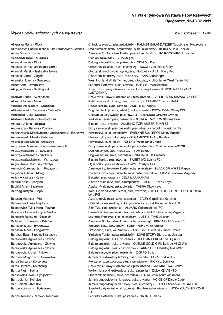 VII Walentynkowa Wystawa Psów Rasowych Bydgoszcz, 12-13.02.2011 Wykaz psów zgłoszonych na wystawę: Ilość zgłoszeń: 1764 Ablewska Marta - Płock Chiński grzywacz, pies, młodzieży - KALIKST BAŁANDASZEK Nadobnisie i Koczkodany Abramowicz Dariusz Izabela Sitz-Abramowicz- Gdańsk Adam Dariusz - Lubin Dog niemiecki (żółty, pręgowany), suka, młodzieży - NEBULA Hera TopDog American Staffordshire Terrier, pies, championów - LBC ROCK'N'ROLL Lesoto Adamczyk Jacek - Grodzisk Pointer, suka, baby - ERA Magna Adamiak Iwona - Płock Adamiak Marek - Jastrzębie Górne Buldog francuski, suka, pośrednia - DEVI Sto Pręg Owczarek kaukaski, pies, młodzieży - BUCZ z Jastrzębiej Góry Adamiak Marek - Jastrzębie Górne Owczarek środkowoazjatycki, pies, młodzieży - ARAK Kusy Ród Adamska Anna - Gdynia Adamska Joanna - Swarzędz Pinczer miniaturowy, suka, młodzieży - ANA Aqua Negra West Highland White Terrier, pies, młodzieży - LEO Jenek West Terrier FCI Ajtner Anna - Bydgoszcz Labrador Retriever, suka, otwarta - BABY z Nowodworskiej Akopyan Diana - Svetlogorsk Akopyan Diana - Svetlogorsk Szpic miniaturowy (Pomeranian), suka, championów - RUPOM NEBESNAYA LASTOCHKA Szpic miniaturowy (Pomeranian), pies, otwarta - GLORI ES TIN KAZANOVA BEST Albertini Janina - Mere Polski owczarek nizinny, pies, młodzieży - FRANEK Chluba z Polski Albińska Aleksandra - Grudziądz Aleksandrowicz Dagmara - Radziejów Pinczer średni, suka, otwarta - ALIS Rude Płomyki Dog niemiecki (czarny, arlekin), suka, otwarta - BIZEA Źródło Wełny FCI Alkhimova Anna - Moscow Chihuahua długowłosy, pies, otwarta - CHIRUSSI GRUFFI GAMMI Allahverdi Izabela - Elmwood Park Ambrute Jelena - Jelgava Yorkshire Terrier, pies, pośrednia - XTRA ATRACTION Stribrne Prani Basenji, suka, otwarta - AMUSING TORI AMBER SUNRISE Andruszczak Bartosz - Poznań Andruszewski Marek Joanna Andruszewska- Bolszewo Duży szwajcarski pies pasterski, pies, otwarta - WOBIK Porażynianka Hawańczyk, suka, młodzieży - EVELYNE SULLEROT Mokry Bandita Andruszewski Marek - Bolszewo Andruszewski Marek - Bolszewo Andryjenko Arkadiusz - Warszawa-Wesoła Hawańczyk, pies, młodzieży - GILGAMESCH Mokry Bandita Hawańczyk, suka, baby - JESSY z Przemożnej Chętki Duży szwajcarski pies pasterski, pies, pośrednia - Festina Lente ASTOR Andrzejewska Irena - Szczecin Andrzejewska Irena - Szczecin Andrzejewska Jadwiga - Warszawa Dog kanaryjski, pies, młodzieży - TOR Bateron Dog kanaryjski, suka, pośrednia - KIMBA CA De Presaldi Boston Terrier, pies, otwarta - SWEET IVO Sylena FCI Angrik Aneta, Mariusz - Olsztyn Archacki Grzegorz Jan - Radzymin Auguścik Łukasz - Morąg Ogar polski, pies, użytkowa - SMYK Poszły w Las American Staffordshire Terrier, suka, młodzieży - BLACK OR WHITE Rapax Płochacz niemiecki - Wachtelhund, suka, pośrednia - FIGA z Sosnowej Zagrody Aulich Arkadiusz - Kutno Babicki Artur - Szczytno Babicki Artur - Szczytno Badziąg Justyna - Sopot Bulterier, pies, otwarta - CELT MARKAROWI Alaskan Malamute, pies, championów - THUNDER okay Kaya Alaskan Malamute, suka, otwarta - TASHA Okay Kaya West Highland White Terrier, pies, szczeniąt - WHITE EXCELLENT LORD OF Royal Lord FCI Akita amerykańska, suka, szczeniąt - DAISY Gogolińska Karolina Chihuahua krótkowłosy, suka, pośrednia - ZUZIA Kujawski Czar FCI Shih Tzu, pies, szczeniąt - ALVARO Golden Merlot (FCI) Berneński pies pasterski, pies, pośrednia - IMBIR Z Gorzyckiej Zagrody Badziąg Mateusz - Piła Bagrowska Anna - Prądocin Balcerowicz-Tylka Irena - Poznań Balcerzak Irena - Gorzyce Wielkie Balcerzyk Rajmund - Szczecin Balkiewicz Katarzyna - Gdańsk Banasiak Maria - Bydgoszcz Banasiak Maria - Bydgoszcz Barabas Ewa - Sępólno Krajeńskie Baranowska Agnieszka - Głowno Baranowska Agnieszka - Głowno Baranowska Agnieszka - Głowno Baranowska Maria - Pniewy Barawąs Małgorzata - Inowrocław Baron Barbara - Kołobrzeg Baron Barbara - Kołobrzeg Bartha Piotr - Sucha Bartkowski Dawid - Bydgoszcz Bartl Jolanta - Końskie Bartl Jolanta - Końskie Barton Katarzyna - Bydgoszcz Bartos Tomasz - Papowo Toruńskie Labrador Retriever, pies, młodzieży - JUST IN TIME Al-grom American Staffordshire Terrier, suka, szczeniąt - KIRGA Gold Bonzo FCI Whippet, suka, weteranów - FUNNY GIRL Vincit Omnia Greyhound, suka, weteranów - EXCLUSIVE DYNASTY Vincit Omnia Yorkshire Terrier, suka, młodzieży - LOVE STORY Sfora znad Jeziora Buldog angielski, suka, pośrednia - CATALANA FROM The Big Al FCI Buldog angielski, suka, otwarta - QUELLE GOLD GIRL Bulldog Mi-Ol-Win Buldog angielski, pies, championów - LARRY FLINT Bulldog Mi-Ol-Win Buldog francuski, pies, pośrednia - ZORRO Baflo Jamnik szorstkowłosy króliczy, suka, otwarta - ELZA znad Wełny Foksterier szorstkowłosy, pies, championów - RICKY z Solniska Szpic miniaturowy (Pomeranian), pies, otwarta - WAIKIKI Żywe Srebro Wyżeł niemiecki krótkowłosy, suka, szczeniąt - ZILLA KEIVIENTO Owczarek niemiecki, suka, pośrednia - EIRINE vom Team Alhambra Jamnik długowłosy miniaturowy, suka, otwarta - VOICE OF Długie Cudo Jamnik długowłosy miniaturowy, pies, młodzieży - FRODO Koneckie Zacisze FCI Spaniel kontynentalny miniaturowy - Papillon, suka, otwarta - LITKA KUJAWSKI CZAR (FCI) Labrador Retriever, suka, pośrednia - NAOMI Lualaba Bartoszewska - Kujawa Małgorzata - Warszawa Owczarek francuski - Beauceron, suka, pośrednia - EGREGIA des Onze Hermines Baryczka Hanna - Bydgoszcz Barzhanova M. E. Shaposhnikova- St. Petersburg Shih Tzu, suka, szczeniąt - AURORA Playing The Angel Sznaucer średni pieprz i sól, pies, championów - RUS TOP RATE GREAT HIT Basta Anna - Łódz American Staffordshire Terrier, suka, weteranów - Gang-Staff (FCI) GIULIETTA Batog Monika - Warszawa Bayer Katarzyna - Chrzypsko Wielkie Dog niemiecki (czarny, arlekin), suka, otwarta - ANDORA Worsowglobtroter Basset Hound, pies, otwarta - PYZDRA ZE STAJENNYCH PROGÓW Bayer Katarzyna - Chrzypsko Wielkie Basset Hound, suka, baby - GETA MEDICUS VETERINARIUS Bąk Miros