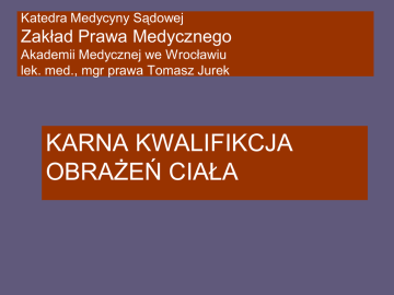 Katedra Medycyny Sądowej Zakład Prawa Medycznego Akademii Medycznej we Wrocławiu lek. med., mgr prawa Tomasz Jurek KARNA KWALIFIKCJA OBRAŻEŃ CIAŁA Kodeks krany przyjmuje trójstopniowy podział uszczerbku na zdrowiu w zależności od jego ciężkości. Ciężki uszczerbek na zdrowiu – art. 156 kk Średni uszczerbek na zdrowiu – art. 157 1. Lekki uszczerbek na zdrowiu - art. 157 2. Karna kwalifikacja skutków uszkodzeń ciała dokonywana jest przez biegłego lekarza na podstawie sądowo-lekarskiego badania osoby pokrzywdzonej, dokumentacji medycznej, analizy okoliczności zdarzenia. Lekarz klinicysta wierzy pacjentowi w zgłaszane przez niego skargi. Jego rolą, jest leczenie a więc wyeliminowanie objawów choroby. Medyk sądowy opiniując musi wątpić w zgłaszane subiektywne objawy i szukać sposobów na ich obiektywizację. Zasady karnej kwalifikacji uszkodzeń ciała to: •obiektywizacja subiektywnych objawów zgłaszanych przez pokrzywdzonego, a w przypadku braku takiej możliwości odrzucenie ich jako niemożliwych do weryfikacji •stosowanie się do prawnej zasady rozstrzygania wątpliwości na korzyść sprawcy (in dubio pro reo) •wnioskowanie o przyczynie uszkodzeń ciała i występowaniu objawów z nim związanych z wykorzystaniem poprawnego logicznie związku przyczynowego (związek bezpośredni potwierdzony testem warunku koniecznego conditio sine qua non) KWALIFIKACJA KARNA OBRAŻEŃ NOWY KODEKS KARNY Art. 156. § 1. Kto powoduje ciężki uszczerbek na zdrowiu w postaci: 1) pozbawienia człowieka wzroku, słuchu, mowy, zdolności płodzenia, 2) innego ciężkiego kalectwa, ciężkiej choroby nieuleczalnej lub długotrwałej,* choroby realnie zagrażającej życiu, trwałej choroby psychicznej, całkowitej lub znacznej trwałej niezdolności do pracy w zawodzie lub trwałego, istotnego zeszpecenia lub zniekształcenia ciała, podlega karze pozbawienia wolności od roku do lat 10. § 2. Jeżeli sprawca działa nieumyślnie,podlega karze pozbawienia wolności do lat 3. § 3. Jeżeli następstwem czynu określonego w § 1 jest śmierć człowieka, sprawca podlega karze pozbawienia wolności od lat 2 do 12. * zmieniony przez ustawę z dn.03.01.2003 (Dz. U. 199, poz. 1935) obowiązuje od 08.12.2003 KWALIFIKACJA KARNA OBRAŻEŃ STARY KODEKS KARNY Art. 155. § 1. Kto: 1) pozbawia człowieka wzroku, słuchu, mowy, zdolności płodzenia albo, 2) powoduje inne ciężkie kalectwo, ciężką chorobę nieuleczalną lub długotrwałą, chorobę zazwyczaj zagrażającą życiu, trwałą chorobę psychiczną, trwałą całkowitą lub znaczną niezdolność do pracy w zawodzie albo trwałe, poważne zeszpecenie lub zniekształcenie ciała, podlega karze pozbawienia wolności od roku do lat 10. § 2. Jeżeli sprawca nieumyślnie powoduje ciężkie uszkodzenie ciała lub ciężki rozstrój zdrowia ,podlega karze pozbawienia wolności od 6 miesięcy do lat 5. STARY KODEKS KARNY art. 155 -kto powoduje -ciężką chorobę nieuleczalną lub długotrwałą... -chorobę zazwyczaj zagrażającą życiu... NOWY KODEKS KARNY art. 156 -kto powoduje ciężki uszczerbek na zdrowiu w postaci... -ciężką chorobę nieuleczalną lub długotrwałą chorobą realnie zagrażającą życiu... (do dnia 08.12.03 -chorobę realnie zagrażającą życiu 08.12.03) (od dn. STARY KODEKS KARNY art. 155 NOWY KODEKS KARNY art. 156 -trwałą całkowitą lub znaczną niezdolność do pracy w zawodzie... - całkowitej lub znacznej trwałej niezdolności do pracy w zawodzie... -trwałe, poważne zeszpecenie lub zniekształcenie ciała... - trwałego, istotnego zeszpecenia lub zniekształcenia ciała... KWALIFIKACJA KARNA OBRAŻEŃ NOWY KODEKS KARNY Art. 157. § 1. Kto powoduje naruszenie czynności narządu ciała lub rozstrój zdrowia, inny niż określony w art. 156 § 1, podlega karze pozbawienia wolności od 3 miesięcy do lat 5. § 2. Kto powoduje naruszenie czynności narządu ciała lub rozstrój zdrowia trwający nie dłużej niż 7 dni, podlega grzywnie, karze ograniczenia wolności albo pozbawienia wolności do lat 2. § 3. Jeżeli sprawca czynu określonego w § 1 lub 2 działa nieumyślnie, podlega grzywnie, karze ograniczenia wolności albo pozbawienia wolności do roku. § 4. Ściganie przestępstwa określonego w § 2 lub 3, jeżeli naruszenie czynności narządu ciała lub rozstrój zdrowia nie trwał dłużej niż 7 dni, odbywa się z oskarżenia prywatnego. § 5. Jeżeli naruszenie czynności narządu ciała lub rozstrój zdrowia trwał dłużej niż 7 dni, a pokrzywdzonym jest osoba najbliższa, ściganie przestępstwa określonego w § 3 następuje na jej wniosek. KWALIFIKACJA KARNA OBRAŻEŃ KARNY STARY KODEKS Art. 156. § 1. Kto powoduje inne niż określone w art. 155 uszkodzenie ciała lub rozstrój zdrowia człowieka, podlega karze pozbawienia wolności od 6 miesięcy do lat 5. § 2. Jeżeli czyn określony w § 1 nie spowodował naruszenia czynności narządu ciała na czas powyżej dni 7 sprawca podlega karze pozbawienia wolności do lat 3. § 3. Jeżeli sprawca czynu nieumyślnie powoduje uszkodzenie ciała lub rozstrój zdrowia,podlega karze pozbawienia wolności do lat 2, ograniczenia wolności albo grzywny. § 4. Ściganie czynu określonego w § 2 oraz czynu określonego w § 3, jeżeli naruszenie czynności narządu ciała nie trwało dłużej niż 7 dni, odbywa się z oskarżenia prywatnego. STARY KODEKS KARNY art. 156 NOWY KODEKS KARNY art. 157 -Kto powoduje inne niż Kto powoduje naruszenie czynności narządu ciała lub rozstrój zdrowia... określone w art. 155 uszkodzenie ciała lub rozstrój zdrowia... Czynnikiem wyróżniającym ciężki uszczerbek na zdrowiu jest charakter uszkodzeń ciała (treść art. 156). Czynnikiem rozgraniczającym średni i lekki uszczerbek jest czas trwania naruszenia czynności narządu ciała lub rozstroju zdrowia. Czas ten nie jest to równoznaczny z : -czasem gojenia obrażeń lub występowania subiektywnych dolegliwości -długością lecz