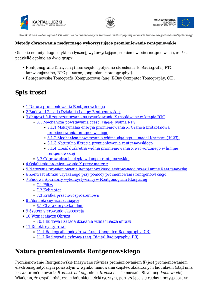 Metody obrazowania medycznego wykorzystujące promieniowanie rentgenowskie Obecnie metody diagnostyki medycznej, wykorzystujące promieniowanie rentgenowskie, można podzielić ogólnie na dwie grupy: Rentgenografię Klasyczną (inne często spotykane określenia, to Radiografia, RTG konwencjonalne, RTG planarne, (ang. planar radiography)). Rentgenowską Tomografię Komputerową (ang. X-Ray Computer Tomography, CT). Spis treści 1 Natura promieniowania Rentgenowskiego 2 Budowa i Zasada Działania Lampy Rentgenowskiej 3 długości fali zaprezentowano na rysunkuwania X uzyskiwane w lampie RTG 3.1 Mechanizm powstawania części ciągłej widma RTG 3.1.1 Maksymalna energia promieniowania X. Granica krótkofalowa promieniowania rentgenowskiego 3.1.2 Mechanizm powstawania widma ciągłego — model Kramera (1923). 3.1.3 Naturalna filtracja promieniowania rentgenowskiego 3.1.4 Część dyskretna widma promieniowania X wytworzonego w lampie rentgenowskiej 3.2 Odprowadzanie ciepła w lampie rentgenowskiej 4 Osłabienie promieniowania X przez materię 5 Natężenie promieniowania Rentgenowskiego emitowanego przez Lampę Rentgenowską 6 Kontrast obrazu uzyskanego przy pomocy promieniowania rentgenowskiego 7 Budowa Aparatury wykorzystywanej w Rentgenografii Klasycznej 7.1 Filtry 7.2 Kolimator 7.3 Kratka przeciwrozproszeniowa 8 Film i ekrany wzmacniające 8.1 Charakterystyka filmu 9 System sterowania ekspozycją 10 Wzmacniacze Obrazu 10.1 Budowa i zasada działania wzmacniacza obrazu 11 Detektory Cyfrowe 11.1 Radiografia półcyfrowa (ang. Computed Radiography, CR) 11.2 Radiografia cyfrowa (ang. Digital Radiography, DR) Natura promieniowania Rentgenowskiego Promieniowanie Rentgenowskie (nazywane również promieniowaniem X) jest promieniowaniem elektromagnetycznym powstałym w wyniku hamowania cząstek obdarzonych ładunkiem (stąd inna nazwa promieniowania Bremsstrahlung, niem. bremsen — hamować i Strahlung hamowanie). Wiadomo, że cząstki obdarzone ładunkiem elektrycznym, poruszające się ruchem przyspieszony emitują promieniowanie elektromagnetyczne, którego moc chwilową wyraża następujący wzór: gdzie: , r — odległość od ładunku do punktu obserwacji, c — prędkość światła, a — przyspieszenie z jakim porusza się ładunek, — przenikalność elektryczna próżni, c — prędkość światła. Długość fali promieniowania rentgenowskiego jest mniejsza od 3 nm co odpowiada energiom powyżej 400 eV. Wyróżnia się przy tym tzw. zakres promieniowania miękkiego — od 400 eV do 10 keV oraz promieniowania twardego, które charakteryzuje się energią powyżej 10 keV. Miękkie promieniowanie rentgenowskie jest absorbowane głównie przez powierzchniowe tkanki ciała ludzkiego i ma zbyt małą energię aby przez nie przeniknąć. W związku z tym nie znajduje zastosowania w Obrazowaniu Medycznym. Uwaga — w wielu źródłach można spotkać się z definicją promieniowania rentgenowskiego jako promieniowania elektromagnetycznego o długości fali zawartej pomiędzy ultrafioletem a promieniowaniem gamma. Taka definicja nie jest jednak właściwa, bowiem obecnie można uzyskać promieniowanie rentgenowskie o energii odpowiadającej niskoenergetycznemu promieniowaniu gamma. Zasadniczą różnicą pomiędzy promieniowaniem gamma a promieniowaniem rentgenowskim jest sposób powstawania. Promieniowanie gamma jest promieniowaniem rentgenowskim powstałym w przemianach jądrowych, natomiast promieniowanie rentgenowskie jest promieniowaniem elektromagnetycznym emitowanym przez cząstkę poruszająca się ruchem przyspieszonym. Promieniowania Rentgenowskiego stosowane w diagnostyce medycznej wytwarzane jest w tzw. Lampach Rentgenowskich. Budowa i Zasada Działania Lampy Rentgenowskiej Budowa Lampy Rentgenowskiej. K — katoda, A — anoda, — napięcie wywołujące żarzenie katody, — napięcie przyspieszające elektrony. Rysunek pochodzi ze strony Wikipedii. Schemat Lampy Rentgenowskiej zaprezentowano na rys. 1. Składa się ona z katody oraz anody, umieszczonych w szklanej bańce, z której usunięto powietrze. Do katody przyłożone jest napięcie, które wywołuje przepływ przez nią prądu rzędu ułamka ampera. Przepływ prądu powoduje rozgrzanie katody do temperatury około 2200 °C i w następstwie zjawisko termoemisji elektronów (czyli emisji elektronów przez podgrzany do wysokiej temperatury ciało Emisja termoelektronowa). Przy braku dodatkowego napięcia, elektrony emitowane przez katodę utworzyłyby wokół niej chmurę. Pomiędzy katodę a anodę przyłożone jest jednak napięcie (maksymalnie 150 kV), które powoduje ruch elektronów w kierunku anody. Elektrony zostają rozpędzone do prędkości około 0,1 prędkości światła po czym wnikają w anodę. W anodzie rozpędzone elektrony w wyniku szeregu różnych procesów, które zostaną omówione w kolejnych rozdziałach tracą swoją energię kinetyczną. Część tej energii zostaje przetworzona na promieniowanie elektromagnetyczne, jednak większość (ponad 95%) ulega przemianie w ciepło. W wyniku tego anoda rozgrzewa się do bardzo wysokich temperatur i musi być wykonana z materiałów o dużej wielkości atomowej (aby skutecznie hamować elektrony) oraz wysokiej temperaturze topnienia. Materiałami, które wykorzystuje się do budowy lampy RTG to najczęściej miedź, wolfram lub molibden. Aby polepszyć chłodzenie lampy rentgenowskiej, do anody doprowadzone są przewody z wodą lub specjalnym olejem, który odprowadza od niej ciepło (na rys. 1 są to wejścia oznaczone jako oraz ). długości fali zaprezentowano na rysunkuwania X uzyskiwane w lampie RTG Natężenie promieniowania X w funkcji energii wytwarzanego w lampie rentgenowskiej. Natężenie promieniowania X w funkcji długości fali wytwarzanego w lampie rentgenowskiej. Elektrony wnikające w anodę będą tracić swoją energię kinetyczną głównie w wyniku zderzeń z siecią krystaliczną anody. Tor ruchu elektronu zostaje zakrzywiony p