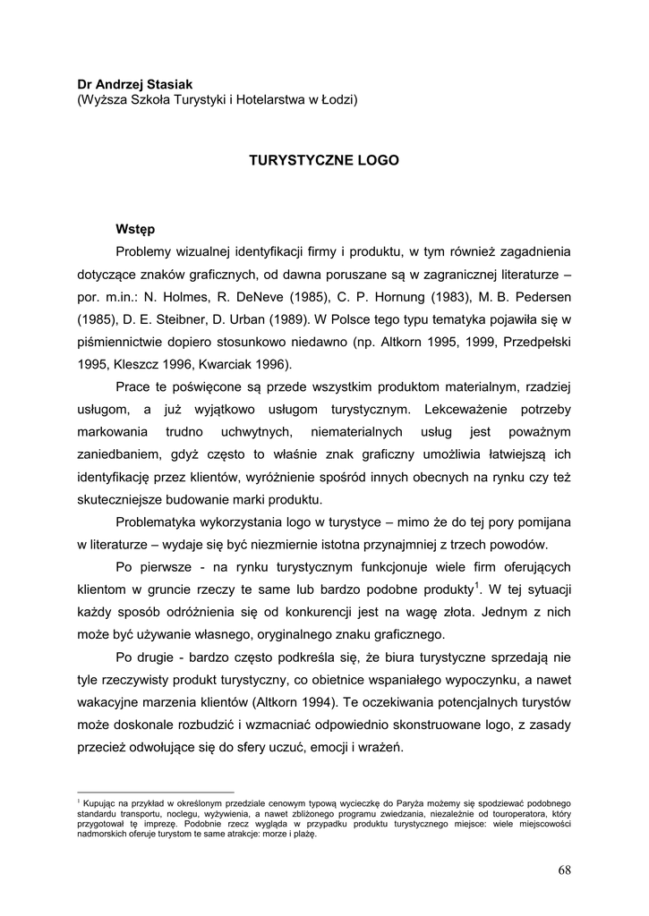 Dr Andrzej Stasiak (Wyższa Szkoła Turystyki i Hotelarstwa w Łodzi) TURYSTYCZNE LOGO Wstęp Problemy wizualnej identyfikacji firmy i produktu, w tym również zagadnienia dotyczące znaków graficznych, od dawna poruszane są w zagranicznej literaturze – por. m.in.: N. Holmes, R. DeNeve (1985), C. P. Hornung (1983), M. B. Pedersen (1985), D. E. Steibner, D. Urban (1989). W Polsce tego typu tematyka pojawiła się w piśmiennictwie dopiero stosunkowo niedawno (np. Altkorn 1995, 1999, Przedpełski 1995, Kleszcz 1996, Kwarciak 1996). Prace te poświęcone są przede wszystkim produktom materialnym, rzadziej usługom, a markowania już wyjątkowo trudno usługom uchwytnych, turystycznym. niematerialnych Lekceważenie usług jest potrzeby poważnym zaniedbaniem, gdyż często to właśnie znak graficzny umożliwia łatwiejszą ich identyfikację przez klientów, wyróżnienie spośród innych obecnych na rynku czy też skuteczniejsze budowanie marki produktu. Problematyka wykorzystania logo w turystyce – mimo że do tej pory pomijana w literaturze – wydaje się być niezmiernie istotna przynajmniej z trzech powodów. Po pierwsze - na rynku turystycznym funkcjonuje wiele firm oferujących klientom w gruncie rzeczy te same lub bardzo podobne produkty 1. W tej sytuacji każdy sposób odróżnienia się od konkurencji jest na wagę złota. Jednym z nich może być używanie własnego, oryginalnego znaku graficznego. Po drugie - bardzo często podkreśla się, że biura turystyczne sprzedają nie tyle rzeczywisty produkt turystyczny, co obietnice wspaniałego wypoczynku, a nawet wakacyjne marzenia klientów (Altkorn 1994). Te oczekiwania potencjalnych turystów może doskonale rozbudzić i wzmacniać odpowiednio skonstruowane logo, z zasady przecież odwołujące się do sfery uczuć, emocji i wrażeń. Kupując na przykład w określonym przedziale cenowym typową wycieczkę do Paryża możemy się spodziewać podobnego standardu transportu, noclegu, wyżywienia, a nawet zbliżonego programu zwiedzania, niezależnie od touroperatora, który przygotował tę imprezę. Podobnie rzecz wygląda w przypadku produktu turystycznego miejsce: wiele miejscowości nadmorskich oferuje turystom te same atrakcje: morze i plażę. 1 68 Po trzecie wreszcie - obraz jest zrozumiały dla wszystkich ludzi, niezależnie jaki językiem się posługują. Jeśli tylko uda się ominąć pułapki wynikające z odmiennego odczytywania symboli w różnych kulturach, logo może stać się istotnym elementem komunikacji w turystyce międzynarodowej. Marka a logo Podstawowym zadaniem każdej firmy jest dążenie do osiągnięcia silnej i stabilnej pozycji na rynku. Jednym ze sposobów realizacji tego celu jest stworzenie i wypromowania produktów będących wizytówką przedsiębiorstwa. Te tzw. produkty markowe są chętnie nabywane przez klientów, wzmacniają pozytywny wizerunek firmy, ułatwiają wejście na nowe rynki i rywalizację z konkurencją. Trudno wyobrazić sobie lidera rynku nieposiadającego w swej ofercie produktów markowych. Marka jest bez wątpienia jednym z najważniejszych narzędzi w działalności marketingowej firmy. Pojęcie to używane bywa jednak co najmniej w trzech znaczeniach (Altkorn 1999). Marka to: produkt, linia produktu, rodzina produktów lub cały asortyment oferowany przez określoną firmę – w tym przypadku marka oznacza po prostu pewną kategorię produktów, znak towarowy (nazwa, termin, symbol, rysunek lub ich kombinacja stworzona w celu identyfikacji produktu/firmy i wyróżnienia jego/ich spośród konkurencji) – utożsamianie marki ze znakiem towarowym jest typowe przede wszystkim dla literatury prawniczej, rynkowy wizerunek produktu (zestawu produktów) i/lub firmy, która go oferuje, charakteryzujący się wysoką jakością i uznaniem konsumentów – takie rozumienie marki najczęściej występuje w języku potocznym. Z marketingowego punktu widzenia istotne jest połączenie w jednej definicji tych trzech podstawowych znaczeń marki. J. Kaczmarek, A. Stasiak, B. Włodarczyk (2002) przyjęli, że marka jest złożonym systemem działania składającym się z programów identyfikacji i reputacji produktu (organizacji, firmy, przedsięwzięcia). IDENTYFIKACJA + REPUTACJA = MARKA Do elementów podstawowych tworzących program identyfikacji zaliczono znak graficzny i nazwę, natomiast do uzupełniających - hasło i sygnał dźwiękowy (rys. 1). Wymienione elementy są konieczne, ale niewystarczające do konstruowania marki. 69 O prawdziwej marce można mówić dopiero wtedy, gdy potrafimy zbudować reputację produktu i firmy, czyli sprawić, by cieszyły się dobrą opinią i uznaniem konsumentów. Reputację kształtuje z jednej strony wysoka jakość produktu, z drugiej – wewnętrzna organizacja firmy, sprawność działania i jej rynkowy wizerunek, czyli kultura organizacji. Istotne jest przy tym podkreślenie, że program tworzenia marki trwa zazwyczaj długo i muszą brać w nim udział wszyscy pracownicy. MARKA Identyfikacja Reputacja NAZWA Elementy podstawowe LOGO KULTURA HASŁO Elementy uzupełniające DŹWIĘK Rys. 1. Elementy składowe marki (Źródło: Kaczmarek, Stasiak, Włodarczyk 2002) Z przedstawionego schematu (rys. 1) wynika, że logo jest niezwykle ważnym składnikiem systemu marki. Wraz z nazwą zostało zaliczone do podstawowych elementów programu identyfikacji. Bardzo często zdarza się jednak, że nazwa i logo tworzą jedną całość, której rozdzielenie jest bardzo trudne lub wręcz niemożliwe. Zarówno nazwa, jak i logo mogą stać się głównym znakiem rozpoznawczym marki. Logo jednak z reguły zawiera w sobie znacznie większy ładunek treści. Znak graficzny jest bowiem zarazem pewną formą zapisu idei produktu i/lub firmy, co rzadziej udaje się zawrzeć w nazwie. Definicja, elementy składowe i funkcje logo Korzeni europejskich znaków towarowych można szukać już w starożytności m.in. wśród symboli, którymi oznaczano sk