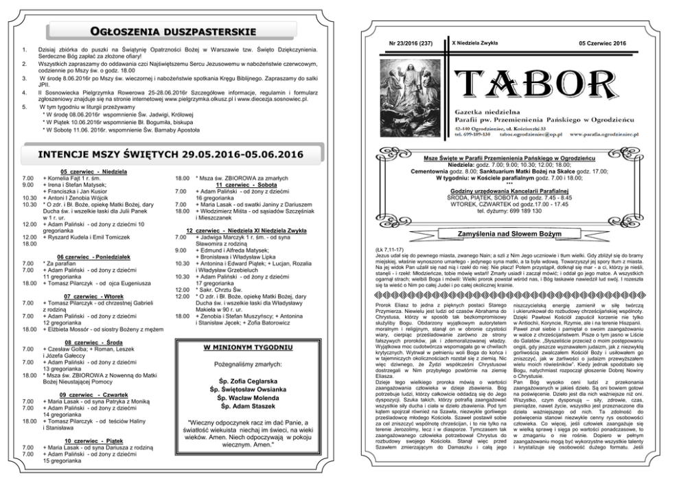 ogłoszenia duszpasterskie intencje mszy świętych 29.05.2016