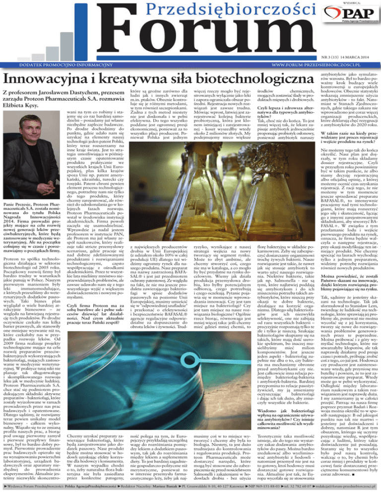 WYDAWCA: nr 3 (13) 14 MArCA 2014 dodAtek proMoCyjno-inforMACyjny www.foruM-przedsiebiorCzosCi.pl Innowacyjna i kreatywna siła biotechnologiczna Z profesorem Jarosławem Dastychem, prezesem zarządu Proteon Pharmaceuticals S.A. rozmawia Elżbieta Kęsy. Panie Prezesie, Proteon Pharmaceuticals S.A. została nominowana do tytułu Polska Nagroda Innowacyjności 2014. Firma prowadzi projekty mające na celu rozwój nowej generacji leków przeciwbakteryjnych, które będą zastosowane w medycynie weterynaryjnej. Ale na początku cofnijmy się w czasie i porozmawiajmy o początkach firmy. Proteon to spółka technologiczna działająca w sektorze biotechnologii od 2005 roku. Początkowy rozwój firmy był bardzo trudny w warunkach jakie panują w Polsce. Naszym pierwszym marzeniem były leki immunomodulujące, z których przeszliśmy do weterynaryjnych dodatków paszowych. Taki biznes plan wyglądał o wiele bardziej atrakcyjnie biznesowo – ze względu na łatwiejszą rejestrację tych produktów. Po drodze oczywiście czekało nas kilka barier prawnych, ale stanowiły one mniejsze wyzwanie niż to, które czekałoby nas w przypadku rozwoju leków. Od 2009 firma realizuje projekty technologiczne mające na celu rozwój preparatów przeciwbakteryjnych wykorzystujących bakteriofagi, mających zastosowanie w medycynie weterynaryjnej. W praktyce tutaj nikt nie planuje tak długotrwałego i skomplikowanego rozwoju leku jak w medycynie ludzkiej. Proteon Pharmaceuticals S.A. chce stać się podmiotem produkującym składniki aktywne preparatów - bakteriofagi, które zostały wyizolowane w ramach prowadzonych przez nas prac badawczych i opatentowane. Dlatego sądzimy, że rozwijamy teraz pewien unikalny model biznesowy - całkiem wykonalny. Wiązało się to ze zmianą profilu naszych prac, a biorąc pod uwagę pierwotny zamysł i pierwsze przepływy finansowe, był to bardzo dobry pomysł. Pierwotnie prowadzenie prac badawczych opierało się na wynajmowaniu powierzchni laboratoryjnej, urządzeń badawczych oraz aparatury niezbędnej do prowadzenia eksperymentów. Aktualnie jesteśmy niezwykle skoncentro- wani na tym co robimy i stajemy się co raz bardziej samodzielni – posiadamy już własne niezbędne zaplecze badawcze. Po drodze dochodzimy do punktu, gdzie udało nam się uzyskać na elementy naszej technologii jeden patent Polski, który teraz rozszerzamy na inne kraje świata. Jest to strategia umożliwiająca w późniejszym czasie opatentowanie produktu praktycznie we wszystkich krajach Unii Europejskiej, plus kilka krajów spoza Unii np. patent amerykański, ukraiński, turecki czy rosyjski. Patent chroni pewien element procesu technologicznego, potrzebny nam nie tylko do tego produktu, który chcemy zarejestrować, ale również do udoskonalania go w kolejnych fazach rozwoju. Proteon Pharmaceuticals powstał w środowisku instytucji akademickich. Firma powoli zaczęła się usamodzielniać. Wprawdzie ja nadal jestem profesorem w instytucie PAN, ale Proteon ma już własny zespół naukowców, który realizuje taki stricte przemysłowy scenariusz, gdzie pracuje się nad dobrze zdefiniowanymi produktami i rozwiązaniami technologicznymi, często współpracując z ośrodkami akademickimi. Przez te wszystkie lata mieliśmy mnóstwo nieprzewidzianych problemów, ale zawsze udawało nam się z tego wszystkiego wyjść z większym doświadczeniem i nowymi pomysłami. Czyli firma Proteon ma za sobą burzliwe ale i pełne sukcesów dziewięć lat działalności. Nad czym aktualnie pracuje teraz Pański zespół? które są groźne zarówno dla ludzi jak i innych zwierząt m.in. ptaków. Obecnie kontroluje się je różnymi metodami, w tym również szczepionkami. Żadna z tych metod niestety nie jest doskonała i w pełni efektywna. Do tego wszystko poddane jest ogromnej presji ekonomicznej, ponieważ za to wszystko płaci producent. Ponieważ Polska jest jednym z największych producentów drobiu w Unii Europejskiej (z udziałem około 10% w całej produkcji UE) dlatego też widzimy ogromny rynek dla naszego produktu. Nasz preparat ma nazwę zastrzeżoną BAFASAL® i jest już przedmiotem ochrony patentowej. Ze względu na fakt, że nie ma jeszcze produktu zawierającego bakteriofagi w spisie dodatków paszowych na poziomie Unii Europejskiej, musimy umieścić się w "odpowiedniej szufladzie" i przekonać o efektywności i bezpieczeństwie BAFASAL® agencje regulacyjne odpowiedzialne za dopuszczanie do obrotu leków i żywności. Trud- więcej rzeczy mogło być rejestrowanych wyłącznie jako leki i zapora ograniczała obszar pośredni. Rejestracja nowych rozwiązań jest zawsze trudna. Mówiąc wprost, łatwiej jest zarejestrować kolejną bakterie probiotyczną, która jest klonem istniejącej i zarejestrowanej - koszt wyszedłby wtedy około 2 milionów złotych. My podejmujemy nieco większe ryzyko, wynikające z naszej strategii wejścia na nowy tworzący się segment rynku. Może to zbyt ambitne, ale chcemy stworzyć coś, czego nie ma w katalogu, a co mogło by być przydatne na rynku docelowym. Wiemy jak działa produkcja przemysłowa drobiu, kto byłby potencjalnym odbiorcą, czego potrzebują i czego oczekują. Pytanie pojawia się w momencie wprowadzania innowacji. Czy jest tam miejsce na bakteriofagi? Czy jest tam miejsce na nasze rozwiązania biologiczne? Ogólnie rzecz biorąc, równowaga jest mniej więcej taka: jeśli chcemy mieć gdzieś mniej chemii, to środków chemicznych, mogących zostawiać ślady w produktach mięsnych i drobiowych. Czyli lepsza i zdrowsza alternatywa dla typowych antybiotyków? Tak, choć nie do końca. To jest mniej więcej tak, że lekarz zapisuje antybiotyk jednocześnie proponując probiotyk osłonowy, ponieważ antybiotyk naruszy florę bakteryjną w układzie pokarmowym. Żeby się zabezpieczyć dostarczamy organizmowi trochę żywych bakterii. Nasze rozwiązanie jest takie, że nawet jak się stosuje antybiotyk to warto użyć naszego rozwi
