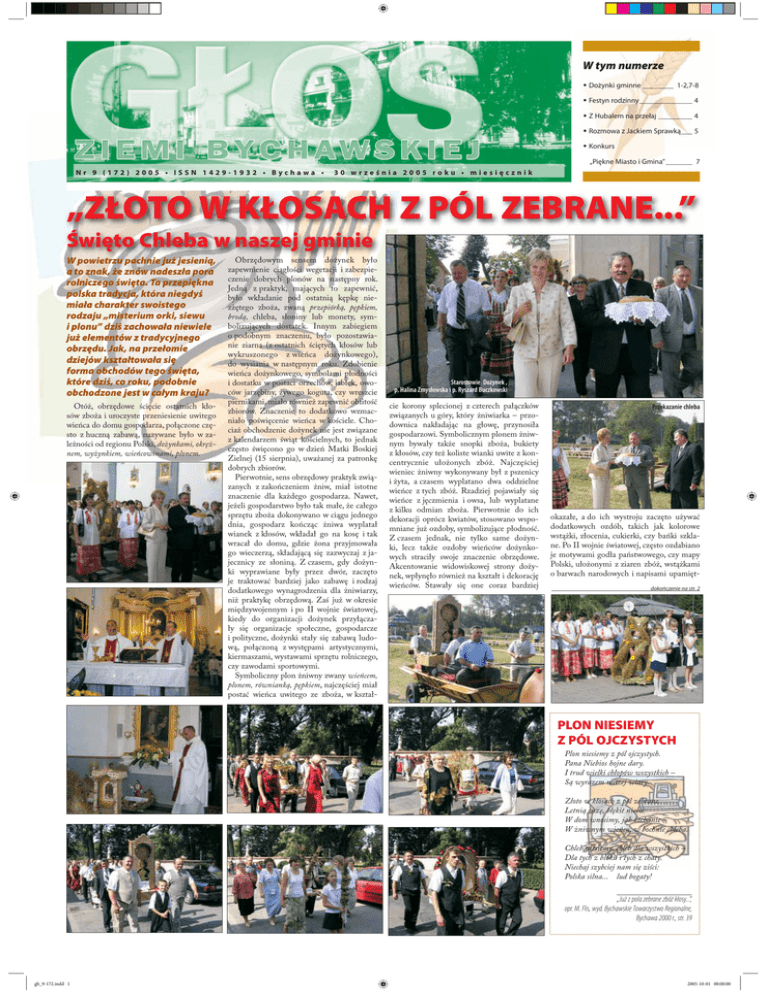 W tym numerze Dożynki gminne ________ 1-2,7-8 Festyn rodzinny ______________ 4 Z Hubalem na przełaj _________ 4 Rozmowa z Jackiem Sprawką ___ 5 Konkurs „Piękne Miasto i Gmina” _______ 7 Nr 9 (172) 2005 • ISSN 1429-1932 • Bychawa • 30 września 2005 roku • miesięcznik „ZŁOTO W KŁOSACH Z PÓL ZEBRANE...” Święto Chleba w naszej gminie W powietrzu pachnie już jesienią, a to znak, że znów nadeszła pora rolniczego święta. Ta przepiękna polska tradycja, która niegdyś miała charakter swoistego rodzaju „misterium orki, siewu i plonu” dziś zachowała niewiele już elementów z tradycyjnego obrzędu. Jak, na przełomie dziejów kształtowała się forma obchodów tego święta, które dziś, co roku, podobnie obchodzone jest w całym kraju? Otóż, obrzędowe ścięcie ostatnich kłosów zboża i uroczyste przeniesienie uwitego wieńca do domu gospodarza, połączone często z huczną zabawą, nazywane było w zależności od regionu Polski, dożynkami, okrężnem, wyżynkiem, wieńcowinami, plonem. Obrzędowym sensem dożynek było zapewnienie ciągłości wegetacji i zabezpieczenie dobrych plonów na następny rok. Jedną z praktyk, mających to zapewnić, było wkładanie pod ostatnią kępkę niezżętego zboża, zwaną przepiórką, pępkiem, brodą, chleba, słoniny lub monety, symbolizujących dostatek. Innym zabiegiem o podobnym znaczeniu, było pozostawianie ziarna (z ostatnich ściętych kłosów lub wykruszonego z wieńca dożynkowego), do wysiania w następnym roku. Zdobienie wieńca dożynkowego, symbolami płodności i dostatku w postaci orzechów, jabłek, owoców jarzębiny, żywego koguta, czy wreszcie piernikami, miało również zapewnić obfitość zbiorów. Znaczenie to dodatkowo wzmacniało poświęcenie wieńca w kościele. Chociaż obchodzenie dożynek nie jest związane z kalendarzem świąt kościelnych, to jednak często święcono go w dzień Matki Boskiej Zielnej (15 sierpnia), uważanej za patronkę dobrych zbiorów. Pierwotnie, sens obrzędowy praktyk związanych z zakończeniem żniw, miał istotne znaczenie dla każdego gospodarza. Nawet, jeżeli gospodarstwo było tak małe, że całego sprzętu zboża dokonywano w ciągu jednego dnia, gospodarz kończąc żniwa wyplatał wianek z kłosów, wkładał go na kosę i tak wracał do domu, gdzie żona przyjmowała go wieczerzą, składającą się zazwyczaj z jajecznicy ze słoniną. Z czasem, gdy dożynki wyprawiane były przez dwór, zaczęto je traktować bardziej jako zabawę i rodzaj dodatkowego wynagrodzenia dla żniwiarzy, niż praktykę obrzędową. Zaś już w okresie międzywojennym i po II wojnie światowej, kiedy do organizacji dożynek przyłączały się organizacje społeczne, gospodarcze i polityczne, dożynki stały się zabawą ludową, połączoną z występami artystycznymi, kiermaszami, wystawami sprzętu rolniczego, czy zawodami sportowymi. Symboliczny plon żniwny zwany wieńcem, plonem, równianką, pępkiem, najczęściej miał postać wieńca uwitego ze zboża, w kształ- Starostowie Dożynek , p. Halina Zmysłowska i p. Ryszard Buczkowski cie korony splecionej z czterech pałączków związanych u góry, który żniwiarka – przodownica nakładając na głowę, przynosiła gospodarzowi. Symbolicznym plonem żniwnym bywały także snopki zboża, bukiety z kłosów, czy też koliste wianki uwite z koncentrycznie ułożonych zbóż. Najczęściej wieniec żniwny wykonywany był z pszenicy i żyta, a czasem wyplatano dwa oddzielne wieńce z tych zbóż. Rzadziej pojawiały się wieńce z jęczmienia i owsa, lub wyplatane z kilku odmian zboża. Pierwotnie do ich dekoracji oprócz kwiatów, stosowano wspomniane już ozdoby, symbolizujące płodność. Z czasem jednak, nie tylko same dożynki, lecz także ozdoby wieńców dożynkowych straciły swoje znaczenie obrzędowe. Akcentowanie widowiskowej strony dożynek, wpłynęło również na kształt i dekorację wieńców. Stawały się one coraz bardziej Przekazanie chleba okazałe, a do ich wystroju zaczęto używać dodatkowych ozdób, takich jak kolorowe wstążki, złocenia, cukierki, czy bańki szklane. Po II wojnie światowej, często ozdabiano je motywami godła państwowego, czy mapy Polski, ułożonymi z ziaren zbóż, wstążkami o barwach narodowych i napisami upamiętdokończenie na str. 2 PLON NIESIEMY Z PÓL OJCZYSTYCH Plon niesiemy z pól ojczystych. Pana Niebios hojne dary. I trud wielki chłopów wszystkich – Są wyrazem naszej wiary. Złoto w kłosach z pól zebrane. Letnią ciszę, błękit nieba. W dom wnosimy, jak kochanie – W żniwnym wieńcu, w bochnie chleba. Chleb niesiemy, chleb dla wszystkich – Dla tych z bloku i tych z chaty. Niechaj szybciej nam się ziści: Polska silna... lud bogaty! „Już z pola zebrane zbóż kłosy...”, opr. M. Flis, wyd. Bychawskie Towarzystwo Regionalne, Bychawa 2000 r., str. 39 gb_9-172.indd 1 2005-10-01 00:00:00 GŁOS ZIEMI BYCHAWSKIEJ 2 nr 9 (172) 2005 „ZŁOTO W KŁOSACH Z PÓL ZEBRANE...” dokończenie ze str. 1 które często zakrawają niemalże na dzieła sztuki. Ich twórcy, w wielu przypadkach zasługują wręcz na miano artystów, którzy prześcigają się w pomysłach i poszukują coraz to nowszych technik wykonania. O ile w wielu miejscowościach, również naszej gminy, tradycja wicia wieńców dożynkowych powoli zanika, (podobno „młodzi nie chcą jej przejąć – a szkoda - a spośród starszych nie ma już komu...”), o tyle w innych, wydaje się ona wręcz rozwijać. Przykładem takiej miejscowości w naszej gminie jest Gałęzów – Kolonia II, której mieszkanka, bardzo młoda zresztą osoba, p. Małgorzata Tudrujek, co li ją dwaj księża proboszcze: ks. dziekan Andrzej Kuś oraz gość, ks. Mirosław Bielecki, proboszcz parafii w Kosarzewie, który wygłosił homilię przygotowaną specjalnie na tę okoliczność. W trakcie Mszy św. proboszcz bychawski dokonał poświęcenia wieńców, a po jej zakończeniu korowód