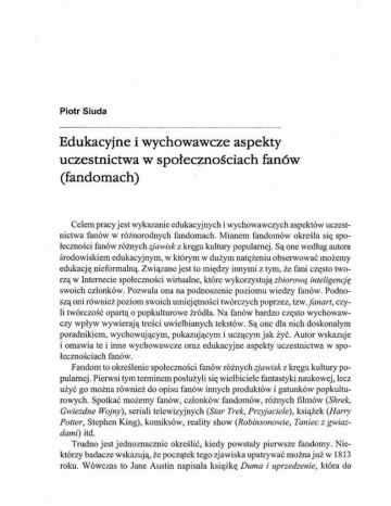 Piotr Siuda Edukacyjne i wychowawcze aspekty uczestnictwa w społec~nościach fanów (fandomach) Celem pracy jest wykazanie edukacyjnych i wychowawczych aspektów uczestnictwa fanów w różnorodnych fandomach. Mianem fandomów określa się społeczności fanów różnych zjawisk z krf(gu kultwy popularnej. Są one według autora środowiskiem edukacyjnym, w którym w dużym natężeniu obserwować możemy edukację nieformalną Związane jest to między innymi z tym, że fani często tworzą w Internecie społeczności wirtualne, które wykorzystujązbiorową inteligencję swoich członków. Pozwala ona na podnoszenie poziomu wiedzy fanów. Podnoszą oni również poziom swoich umiejętności twórczych poprzez, tzw.fanart, czyli twórczość opartą o popkulturowe źródła. Na fanów bardzo często wychowawczy wpływ wywierają treści uwielbianych tekstów. Są one dla nich doskonałym poradnikiem, wychowującym, pokazującym i uczącym jak żyć. Autor wskazuje i omawia te i inne wychowawcze oraz edukacyjne aspekty uczestnictwa w społecznościach fanów. Fandom to określenie społeczności fanów różnychzjawisk z kręgu kultury popularnej. Pierwsi tym terminem posłużyli się wielbiciele fantastyki naukowej, lecz użyć go można również do opisu fanów innych produktów i gatunków popkuJturowych. Spotkać możemy fanów, członków .fandomów, różnych filmów (Shrek. Gwiezdne Wojny), seriali telewizyjnych (Star Trek, Przyjaciele), książek (Han-y Potter, Stephen King), komiksów, reality show (Robinsonowie, Taniec z gwiazdami) itd. Trudno jest jednoznacznie określić, kiedy powstały pierwsze fandomy. Niektórzy badacze wskazują, że początek tego zjawiska upatrywać można już w 1813 roku. Wówczas to Jane Austin napisała książkę Duma i uprzedzenie, która do E-•kacyjne i wychowawcze aspekty uczestnictwa w społeczności ach fanów 119 .tzisiaj doczekała sięnajwiększej ilości nieoficjalnych kontynuacj i pisanych przez jej wielbicieli. Większość naukowców wskazuje jednak, że ruch fanów zapoczątko •'lłl i wielbiciele fantastyki naukowej, funkcjonujący w pierwszej połowie XX wieku w USA. Za datę powstania pierwszego fandomu uznaje się 4 lipca 1939 roku. V.'ówczas to zorganizowano pierwszy Światowy Konwent Science Fiction (http:// ctd. vcu.edu/theses/a vailable/etd-05092005-125907/). Dzisiaj to właśnie fani fantastyki naukowej tworzą fandomy największe, najbardziej rozwinięte, obejmujące swoim zasięgiem największy obszar globu. Prym zdają si~ wieść szczególnie dwa fandomy-chodzi o fa·nów Gwiezdnych Wojen «az Star Treka. Te dwa zjawiska popkulturowe podwzględem popularności przerosły oczekiwania swoich twórców. Niezwykłe powodzenie wśród szerokiej publiczności spowodowało, że już dawno stały się one czymś, co Hemy Jenkins nazywa opowiadaniem transmedialnym. Opowiadanie takie to "historie, które są odslanianie na różnych platformach medialnych, przy czym każde medium ma swój oddzielny wkład w rozumienie fikcyj nego świata" (Jenkins 2007, s. 270). Jeśli chodzi o Gwiezdne Wojny, właściwie ciężko dzisiaj już mówić o tym, że jest to tylko film . Powstanie fandomu Star Wars sprowokowało chęć zaspokojenia ~etytów fanów i produkcj(( całej masy książek, komiksów, gier. Podobnie rzecz ma się ze Star Trekiem. Serial ten, pierwotnie wyświetlany w Stanach Zjednoczonych w Jatach sześćdziesiątych, już dawno wyrósł ponad platformę medialną, jaką jest telewizja. Do tej pory nakręcono dziesięć filmów fabularnych, cztery kolejne seriale, powstało mnóstwo książek i gier komputerowych. Oczywiście pokaźnych rozmiarów fandomy tworzą również wielbiciele innych gatunków czy produktów popkulturowycb, z których wiele uznać możemy za opowiadania transmedialne. Ważnym aspektem funkcjonowania wielu społeczności fanów są organizowane przez nie zloty, czyli tak zwane konwenty. Są to imprezy, na których fan i chcą się ze sobąprzede wszystkim spotkać i wspólnie spędzić czas. Bardzo często wym ieniają się wówczas produktami związanymi z przedmiotem ich uwielbienia, niekiedy przebierają się w kostiumy swoich ulubionych postaci. Konwenty organizowane są już, począwszy od hit trzydziestych dwudziestego wieku. Pierwszym był wspomniany przeze mnie World Science Fiction Convention (Worldcon), który organizowany jest od tamtego czasu każdego roku. Jest to główny konwent amerykańskiego fandomu science - fiction i co roku gromadzi około 8 tysięcy fanów. Konwenty skupiają albo wielbicieli danego gatunku, albo produktu. Najpopularniejsze w Stanach Zjednoczonych konwenty to np. WisGon, Dragon *Gon, Lunacon, Arisia, Balticon czy I-GON, Gelebration (główny konwent Gwiezdnych Wojen), Galaxyfest (główny konwent Star Treka) (http://en.wikipedia.org/wiki/ Science_fiction_conventions). Konwenty organizowane są nie tylko w USA, ale 120 Piotr Siuda również na całym świecie, w tym w Polsce. Przykładowo polscy fani Gwiezdnych Wojen organizują, tzw. Imperiady, a fani mangi, np. Magnicon czy Animacon. Niezwykle istotnym narzędziem wykorzystywanym przez społeczności fanów jest Internet. Postawić wręcz można tezę, że bez elektronicznej sieci, istnienie fandomów i ich funkcjonowanie jest mało prawdopodobne. Medium to bowiem znacząco odmieniło oblicze społeczności fanów, przede wszystkim przyczyniło się do ich rozwoju, popula1yzacji oraz wzrostu liczebności członków. Przed zaistnieniem Internetu fandomy były rozbite przestrzennie, a komunikacja pomiędzy oddalonymi od siebie członkami znacznie utrudniona. Opierała się ona przeważ nie na wysyłaniu listów i amatorsko tworzonych gazetek (fanzinów). I chociaż istniało bardzo wielu fanów poszczególnych produktów popkulturowych, to jednak znalezienie osób podzielających zainteresowanie którymś z nich, a przez to stanie się członkiem fandomu, było zwykle trudne. Na przeszkodzie stały dwie głó