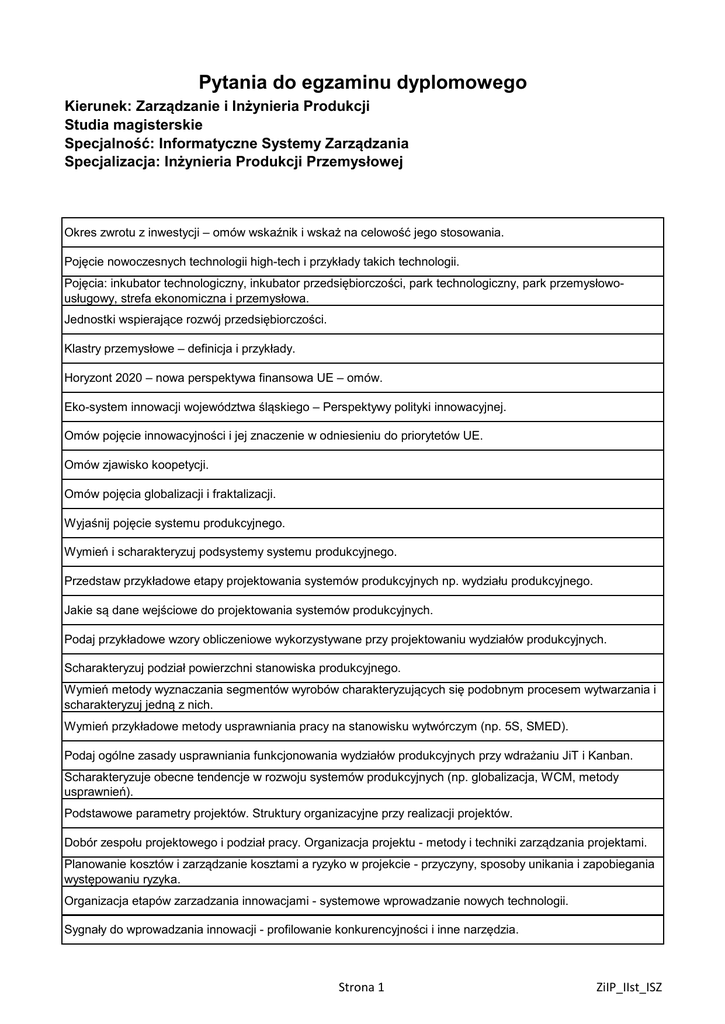Pytania do egzaminu dyplomowego Kierunek: Zarządzanie i Inżynieria Produkcji Studia magisterskie Specjalność: Informatyczne Systemy Zarządzania Specjalizacja: Inżynieria Produkcji Przemysłowej Okres zwrotu z inwestycji – omów wskaźnik i wskaż na celowość jego stosowania. Pojęcie nowoczesnych technologii high-tech i przykłady takich technologii. Pojęcia: inkubator technologiczny, inkubator przedsiębiorczości, park technologiczny, park przemysłowousługowy, strefa ekonomiczna i przemysłowa. Jednostki wspierające rozwój przedsiębiorczości. Klastry przemysłowe – definicja i przykłady. Horyzont 2020 – nowa perspektywa finansowa UE – omów. Eko-system innowacji województwa śląskiego – Perspektywy polityki innowacyjnej. Omów pojęcie innowacyjności i jej znaczenie w odniesieniu do priorytetów UE. Omów zjawisko koopetycji. Omów pojęcia globalizacji i fraktalizacji. Wyjaśnij pojęcie systemu produkcyjnego. Wymień i scharakteryzuj podsystemy systemu produkcyjnego. Przedstaw przykładowe etapy projektowania systemów produkcyjnych np. wydziału produkcyjnego. Jakie są dane wejściowe do projektowania systemów produkcyjnych. Podaj przykładowe wzory obliczeniowe wykorzystywane przy projektowaniu wydziałów produkcyjnych. Scharakteryzuj podział powierzchni stanowiska produkcyjnego. Wymień metody wyznaczania segmentów wyrobów charakteryzujących się podobnym procesem wytwarzania i scharakteryzuj jedną z nich. Wymień przykładowe metody usprawniania pracy na stanowisku wytwórczym (np. 5S, SMED). Podaj ogólne zasady usprawniania funkcjonowania wydziałów produkcyjnych przy wdrażaniu JiT i Kanban. Scharakteryzuje obecne tendencje w rozwoju systemów produkcyjnych (np. globalizacja, WCM, metody usprawnień). Podstawowe parametry projektów. Struktury organizacyjne przy realizacji projektów. Dobór zespołu projektowego i podział pracy. Organizacja projektu - metody i techniki zarządzania projektami. Planowanie kosztów i zarządzanie kosztami a ryzyko w projekcie - przyczyny, sposoby unikania i zapobiegania występowaniu ryzyka. Organizacja etapów zarzadzania innowacjami - systemowe wprowadzanie nowych technologii. Sygnały do wprowadzania innowacji - profilowanie konkurencyjności i inne narzędzia. Strona 1 ZiIP_IIst_ISZ Strategia Technologiczna, Analiza strategiczna, Wybór strategiczny - narzędzia i techniki. Sposoby pozyskania technologii, kryteria doboru źródła. Metody uczenia się jak doskonalić zarządzanie technologią. Audyt zarządzania technologią. Model Coopera planowania wdrażania, problemy związane z wdrażaniem technologii, wdrażanie równoległe. Etapy komercjalizacji innowacji a źródła finasowania innowacji. Omów działania, w wyniku których powstają nowe lub unowocześnione środki techniczne. Omów kryteria, będące podstawą oceny działalności projektanta (celowość techniczna, ekonomiczna i racja możliwości wytwórczych). Ogólne zasady zagospodarowania przestrzennego zakładów produkcyjnych (podział na przestrzenie). Czynniki wpływające na plan zagospodarowania przestrzennego zakładu przemysłowego. Czynniki wyboru lokalizacji przemysłu. Scharakteryzuj modele zarządzania wiedzą. Wymień i scharakteryzuj metody stosowane do wspomagania decyzji w obszarze inżynierii produkcji. Scharakteryzuj metody pozyskiwania wiedzy. Scharakteryzuj metody integracji wiedzy pochodzącej z różnych źródeł. Omów rolę systemów ekspertowych w integracji systemów zarządzania. Scharakteryzuj rolę systemów ekspertowych w zarządzaniu działalnością produkcyjną przedsiębiorstw. Scharakteryzuj wybrane systemy informatyczne wspomagające podejmowanie decyzji w obszarze inżynierii produkcji. Scharakteryzuj zakres zastosowań metod i narzędzi służących do wspomagania decyzji w przedsiębiorstwie. Scharakteryzuj metody zarządzania wiedzą w obszarze inżynierii produkcji. Wskaż ograniczenia związane z zastosowaniem wybranych metod i narzędzi służących do wspomagania decyzji w przedsiębiorstwie. Proszę omówić uwarunkowania rozwoju podejścia strategicznego w zarządzaniu przedsiębiorstwem oraz koncepcja i elementy zarządzania strategicznego. Co należy rozumieć pod pojęciami: strategia oraz zarządzanie strategiczne w świetle funkcjonowania organizacji, przedstawić ich rodzaje oraz rolę strategii w rozwoju przedsiębiorstwa. Proszę scharakteryzować podmiot gospodarczy oraz jego otoczenie oraz podstawowe terminy gospodarki rynkowej, omówić różnice między rynkiem producenta a rynkiem konsumenta. Proszę opisać projektowanie struktury organizacyjnej przedsiębiorstwa, na przykładzie struktury, hierarchicznej (administracyjnej), zadaniowo – technologicznej oraz projektowej (organicznej). Co należy rozumieć pod pojęciem planowania strategicznego, a prognozowania przedsięwzięć gospodarczych, dokonać ich podziału oraz analizy przydatności. Co to jest controlling strategiczny, zróżnicowanie, integracja, proces restrukturyzacji przedsiębiorstwa. Krótko je scharakteryzować. Przedstawić zagadnienie Technologii Informacyjnej oraz wirtualnej w przedsiębiorstwie, podać ich definicje, dokonać analizy oraz wymienić atrybuty. Jak umiejscowiona jest analiza strategiczne w zarządzaniu strategicznym, przedstawić jej zadania oraz dokonać podziału w różnych obszarach przedsiębiorstwa. Strona 2 ZiIP_IIst_ISZ Proszę wymienić po kilka metod analizy strategicznej makrootoczenia oraz otoczenia konkurencyjnego, dokładniej omówić po jednej metodzie z tych otoczeń. Wymienić podstawowe metody analizy potencjału i oceny pozycyjnej przedsiębiorstwa oraz krótko omówić po jednej z metod analizy oraz oceny. Podaj różnicę między modelowaniem, symulacją i optymalizacją. Wyjaśnij na czym polega optymalizacja z wykorzystaniem oprogramowania ARENA. Wyjaśnij na czym polega optymalizacja wielokryterialna w projektach symulacyjnych. Jakie analizy statystyczne wykonywane s