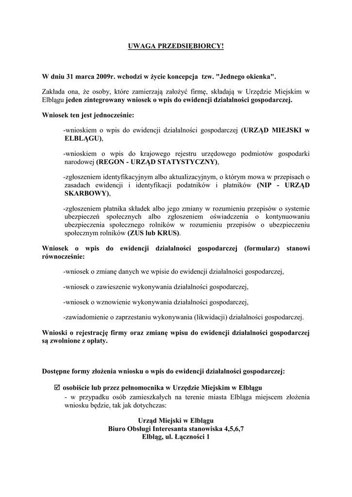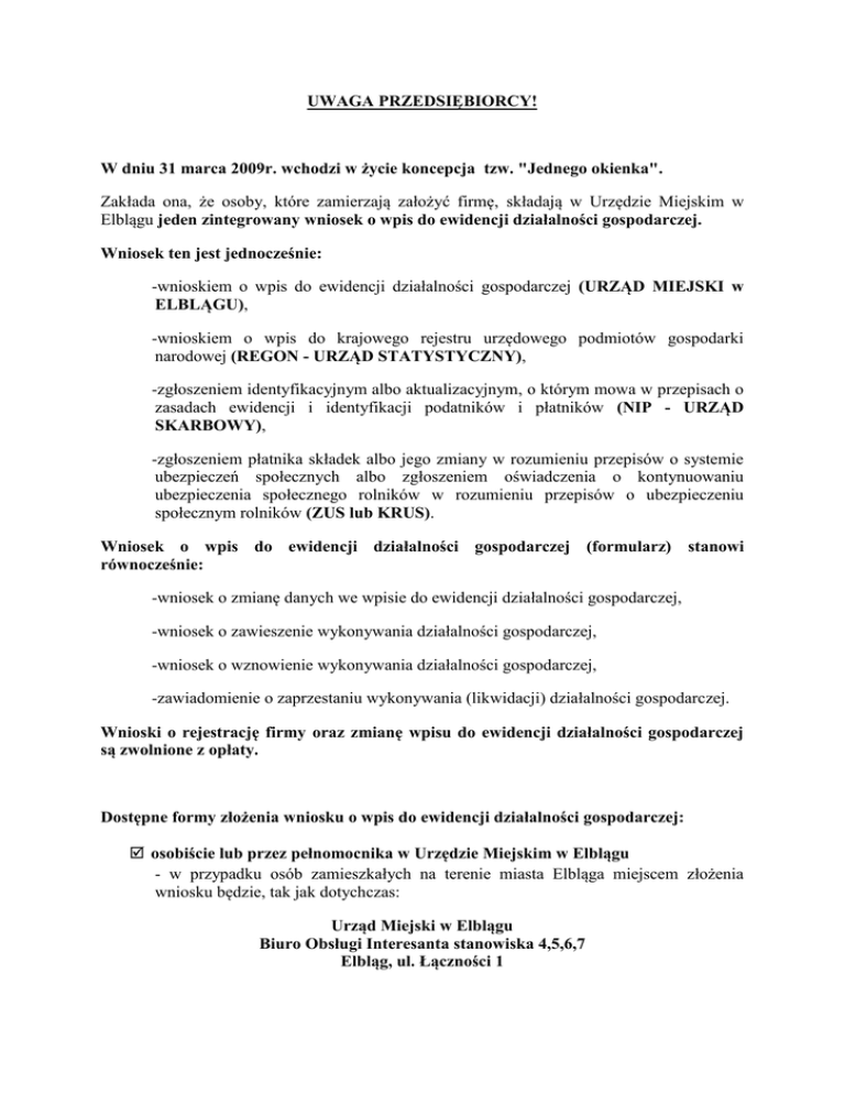 UWAGA PRZEDSIĘBIORCY! W dniu 31 marca 2009r. wchodzi w życie koncepcja tzw. "Jednego okienka". Zakłada ona, że osoby, które zamierzają założyć firmę, składają w Urzędzie Miejskim w Elblągu jeden zintegrowany wniosek o wpis do ewidencji działalności gospodarczej. Wniosek ten jest jednocześnie: -wnioskiem o wpis do ewidencji działalności gospodarczej (URZĄD MIEJSKI w ELBLĄGU), -wnioskiem o wpis do krajowego rejestru urzędowego podmiotów gospodarki narodowej (REGON - URZĄD STATYSTYCZNY), -zgłoszeniem identyfikacyjnym albo aktualizacyjnym, o którym mowa w przepisach o zasadach ewidencji i identyfikacji podatników i płatników (NIP - URZĄD SKARBOWY), -zgłoszeniem płatnika składek albo jego zmiany w rozumieniu przepisów o systemie ubezpieczeń społecznych albo zgłoszeniem oświadczenia o kontynuowaniu ubezpieczenia społecznego rolników w rozumieniu przepisów o ubezpieczeniu społecznym rolników (ZUS lub KRUS). Wniosek o wpis do ewidencji działalności gospodarczej (formularz) stanowi równocześnie: -wniosek o zmianę danych we wpisie do ewidencji działalności gospodarczej, -wniosek o zawieszenie wykonywania działalności gospodarczej, -wniosek o wznowienie wykonywania działalności gospodarczej, -zawiadomienie o zaprzestaniu wykonywania (likwidacji) działalności gospodarczej. Wnioski o rejestrację firmy oraz zmianę wpisu do ewidencji działalności gospodarczej są zwolnione z opłaty. Dostępne formy złożenia wniosku o wpis do ewidencji działalności gospodarczej: osobiście lub przez pełnomocnika w Urzędzie Miejskim w Elblągu - w przypadku osób zamieszkałych na terenie miasta Elbląga miejscem złożenia wniosku będzie, tak jak dotychczas: Urząd Miejski w Elblągu Biuro Obsługi Interesanta stanowiska 4,5,6,7 Elbląg, ul. Łączności 1 listownie - w tym przypadku będzie istniała konieczność notarialnego poświadczenia podpisu, elektronicznie - za pośrednictwem formularza on-line dostępnego na stronie internetowej Urzędu Miejskiego w Elblągu: 1. jeżeli wniosek o wpis zostanie podpisany podpisem elektronicznym będą miały zastosowanie przepisy o informatyzacji działalności podmiotów realizujących zadania publiczne, 2. jeżeli wniosek nie zostanie podpisany podpisem elektronicznym, organ (Prezydent Miasta Elbląg poprzez Wydział Rozwoju Przedsiębiorczości) zawiadamia przedsiębiorcę o terminie i miejscu podpisania wniosku; w takim przypadku dniem złożenia wniosku jest dzień, w którym przedsiębiorca podpisał wniosek. Wzór wniosku o wpis do ewidencji działalności gospodarczej (w tym elektroniczny) określa Rozporządzenie Rady Ministrów z dnia 24 marca 2009r. (Dz. U. z 2009r. nr 50 poz. 399). Podstawa prawna: ustawa z dnia 19 grudnia 2008r. o zmianie ustawy o swobodzie działalności gospodarczej oraz o zmianie niektórych innych ustaw (Dz. U. z 2009 r. Nr 18, poz. 97). Szczegółowe informacje na temat procedur związanych z działalnością gospodarczą oraz formularze wniosków będą dostępne na stronie od dnia 10 kwietnia 2009r. Informacji o aktualnych przepisach z zakresu rejestracji działalności gospodarczej udziela: Urząd Miejski w Elblągu Wydział Rozwoju Przedsiębiorczości Biuro Obsługi Interesanta stanowiska 4,5,6,7 ul. Łączności 1 82-300 Elbląg kontakt telefoniczny 0 .. 55 237 – 47 – 53 ,54, 55, 56 od poniedziałku do piątku 7.30 do 15.30 w środy 7.30 – 16.30