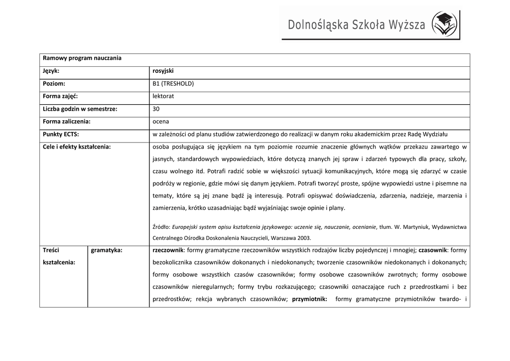 Ramowy program nauczania Język: rosyjski Poziom: B1