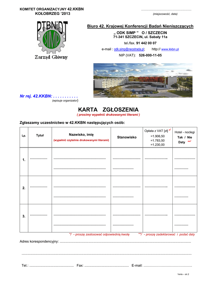 KOMITET ORGANIZACYJNY 42.KKBN ................................................................. KOŁOBRZEG ‘2013 (miejscowość, data) Biuro 42. Krajowej Konferencji Badań Nieniszczących „ ODK SIMP ” O / SZCZECIN 71-341 SZCZECIN, ul. Sabały 11a tel./fax. 91 442 00 07 e-mail : [email protected]; http:// www.kkbn.pl NIP (VAT): 526-000-11-05 Nr rej. 42.KKBN: . . . . . . . . . . . (wpisuje organizator) KARTA ZGŁOSZENIA ( prosimy wypełnić drukowanymi literami ) Zgłaszamy uczestnictwo w 42.KKBN następujących osób: Lp. Tytuł Nazwisko, imię (wypełnić czytelnie drukowanymi literami) 1. 2. 3. …………… …………… …………… Opłata z VAT [zł] * =1.906,50 =1.783,50 =1.230,00 Stanowisko ……………………………………… …………………… ……………………………………… ……………… ……………………………………… …………………… ……………………………………… ……………… ……………………………………… …………………… ……………………………………… ……………… */ - proszę zastosować odpowiednią kwotę ……………….. / Hotel - noclegi Tak / Nie Daty ** / ……………… ………… ……………….. ……………… ………… ……………….. ……………… ………… **/ - proszę zadeklarować i podać daty Adres korespondencyjny: ........................................................................................................................................ ................................................................................................................................................................................ Tel.: .............................................. Fax: .............................................. E-mail: …………………………………… Verte – str.2 Adres, na który należy wystawić i wysłać fakturę VAT: ………………………………………………………………… ……………………………………………………………………………………………………………………………….... ……………………………………………………………… nr NIP zakładu uczestnika ………………………………. Zamierzam przedstawić referat (autor / autorzy, tytuł): ………………………………………………………………….. ................................................................................................................................................................................ ………………………………………………………………………………………………………………………………… Referat zamierzam wygłosić na sesji plenarnej / plakatowej (niepotrzebne skreślić) W przypadku potwierdzenia przez Organizatora przyjęcia na Konferencję zobowiązuję się dokonać wpłaty łącznej kwoty = ………………… zł (wg tab. na str. 1) za uczestnictwo zgłoszonych osób w 42.KKBN w terminie 21 dni od daty otrzymania potwierdzenia, jednak nie później niż do 10 września 2013. Przekazanie należności za udział w 42.KKBN nastąpi w terminie do 10.09.2013 przelewem na konto: „ODK SIMP” O/Szczecin, ul. Sabały 11a, 71-341 Szczecin Bank: PEKAO S.A. I/O Szczecin, Rachunek nr: 15 1240 3813 1111 0000 4375 7370 Organizatorzy prześlą fakturę w terminie 14 dni od daty wpływu należności na konto bankowe jw. lub będzie można ją odebrać podczas 42.KKBN w Biurze Konferencji. Potwierdzenie uczestnictwa przez organizatorów i wniesiona opłata konferencyjna rezerwuje noclegi: 14/15; 15/16 i 16/17.10.2013 (zakwaterowanie w dn. 14.10. od godz. 16:00 do 17.10 do godz. 14:00). Opłata konferencyjna obejmuje udział w sesjach, materiały konferencyjne, zwiedzanie wystawy i inne imprezy wg programu oraz noclegi, śniadania, obiady i kolacje, a także korzystanie z kompleksu basenów. Kolejność wpłat decyduje o przyjęciu zgłoszenia i rezerwacji. Komitet Organizacyjny nie gwarantuje uczestnictwa w Konferencji w przypadku nie dokonania wpłaty w terminie. Ze względu na ograniczoną ilość miejsc hotelowych jesteśmy w stanie zagwarantować limitowaną liczbę pokoi jednoosobowych. Osoby zgłaszające swój udział po w/w terminach zgłoszeń mogą być zakwaterowane tylko w przypadku wolnych miejsc w Hotelu „AQUARIUS” lub w innym hotelu wskazanym przez organizatorów. WYSTAWA – Zgłaszamy udział w wystawie zgodnie ze złożonym zamówieniem. Wielkość stoiska ........................ [m2] , Moduł stoiska ............ . Wyposażenie dodatkowe: ………… zł. Całkowity koszt stoiska wynosi = ……….……… , … zł. Przekazanie należności za udział w WYSTAWIE w kwocie jw. nastąpi w terminie do 10.09.2013 przelewem na konto: „ODK SIMP” O/Szczecin, ul. Sabały 11a, 71-341 Szczecin Bank: PEKAO S.A. I/O Szczecin, Rachunek nr: 15 1240 3813 1111 0000 4375 7370 Organizatorzy prześlą fakturę w terminie 14 dni od daty wpływu należności na konto bankowe jw. lub będzie można ją odebrać podczas 42.KKBN w Biurze Konferencji. Prosimy wystawców o przygotowanie i nadesłanie informacji o swojej firmie i/lub ofercie na 1 stronie formatu A4 w celu umieszczenia jej w Biuletynie Wystawców. Wystąpienie na sesji wystawców należy zgłosić w Biurze Konferencji przy rejestracji oraz opracować je w formie prezentacji komputerowej tak, aby prezentacja była zwięzła i rzeczowa (nazwa firmy, lista nowych i najważniejszych eksponatów, lokalizacja stoiska, zaproszenie), a jej przedstawienie nie było dłuższe niż 5÷8 minut. UWAGA : Rezygnację z udziału w Konferencji należy zgłosić pisemnie najpóźniej do dnia 15 sierpnia 2013 ( uczestnicy i wystawcy ) na adres Biura 42.KKBN w Szczecinie. Rezygnacja po tym terminie spowoduje obciążenie zakładu uczestnika w pełnej wysokości. Hotel „AQU