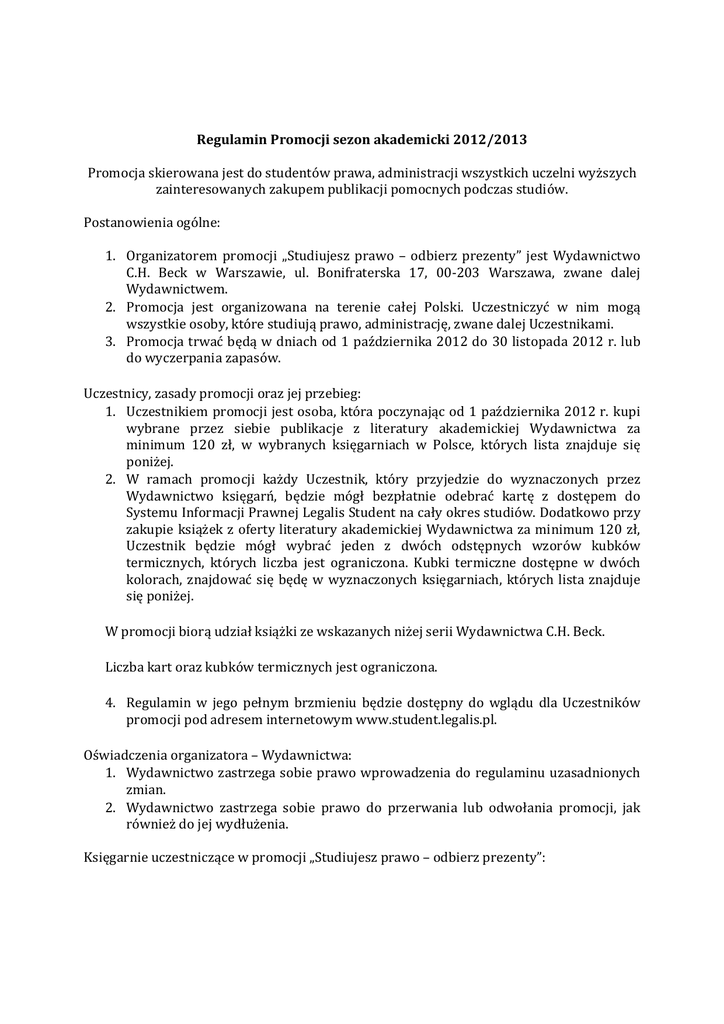 Regulamin Promocji sezon akademicki 2012/2013 Promocja skierowana jest do studentów prawa, administracji wszystkich uczelni wyższych zainteresowanych zakupem publikacji pomocnych podczas studiów. Postanowienia ogólne: 1. Organizatorem promocji „Studiujesz prawo – odbierz prezenty” jest Wydawnictwo C.H. Beck w Warszawie, ul. Bonifraterska 17, 00-203 Warszawa, zwane dalej Wydawnictwem. 2. Promocja jest organizowana na terenie całej Polski. Uczestniczyć w nim mogą wszystkie osoby, które studiują prawo, administrację, zwane dalej Uczestnikami. 3. Promocja trwać będą w dniach od 1 października 2012 do 30 listopada 2012 r. lub do wyczerpania zapasów. Uczestnicy, zasady promocji oraz jej przebieg: 1. Uczestnikiem promocji jest osoba, która poczynając od 1 października 2012 r. kupi wybrane przez siebie publikacje z literatury akademickiej Wydawnictwa za minimum 120 zł, w wybranych księgarniach w Polsce, których lista znajduje się poniżej. 2. W ramach promocji każdy Uczestnik, który przyjedzie do wyznaczonych przez Wydawnictwo księgarń, będzie mógł bezpłatnie odebrać kartę z dostępem do Systemu Informacji Prawnej Legalis Student na cały okres studiów. Dodatkowo przy zakupie książek z oferty literatury akademickiej Wydawnictwa za minimum 120 zł, Uczestnik będzie mógł wybrać jeden z dwóch odstępnych wzorów kubków termicznych, których liczba jest ograniczona. Kubki termiczne dostępne w dwóch kolorach, znajdować się będę w wyznaczonych księgarniach, których lista znajduje się poniżej. W promocji biorą udział książki ze wskazanych niżej serii Wydawnictwa C.H. Beck. Liczba kart oraz kubków termicznych jest ograniczona. 4. Regulamin w jego pełnym brzmieniu będzie dostępny do wglądu dla Uczestników promocji pod adresem internetowym www.student.legalis.pl. Oświadczenia organizatora – Wydawnictwa: 1. Wydawnictwo zastrzega sobie prawo wprowadzenia do regulaminu uzasadnionych zmian. 2. Wydawnictwo zastrzega sobie prawo do przerwania lub odwołania promocji, jak również do jej wydłużenia. Księgarnie uczestniczące w promocji „Studiujesz prawo – odbierz prezenty”: BIAŁYSTOK Księgarnia Prawnicza „Dom Książki” GDAŃSK Uniwersytecka Księgarnia Arche KATOWICE Księgarnia Facultas Iuridica KRAKÓW Księgarnia E.P. Kopacz LUBLIN Księgarnia Iuris Prudentia ŁÓDŹ Księgarnia PWN OLSZTYN Książnica Polska Centrum Książki POZNAŃ Księgarnia Fundacji UAMWPiA RZESZÓW Księgarnia Iuris Prudentia SZCZECIN Księgarnia Akademicka TORUŃ Księgarnia UMK WARSZAWA Księgarnia PROFIT Księgarnia Naukowa Księgarnia Wydawnictwa C.H. Beck WROCŁAW Księgarnia PWN ul. A. Mickiewicza 32, 15-232 Białystok ul. J. Bażyńskiego 6, 80-309 Gdańsk ul. Bankowa 11, 40-007 Katowice Pl. Wszystkich Świętych 6, 31-004 Kraków Pl. M. Skłodowskiej-Curie 5, 20-031 Lublin ul. S. Kopcińskiego 31, 90-142 Łódź Pl. Jana Pawła II 2/3, 10-959 Olsztyn Al. Niepodległości 53, 61-806 Poznań ul. J. Sobieskiego 2d/2, 35-002 Rzeszów ul. G. Narutowicza 17, 70-240 Szczecin ul. M. Reja 25, 87-100 Toruń Pl. Defilad 1 (stacja metra Centrum, paw. 2002 D), 00-110 Warszawa Al. Solidarności 83/89, Warszawa ul. Bonifraterska 17, 00-203 Warszawa ul. Kuźnicza 56, 50-382 Wrocław Serie Wydawnictwa, które biorą udział w promocji: - Studia Prawnicze - Podręczniki Prawnicze - Skrypty Becka - Akademia Prawa - Wykłady Becka - Repetytoria C.H. Beck - Ćwiczenia Becka - Zbiory Orzecznictwa Becka Kazusy Becka Plansze Becka Testy Becka Teksty Ustaw Becka Twoje Prawo Testy Aplikacyjne Aplikacje Prawnicze w pytaniach i odpowiedziach Kodeks System REKLAMACJE 1. Reklamacje związane z udziałem w Promocji „Studiujesz prawo – odbierz prezenty” Uczestnik może składać najpóźniej w terminie 7 dni od dnia jej zakończenia: a. telefonicznie na numer 22 33 77 678 b. drogą elektroniczną, na adres: [email protected] c. pisemnie na adres Wydawnictwa C.H. Beck: ul. Bonifraterska 17 00-203 Warszawa P. Monika Jarek 2. W przypadku reklamacji złożonych drogą pocztową, o zachowaniu przez Uczestnika terminu do wniesienia reklamacji decyduje data stempla pocztowego. 3. Reklamacja powinna zawierać: imię, nazwisko, PESEL, adres do korespondencji, jak również opis podstawy reklamacji. 4. Reklamacje nie zawierające wymagań określonych w punkcie 3 nie będą rozpatrywane przez Wydawnictwo. 5. Prawidłowo złożone reklamacje rozpatrywane będą w terminie 31.12.2012 r. dni od dnia ich otrzymania przez Wydawnictwo. 6. O wyniku postępowania reklamacyjnego Uczestnik zostanie powiadomiony pocztą elektroniczną lub telefonicznie. 7. Reklamacje dotyczące korzystania z SIP Legalis Student reguluje paragraf 10 OWU w modelu fakturowania jednorazowego dostępny na stronie www.legalis.pl. Regulamin dostępny jest na stronie www.student.legalis.pl
