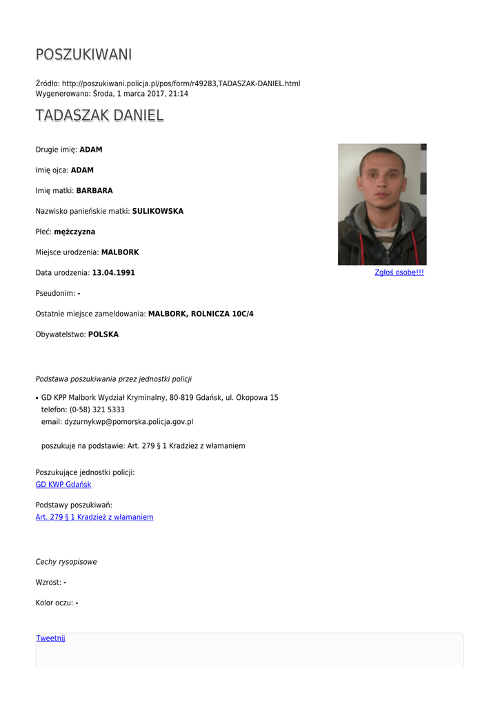 POSZUKIWANI Źródło: http://poszukiwani.policja.pl/pos/form/r49283,TADASZAK-DANIEL.html Wygenerowano: Środa, 1 marca 2017, 21:14 TADASZAK DANIEL Drugie imię: ADAM Imię ojca: ADAM Imię matki: BARBARA Nazwisko panieńskie matki: SULIKOWSKA Płeć: mężczyzna Miejsce urodzenia: MALBORK Data urodzenia: 13.04.1991 Pseudonim: Ostatnie miejsce zameldowania: MALBORK, ROLNICZA 10C/4 Obywatelstwo: POLSKA Podstawa poszukiwania przez jednostki policji ● GD KPP Malbork Wydział Kryminalny, 80-819 Gdańsk, ul. Okopowa 15 telefon: (0-58) 321 5333 email: [email protected] poszukuje na podstawie: Art. 279 § 1 Kradzież z włamaniem Poszukujące jednostki policji: GD KWP Gdańsk Podstawy poszukiwań: Art. 279 § 1 Kradzież z włamaniem Cechy rysopisowe Wzrost: Kolor oczu: - Tweetnij Zgłoś osobę!!!