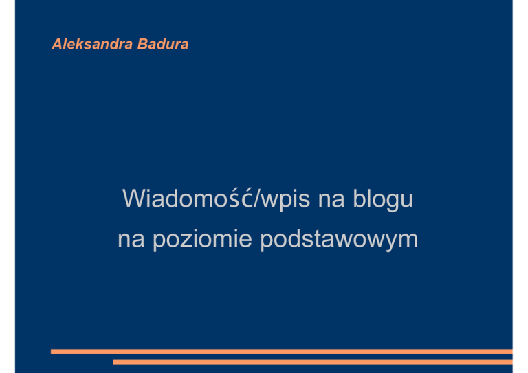 Aleksandra Badura Wiadomość/wpis na blogu na poziomie podstawowym Blog może być miejscem gdzie piszesz o swoich pasjach (malowanie, muzyka, podróżowanie itp.), gdzie prowadzisz poradnik dla czytelników (podajesz instrukcje), relacjonujesz wydarzenia z życia prywatnego (wyjazdy, interesujące spotkania), a także wyrażasz swoje poglądy (polityczne, religijne itp.) Początek wiadomości jest podany w zestawie maturalnym i nie będzie liczony do wymaganej ilości słów(80-130), Zadaniem Twoim będzie odniesienie się do każdego z czterech wymaganych punktów polecenia oraz rozwinięcie każdego z nich, Koniec wiadomości, podobnie jak początek, będzie podany. Wskazówki Używaj zróżnicowanych struktur gramatycznych i bogatego słownictwa, Używaj języka nieformalnego, Stosuj łączniki zdaniowe(so, therefore...)- sprawiają one, że Twoja praca nabierze spójności, Kontroluj liczbę używanych słów, w tym celu podziel maksymalną liczbę słów na cztery paragrafy i sprawdzaj czy zbytnio nie przekroczyłeś limitu, Wykorzystuj zwroty charakterystyczne dla wpisu na blogu, Przed zakończeniem pracy upewnij się czy odniosłeś się do wszystkich wymaganych czterech punktów oraz je rozwinąłeś. Zwroty do wykorzystania w wiadomości/wpisie na blogu Guess what happened! – Nie uwierzycie, co się stało! I’m writing this post to tell you that … – piszę ten post, aby Wam powiedzieć, że … I want to find out about … – chcę się czegoś dowiedzieć na temat … I wondered if you could help me – zastanawiam się, czy możecie mi pomóc. Could you tell me what I should do? – możecie powiedzieć mi, co mam zrobić? One advantage / disadvantage of … is … – jedną z zalet / wad … jest I feel very strongly that … – uważam zdecydowanie, że … From my point of view,… – moim zdaniem However, I have to point out that … – muszę jednak zaznaczyć, że … What I remember most is … – to, co najbardziej pamiętam to It’s hard to believe but then I felt – trudno w to uwierzyć, ale wtedy czułam się … The majority of people believes... – większość ludzi uważa że... How about …? – co powiecie na …? I’m looking forward to your comments – czekam na wasze komentarze