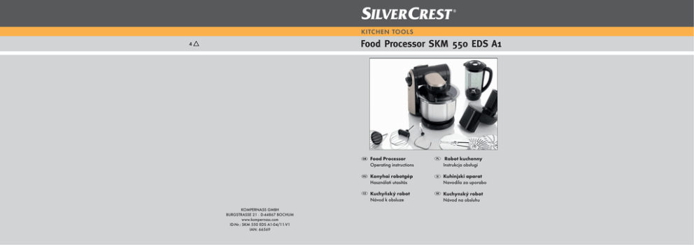 KITCHEN TOOLS Food Processor SKM 550 EDS A1 4 KOMPERNASS GMBH BURGSTRASSE 21 · D-44867 BOCHUM www.kompernass.com ID-Nr.: SKM 550 EDS A1-04/11-V1 IAN: 66569 Food Processor Operating instructions Robot kuchenny Instrukcja obsługi Konyhai robotgép Használati utasítás Kuhinjski aparat Navodila za uporabo Kuchyňský robot Návod k obsluze Kuchynský robot Návod na obsluhu q w w q q w q w q e r d f s a u y g h j o i t l k w CONTENT PAGE Safety Notices 2 Intended Use 2 Technical data 3 Items supplied 3 Appliance description 3 Taking into use 3 Operating positions 4 Working with kneading hooks, beaters and whisks 4 Working with the food processor 5 Working with the mixer 6 Cleaning and care 7 Troubleshooting 7 Disposal 8 Warranty & Service 8 Importer 8 Recommended filling quantities 9 Read the operating instructions carefully before using the device for the first time and preserve this booklet for later reference. Pass this manual on to whoever might acquire the device at a future date. -1- FOOD PROCESSOR Warning: Never submerse the appliance in water or other liquids. Danger of electrical shock! Safety Notices • • • • • • • • Risk of personal injuries! • Caution: the cutting and rasping discs and the mixing knives are very sharp! • Take care with their installation and removal, as well as when cleaning them! • Attention: When the machine is running, only insert into the mixing bowl, food processor or the mixer the ingredients to be processed. • To avoid personal injury and damage to the appliance, NEVER insert or place your hands or foreign objects into the loading shaft or in the mixer. • Only exchange accessories when the drive has come to a complete standstill. • After being switched off, the drive continues to run for a short time! • NEVER leave the appliance unsupervised. Danger of electrical shock! Ensure that the power supply to be used tallies with the details on the model details plate. Ensure that the power cable never becomes wet or moist whilst in use. Always place the power cable so that it cannot be trapped or otherwise sustain damage. Do not allow the power cable to hang from the work area. Should the power cable or plug be damaged, to avoid possibly life threatening risks immediately arrange for it to be replaced by qualified specialists or the customer services department. Remove the plug from the wall socket when the appliance is not in use, before cleaning it and if it malfunctions. Switching off the appliance is not sufficient because the appliance receives power as long as the power plug is connected to the socket. You can thus avoid unintentional switch on of the appliance. After power outages the appliance continues to run! Do not operate the appliance without ingredients. Risk of overheating! This appliance is not intended for use by individuals (including children) with restricted physical, physiological or intellectual abilities or defi ciences in experience and/or knowledge unless they are supervised by a person responsible for their safety or receive from this person instruction in how the appliance is to be used. Children should be supervised to ensure that they do not play with the appliance. Intended Use The appliance is intended for the processing of foodstuffs in private domestic quantities and intended only for use in private houselholds, in enclosed spaces protected from the elements. The appliance is not intended for use in commercial or industrial applications or for use outdoors. The appliance may only be used with original accessories. -2- Technical data Appliance description Mains voltage: Power consumption: max. capacity Mixing bowl: Mixer: q Kneading hooks with dough deflecter w Mixing beater e Whisk r Mixer with lid and funnel t Accessory holder y Mixing bowl with lid u Food processor i Rubbing disc o Rasper turning disc a Drive shaft for food processor s Cutter turning disc d Lid with stodger for the food processor f Unlocking button g Turn switch h Swivel arm j Drive motor k Recesses for the mixing bowl l Cable storage compartment 220 240 V / 50 Hz 550 W ca. 3,8 l ca. 1 l Items supplied Food Processor Stainless steel mixing bowl with lid Mixer with lid and funnel Food processor with stodger Cutter turning disc (thick and thin) Rasper turning disc (coarse and medium fine) Rubbing disc (fine) Kneading hooks with dough deflecter Beater Whisk Accessory holder Assembly material Operating Instructions Taking into use • Before taking the appliance into use, check that all listed items are present and that there are no visible damages on/to them. • Remove all packaging materials and stickers from the appliance. • Before the first usage thoroughly clean all com ponent parts as described in the section „Cleaning and care“. • Place the appliance on a flat and clean surface. • Secure the appliance to the surface with the four suction discs. • Remove the power cable from the cable storage compartment l. • Insert the plug into the power socket. Take note: One of the cutting discs for the food processor is already pre installed in the food processor on delivery! -3- Operating positions 3 To prepare the appliance for work with kneading hooks q, beaters w and whisk e, proceed as follows: • Press the unlocking button f and bring the swivel arm h into operating position 4 (see chapter „Operating positions“) (Fig. ). • Insert the mixing bowl y. The base of the mixing bowl y must engage in the recesses k on the appliance. • Press the unlocking button f and bring the swivel arm h into operating position 1 (see chapter „Operating positions“) (Fig. ). • Place and hold turn switch g in position P, until the drive motor j remains stationary in the park position (Fig. ). Should the drive motor not move it is already at the park position. • Press the unlocking button f and bring the swivel arm h into operating position 4 (see chapter „Operating positions“) (Fig. ). • Depending on the task to be perf
