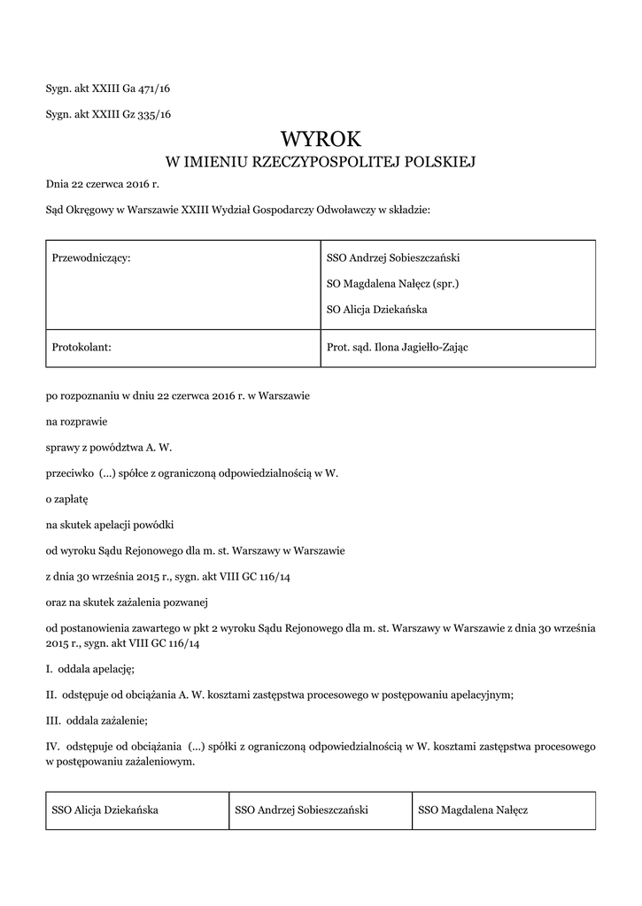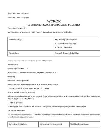 Sygn. akt XXIII Ga 471/16 Sygn. akt XXIII Gz 335/16 WYROK W IMIENIU RZECZYPOSPOLITEJ POLSKIEJ Dnia 22 czerwca 2016 r. Sąd Okręgowy w Warszawie XXIII Wydział Gospodarczy Odwoławczy w składzie: Przewodniczący: SSO Andrzej Sobieszczański SO Magdalena Nałęcz (spr.) SO Alicja Dziekańska Protokolant: Prot. sąd. Ilona Jagiełło-Zając po rozpoznaniu w dniu 22 czerwca 2016 r. w Warszawie na rozprawie sprawy z powództwa A. W. przeciwko (...) spółce z ograniczoną odpowiedzialnością w W. o zapłatę na skutek apelacji powódki od wyroku Sądu Rejonowego dla m. st. Warszawy w Warszawie z dnia 30 września 2015 r., sygn. akt VIII GC 116/14 oraz na skutek zażalenia pozwanej od postanowienia zawartego w pkt 2 wyroku Sądu Rejonowego dla m. st. Warszawy w Warszawie z dnia 30 września 2015 r., sygn. akt VIII GC 116/14 I. oddala apelację; II. odstępuje od obciążania A. W. kosztami zastępstwa procesowego w postępowaniu apelacyjnym; III. oddala zażalenie; IV. odstępuje od obciążania (...) spółki z ograniczoną odpowiedzialnością w W. kosztami zastępstwa procesowego w postępowaniu zażaleniowym. SSO Alicja Dziekańska SSO Andrzej Sobieszczański SSO Magdalena Nałęcz Sygn. akt: XXIII Ga 471/16 Sygn. akt: XXIII Gz 335/16 UZASADNIENIE Powódka A. W. pozwem z dnia 13 stycznia 2014r. wniosła o zobowiązanie pozwanego (...) sp. z o.o. do złożenia oświadczenia woli o następującej treści: (...) sp. z o.o. oświadcza, że rozwiązuje ze skutkiem na dzień 7 stycznia 2014r. umowę najmu z dnia 5 listopada 2009r., zawartą z A. W. prowadzącą działalność gospodarczą pod nazwą A&S F. (...) A. W., zmienioną aneksem z dnia 12 kwietnia 2012r.” oraz wniosła o zasądzenie kosztów procesu. W odpowiedzi na pozew pozwany wniósł o oddalenie powództwa. Pismem z dnia 19 listopada 2014r. powódka dodatkowo wniosła żądanie ewentualne rozwiązania przez Sąd na podstawie art. 3571 k.c. zawartej pomiędzy (...) sp. z o.o. a A. W. umowy najmu z dnia 5 listopada 2009r., zmienionej aneksem z dnia 12 kwietnia 2011r. Wyrokiem z dnia 30 września 2015r. Sąd Rejonowy dla m.st. Warszawy w Warszawie oddalił powództwo oraz odstąpił od obciążania powódki kosztami procesu. Sąd Rejonowy powyższe rozstrzygnięcie oparł na następujących ustaleniach stanu faktycznego oraz jego ocenie prawnej. W dniu 5 listopada 2009 r. powódka zawarła z M. I. (A. M. I.) umowę najmu lokalu użytkowego nr (...) o powierzchni 33,67 m2 w budynku handlowym w K. tj. Galerii Handlowej (...) na czas określony 5 lat od dnia przekazania przedmiotu najmu. W dacie zawierania umowy trwał już od roku kryzys finansowy (recesja), który rozpoczął się w Europie Zachodniej w III kwartale 2008 r., a w Stanach Zjednoczonych w IV kwartale 2008 r. W początkowej fazie kryzysu Polska nie odczuła bezpośrednio jego skutków, jednak w miarę pogłębiania się kryzysu zaczął on także wypływać na gospodarkę polską. W dniu 22 grudnia 2010 r. pozwany (...) sp. z o.o. wstąpił w prawa wynajmującego i w dniu 12 kwietnia 2011 r. powódka i pozwany podpisali aneks do umowy najmu wydłużający czas trwania umowy do 6 lat, a powódka wyraziła zgodę na zmianę lokalu użytkowego, przy zachowaniu dotychczasowych stawek czynszu, na lokal nr (...). Pozostałe warunki najmu pozostały bez zmian. Umowa najmu z dnia 5 listopada 2009 r. nie przewidywała możliwości jej wypowiedzenia przez najemcę poza wypadkiem nieubezpieczenia Galerii Handlowej przez wynajmującego. Przedmiotowa umowa przewidywała natomiast możliwość wypowiedzenia umowy najmu przez wynajmującego w sytuacji: zalegania z płatnością czynszu lub opłat eksploatacyjnych za co najmniej 2 miesiące, nie uzyskania albo utraty przez najemcę zezwoleń lub koncesji niezbędnych do prowadzenia w przedmiocie najmu działalności handlowej, używania przedmiotu najmu pomimo pisemnego upomnienia w innym celu aniżeli w celu działalności handlowej, używania przedmiotu najmu przez najemcę, dostawców najemcy, osoby trzecie w przedmiocie najmu, pomimo pisemnego upomnienia ze strony wynajmującego w sposób uciążliwy, podnajęcia lub oddania innej osobie przez najemcę przedmiotu najmu bez zgody wynajmującego, gdy najemca przeniesie na osobę trzecią przedsiębiorstwo najemcy lub jego zorganizowaną część, nagminnego opóźniania się najemcy w płatnościach, nie rozpoczęcia działalności handlowej w przedmiocie najmu, zaprzestania lub ograniczenia prowadzenia w przedmiocie najmu działalności handlowej określonej w umowie, nie ubezpieczenia przez najemcę przedmiotu najmu zgodnie z umową. Zgodnie z § 13 umowy powódka jako najemca zobowiązana była przez cały okres najmu nieprzerwanie używać przedmiotu najmu zgodnie z przeznaczeniem i prowadzić na całej jego powierzchni działalność handlową polegającą wyłącznie na sprzedaży odzieży damskiej i męskiej (§ 3 pkt 7) oraz do uzyskania wymaganych prawem zezwoleń i koncesji. Działalność powódki polegająca na sprzedaży odzieży damskiej i męskiej opierała się na umowach agencyjnych zawartych dnia 5 grudnia 2009 r. z A. P. W., Z. G. Sp. j. oraz z dnia 17 października 2012 r. (...) sp. z o.o. Pismem z dnia 9 września 2013 r. A. P. W., Z. G. Sp. j. wypowiedziała A. W. umowę agencyjną z dnia 5 grudnia 2009 r. ze skutkiem na dzień 13 września 2013 r. z powodu niewywiązywania się przez agenta z umowy tj. opóźnień w regulowaniu należności wynikających z umowy. Następnie pismem z dnia 20 grudnia 2013 r. (...) sp. z o.o. wypowiedziała A. W. umowę agencyjną ze skutkiem na dzień 7 stycznia 2014 r. na skutek nieosiągania w ciągu 3 kolejnych miesięcy kalendarzowych limitu sprzedaży towarów w wysokości 15.000 zł netto miesięcznie. Powyższe okoliczności stanowiły przyczynę zwrócenia się przez powódkę do wynajmującego o rozwiązanie umowy najmu z dnia 5 listopada 2009 r. z dniem 7 stycznia 2014 r. Powódka zwróciła się do pozwanego pismami 