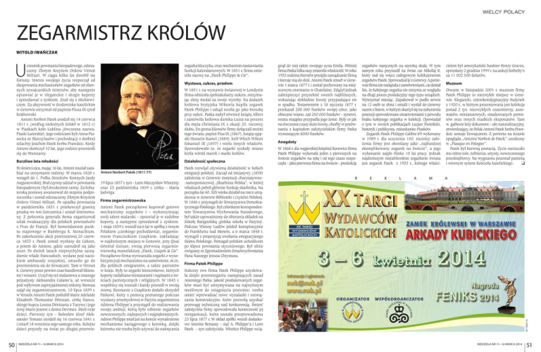 WIELCY POLACY ZEGARMISTRZ KRÓLÓW WITOLD IWAŃCZAK zegarka kluczyka, oraz mechanizm nastawiania funkcji kalendarzowych. W 1851 r. firma zmieniła nazwę na „Patek Philippe & Cie”. Burzliwe lata młodości Działalność społeczna Po śmierci ojca, mając 16 lat, Antoni musiał zarabiać na utrzymanie rodziny. W marcu 1828 r. wstąpił do 1. Pułku Strzelców Konnych Jazdy Augustowskiej. Brał czynny udział w powstaniu listopadowym i był dwukrotnie ranny. Za bohaterską postawę awansował do stopnia podporucznika i został odznaczony Złotym Krzyżem Orderu Virtuti Militari. Po upadku powstania w październiku 1831 r. przekroczył granicę pruską we wsi Gorczenica i został internowany. Z polecenia generała Bema organizował szlak ewakuacyjny dla polskich powstańców z Prus do Francji. Był komendantem punktu etapowego w Bambergu k. Monachium. Po zakończeniu akcji przerzutowej 25 czerwca 1833 r. Patek został wysłany do Cahors, a potem do Amiens, gdzie zatrudnił się jako zecer. Po dwóch latach nieprzychylne zarządzenie władz francuskich, wydane pod naciskiem ambasady rosyjskiej, zmusiło go do przeniesienia się do Szwajcarii. Tam w Veroux k. Genewy przez pewien czas handlował likierami i winami. Uczył się też malarstwa u znanego pejzażysty Aleksandra Calame’a, aż wreszcie pod wpływem zaprzyjaźnionej rodziny Moreau zajął się zegarmistrzostwem. 10 lipca 1839 r. w Versoix Antoni Patek poślubił Marie Adelaide Elisabeth Thomasine Dénizart, córkę francuskiego kupca Louisa Dénizarta z Turynu i jego żony Marie Jeanne z domu Devimes. Mieli troje dzieci. Pierwszy syn – Bolesław Józef Aleksander Tomasz urodził się 16 czerwca 1841 r. i zmarł 18 września tego samego roku. Kolejne dzieci przyszły na świat po długiej przerwie: 50 NIEDZIELA NR 11 • 16 MARCA 2014 Wystawa, sukces, przełom W 1851 r. na wystawie światowej w Londynie firma odniosła spektakularny sukces, otrzymując złoty medal za swoje wyroby. Na dodatek królowa brytyjska Wiktoria kupiła zegarek Patek Philippe i odtąd nosiła go jako broszkę przy sukni. Patka nabył również książę Albert i zamówiła królowa duńska Luiza na prezent dla męża Christiana IX z okazji 25. rocznicy ślubu. Do grona klientów firmy dołączali możni tego świata: papież Pius IX (1867), książę egipski Hussein Kamel (1884), król Włoch Wiktor Emanuel III (1897) i wielu innych władców. Spowodowało to, że zegarki zyskały miano króla wśród marek i marki królów. Antoni Norbert Patek (1811-77) 19 lipca 1857 r. syn – Leon Mieczysław Wincenty oraz 23 października 1859 r. córka – Maria Jadwiga. Firma zegarmistrzowska Antoni Patek początkowo kupował gotowe mechanizmy zegarków i – wykorzystując swój talent malarski – oprawiał je w ozdobne koperty, a następnie sprzedawał z zyskiem. 1 maja 1839 r. wszedł na 6 lat w spółkę z innym Polakiem (czeskiego pochodzenia), zegarmistrzem Franciszkiem Czapkiem, zakładając w najdroższym miejscu w Genewie, przy Quai Général Guisan, swoją pierwszą zegarmistrzowską manufakturę „Patek, Czapek & Cie”. Początkowo firma wytwarzała zegarki o wysokiej precyzji mechanizmu na zamówienie, m.in. dla polskich emigrantów, a także patriotów w kraju. Były to zegarki kieszonkowe, których koperty ozdabiano miniaturami i napisami o treściach patriotycznych i religijnych. W 1845 r. wspólnicy się rozstali i każdy poszedł w swoją stronę. Rozstanie z Czapkiem dodało skrzydeł Patkowi, który z pomocą poznanego podczas wystawy przemysłowej w Paryżu zegarmistrza Adriena Philippe’a przystąpił do realizowania swojej ambicji, którą było robienie zegarków nowoczesnych, najlepszych i najpiękniejszych. Adrien Philippe miał już na koncie wynalezienie mechanizmu naciągowego z koronką, dzięki któremu nie trzeba było używać do nakręcania Patek rozwijał ożywioną działalność w kołach emigracji polskiej. Zaczął od inicjatywy (1838) założenia w Genewie instytucji charytatywno-samopomocowej „Skarbuna Polska”, w której władzach pełnił głównie funkcję skarbnika. Na początku lat 40. XIX wieku działał na rzecz urządzenia w Genewie Biblioteki i Czytelni Polskiej. W 1846 r. przystąpił do Towarzystwa Demokratycznego Polskiego. Był członkiem korespondentem Towarzystwa Wychowania Narodowego, był także upoważniony do zbierania składek na Szkołę Batignolską (polska szkoła w Paryżu). Podczas Wiosny Ludów jeździł konspiracyjnie do Frankfurtu nad Menem, a 6 marca 1848 r. wystąpił z propozycją zwołania emigracyjnego Sejmu Polskiego. Pomagał polskim uchodźcom po klęsce powstania styczniowego. Był silnie związany ze Zgromadzeniem Zmartwychwstania Pana Naszego Jezusa Chrystusa. gnął do niej także swojego syna Emila. Później firma Patka kilka razy zmieniła właścicieli. W roku 1932 rodzina Sternów przejęła zarządzanie firmą i kieruje nią do dziś. Antoni Patek zmarł w Genewie 1 marca 1877 r. i został pochowany na miejscowym cmentarzu w Chatelaine. Zdążył jednak zabezpieczyć przyszłość swoich najbliższych, wskazując dokładnie kwoty przypadające im w spadku. Testamentem z 18 stycznia 1877 r. przekazał 200 000 franków swojej córce, jako obiecane wiano, zaś 250 000 franków – synowi, reszta majątku przypadła jego żonie. Były to jak na ówczesne czasy duże kwoty, choćby w porównaniu z kapitałem założycielskim firmy Patka wynoszącym 8000 franków. Anegdoty W 1868 r. dla węgierskiej księżnej Kocewicz firma Patek Philippe wykonała jeden z pierwszych na świecie zegarków na rękę i od tego czasu rozpoczęła – jako pierwsza firma na świecie – produkcję R zegarków naręcznych na szeroką skalę. W tym samym roku przyszedł na świat car Mikołaj II, który stał się wręcz nałogowym kolekcjonerem zegarków Patek. Sprowadzał je z Genewy. A ponieważ firma nie nadążała z zamówieniami, car dostał list, że kolejnego zegarka nie otrzyma ze wzgl