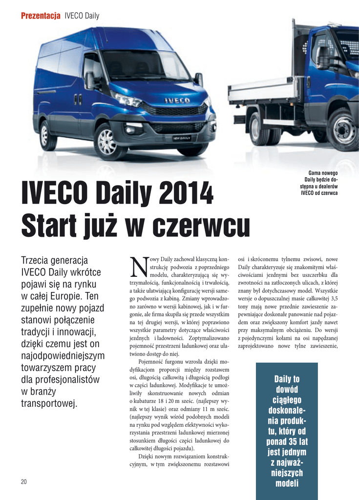 Prezentacja IVECO Daily IVECO Daily 2014 Start już w czerwcu Trzecia generacja IVECO Daily wkrótce pojawi się na rynku w całej Europie. Ten zupełnie nowy pojazd stanowi połączenie tradycji i innowacji, dzięki czemu jest on najodpowiedniejszym towarzyszem pracy dla profesjonalistów w branży transportowej. 20 N owy Daily zachował klasyczną konstrukcję podwozia z poprzedniego modelu, charakteryzującą się wytrzymałością, funkcjonalnością i trwałością, a także ułatwiającą konfigurację wersji samego podwozia z kabiną. Zmiany wprowadzono zarówno w wersji kabinowej, jak i w furgonie, ale firma skupiła się przede wszystkim na tej drugiej wersji, w której poprawiono wszystkie parametry dotyczące właściwości jezdnych i ładowności. Zoptymalizowano pojemność przestrzeni ładunkowej oraz ułatwiono dostęp do niej. Pojemność furgonu wzrosła dzięki modyfikacjom proporcji między rozstawem osi, długością całkowitą i długością podłogi w części ładunkowej. Modyfikacje te umożliwiły skonstruowanie nowych odmian o kubaturze 18 i 20 m sześc. (najlepszy wynik w tej klasie) oraz odmiany 11 m sześc. (najlepszy wynik wśród podobnych modeli na rynku pod względem efektywności wykorzystania przestrzeni ładunkowej mierzonej stosunkiem długości części ładunkowej do całkowitej długości pojazdu). Dzięki nowym rozwiązaniom konstrukcyjnym, w tym zwiększonemu rozstawowi Gama nowego Daily będzie dostępna u dealerów IVECO od czerwca osi i skróconemu tylnemu zwisowi, nowe Daily charakteryzuje się znakomitymi właściwościami jezdnymi bez uszczerbku dla zwrotności na zatłoczonych ulicach, z której znany był dotychczasowy model. Wszystkie wersje o dopuszczalnej masie całkowitej 3,5 tony mają nowe przednie zawieszenie zapewniające doskonałe panowanie nad pojazdem oraz zwiększony komfort jazdy nawet przy maksymalnym obciążeniu. Do wersji z pojedynczymi kołami na osi napędzanej zaprojektowano nowe tylne zawieszenie, Daily to dowód ciągłego doskonalenia produktu, który od ponad 35 lat jest jednym z najważniejszych modeli które pozwoliło obniżyć wysokość podłogi w części ładunkowej o około 55 milimetrów, co ułatwia załadunek i rozładunek towaru. Trzecią generację Daily przygotowano ze szczególnym uwzględnieniem oczekiwań firm. Zmniejszenie zużycia paliwa o ponad 5 proc. w porównaniu z poprzednim modelem oznacza znaczną redukcję całkowitego kosztu posiadania pojazdu (TCO) oferującego najlepsze osiągi w swojej klasie oraz szeroki wybór silników, skrzyń biegów i przełożeń przekładni głównej. Znacząco poprawił się także komfort użytkowania. W kabinie jest wygodniej i ciszej, a pozycja za kierownicą daje wrażenie prowadzenia samochodu osobowego o znakomitych osiągach. Ergonomicznemu wnętrzu (najwyższy poziom w tej kategorii pojazdów) towarzyszy lepsze wyciszenie, bardziej efektywna klimatyzacja i najwyższy komfort jazdy bez względu na obciążenie ładunkiem. Mocny z natury, uniwersalny i łatwy w prowadzeniu, a przy tym atrakcyjny dzięki rewolucyjnemu wzornictwu – nowy Daily to dowód ciągłego doskonalenia produktu, który od ponad 35 lat jest jednym z najważniejszych modeli na rynku lekkich pojazdów użytkowych. Uzupełnieniem oferty Nowego Daily będą mikrobusy opracowane pod kątem potrzeb przedsiębiorstw obsługujących zarówno zbiorowy transport pasażerski w miastach, jak i szybkie przewozy osób między miastami. Nowe Daily będzie dostępne u dealerów IVECO od czerwca. Artur Mazur 21