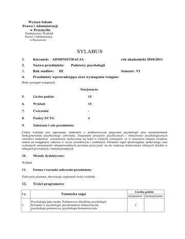 WyŜsza Szkoła Prawa i Administracji w Przemyślu Zamiejscowy Wydział Prawa i Administracji w Rzeszowie SYLABUS 1. Kierunek: ADMINISTRACJA rok akademicki 2010/2011 2. Nazwa przedmiotu: 3. Rok studiów: 4. Przedmioty wprowadzające oraz wymagania wstępne: Podstawy psychologii III Semestr: VI Brak wymagań wstępnych Stacjonarne 5. Liczba godzin: 15 6. Wykład: 15 7. Ćwiczenia: - 8. Punkty ECTS: 4 9. ZałoŜenia i cele przedmiotu: Celem wykładu jest zapoznanie studentów z podstawowymi pojęciami psychologii oraz mechanizmami funkcjonowania psychicznego człowieka. Znajomość procesów psychicznych i właściwości psychologicznych umoŜliwi studentom zrozumienie zachowania się ludzi w róŜnych sytuacjach, co w znacznym stopniu zwiększa szanse na osiągnięcie sukcesu w Ŝyciu zawodowym i osobistym. Poznanie reguł spostrzegania społecznego oraz wybranych umiejętności interpersonalnych powinno przyczynić się do większej skuteczności własnych działań w relacjach prywatnych i instytucjonalnych. 10. Metody dydaktyczne: Wykład 11. Forma i warunki zaliczenia przedmiotu: Zaliczenie pisemne, obowiązuje znajomość treści wykładu. 12. Lp. I. Treści programowe Tematyka zajęć Psychologia jako nauka. Podstawowe dziedziny psychologii. Kierunki w psychologii: psychoanaliza, behawioryzm, psychologia poznawcza, psychologia humanistyczna. Liczba godzin stacjonarne niestacjonarne 2 II. Właściwości psychologiczne jako wyznaczniki funkcjonowania człowieka. Podstawowe procesy psychiczne : procesy poznawcze (percepcja, pamięć, myślenie). Emocje i motywacja. Wpływ emocji i motywacji na działanie. Konflikty motywacyjne. III. Stres i frustracja. Sytuacje trudne i sposoby reagowania na frustrację Następstwa stresu. Odporność na stres. Sposoby radzenia sobie ze stresem. IV. Osobowość. Koncepcje cech i typów osobowości. Temperament, typologia Kretschmera. Pojecie inteligencji. V. Model kompetencji społecznych. Aspekty kompetencji społecznych (poznawczy, motywacyjny i behawioralny). Inteligencja emocjonalna. 1 VI. Spostrzeganie innych ludzi – podstawowe zasady. Rozumienie sytuacji społecznych (kontekst, komunikaty werbalne i niewerbalne). Stereotypy i uprzedzenia. Atrakcyjność interpersonalna. Umiejętność autoprezentacji. 2 3 Asertywność w komunikacji interpersonalnej i działaniu. Reguły asertywnej komunikacji. Zasady zachowań asertywnych w sytuacjach społecznych. Prawa osobiste i wymogi roli społecznej. Rozwiązywanie konfliktów. Istota konfliktów interpersonalnych. Tradycyjne sposoby rozwiązywania konfliktów. Zniekształcenia w VIII. spostrzeganiu siebie i innych ludzi w sytuacji konfliktowej. Zasady konstruktywnego rozwiązywania konfliktów wg D.Johnsona Umiejętność wywierania wpływu na ludzi. Mechanizmy wywierania IX. wpływu. Manipulacje społeczne i sposoby obrony przed niepoŜądanym wpływem. VII. 13. Literatura podstawowa: Mietzel G., Wprowadzenie do psychologii. Gdańsk 2003 Zimbardo P., Ruch F., Psychologia i Ŝycie. Warszawa 2004. McKay M., Davis M., Fanning P., Sztuka skutecznego porozumiewania się. Gdańsk 2005 E. Argon Psychologia społeczna, Poznań 2006 J. Strelau Psychologia, Gdańsk 2003 14. Literatura uzupełniająca: Alberti R., Emmons M., Asertywność. Gdańsk 2007 Chełpa S., Witkowski T., Psychologia konfliktów. Wrocław 2004 Cialdini R., Wywieranie wpływu na ludzi. Teoria i praktyka. Gdańsk 2004 Fensterheim H., Baer J., Nie mów „tak”, gdy chcesz powiedzieć „nie”. Warszawa 2006 Goleman D., Inteligencja emocjonalna w praktyce. Poznań 1999 Leary M., Wywieranie wraŜenia na innych. O sztuce autoprezentacji. Gdańsk 2005 Oniszczenko W., Stres to brzmi groźnie. Warszawa 1998 M. Braun-Gałkowska Psychologia domowa, Lublin 2008 F. Rheinberg Psychologia motywacji, Kraków 2006 P. Szarota Psychologia uśmiechu, Gdańsk 2006 15. Nazwisko osoby prowadzącej zajęcia na studiach stacjonarnych: - wykład: dr Lucyna Mac-Czarnik 2 1 1 2 2