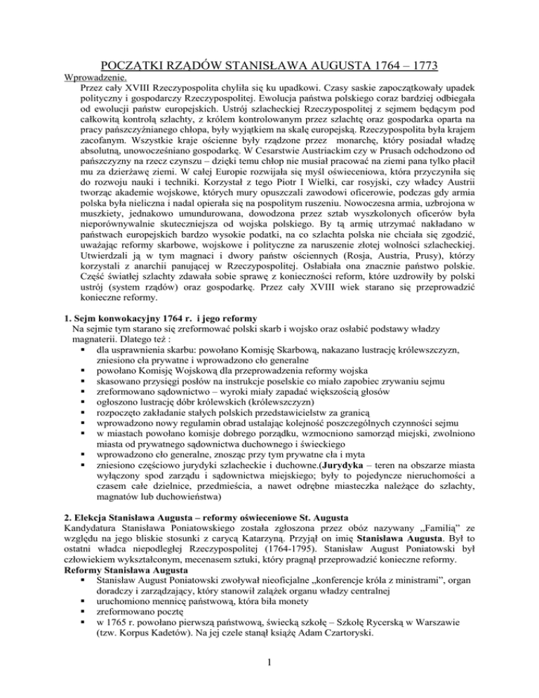 POCZĄTKI RZĄDÓW STANISŁAWA AUGUSTA 1764 – 1773 Wprowadzenie. Przez cały XVIII Rzeczypospolita chyliła się ku upadkowi. Czasy saskie zapoczątkowały upadek polityczny i gospodarczy Rzeczypospolitej. Ewolucja państwa polskiego coraz bardziej odbiegała od ewolucji państw europejskich. Ustrój szlacheckiej Rzeczypospolitej z sejmem będącym pod całkowitą kontrolą szlachty, z królem kontrolowanym przez szlachtę oraz gospodarka oparta na pracy pańszczyźnianego chłopa, były wyjątkiem na skalę europejską. Rzeczypospolita była krajem zacofanym. Wszystkie kraje ościenne były rządzone przez monarchę, który posiadał władzę absolutną, unowocześniano gospodarkę. W Cesarstwie Austriackim czy w Prusach odchodzono od pańszczyzny na rzecz czynszu – dzięki temu chłop nie musiał pracować na ziemi pana tylko płacił mu za dzierŜawę ziemi. W całej Europie rozwijała się myśl oświeceniowa, która przyczyniła się do rozwoju nauki i techniki. Korzystał z tego Piotr I Wielki, car rosyjski, czy władcy Austrii tworząc akademie wojskowe, których mury opuszczali zawodowi oficerowie, podczas gdy armia polska była nieliczna i nadal opierała się na pospolitym ruszeniu. Nowoczesna armia, uzbrojona w muszkiety, jednakowo umundurowana, dowodzona przez sztab wyszkolonych oficerów była nieporównywalnie skuteczniejsza od wojska polskiego. By tą armię utrzymać nakładano w państwach europejskich bardzo wysokie podatki, na co szlachta polska nie chciała się zgodzić, uwaŜając reformy skarbowe, wojskowe i polityczne za naruszenie złotej wolności szlacheckiej. Utwierdzali ją w tym magnaci i dwory państw ościennych (Rosja, Austria, Prusy), którzy korzystali z anarchii panującej w Rzeczypospolitej. Osłabiała ona znacznie państwo polskie. Część światłej szlachty zdawała sobie sprawę z konieczności reform, które uzdrowiły by polski ustrój (system rządów) oraz gospodarkę. Przez cały XVIII wiek starano się przeprowadzić konieczne reformy. 1. Sejm konwokacyjny 1764 r. i jego reformy Na sejmie tym starano się zreformować polski skarb i wojsko oraz osłabić podstawy władzy magnaterii. Dlatego teŜ : dla usprawnienia skarbu: powołano Komisję Skarbową, nakazano lustrację królewszczyzn, zniesiono cła prywatne i wprowadzono cło generalne powołano Komisję Wojskową dla przeprowadzenia reformy wojska skasowano przysięgi posłów na instrukcje poselskie co miało zapobiec zrywaniu sejmu zreformowano sądownictwo – wyroki miały zapadać większością głosów ogłoszono lustrację dóbr królewskich (królewszczyzn) rozpoczęto zakładanie stałych polskich przedstawicielstw za granicą wprowadzono nowy regulamin obrad ustalając kolejność poszczególnych czynności sejmu w miastach powołano komisje dobrego porządku, wzmocniono samorząd miejski, zwolniono miasta od prywatnego sądownictwa duchownego i świeckiego wprowadzono cło generalne, znosząc przy tym prywatne cła i myta zniesiono częściowo jurydyki szlacheckie i duchowne.(Jurydyka – teren na obszarze miasta wyłączony spod zarządu i sądownictwa miejskiego; były to pojedyncze nieruchomości a czasem całe dzielnice, przedmieścia, a nawet odrębne miasteczka naleŜące do szlachty, magnatów lub duchowieństwa) 2. Elekcja Stanisława Augusta – reformy oświeceniowe St. Augusta Kandydatura Stanisława Poniatowskiego została zgłoszona przez obóz nazywany „Familią” ze względu na jego bliskie stosunki z carycą Katarzyną. Przyjął on imię Stanisława Augusta. Był to ostatni władca niepodległej Rzeczypospolitej (1764-1795). Stanisław August Poniatowski był człowiekiem wykształconym, mecenasem sztuki, który pragnął przeprowadzić konieczne reformy. Reformy Stanisława Augusta Stanisław August Poniatowski zwoływał nieoficjalne „konferencje króla z ministrami”, organ doradczy i zarządzający, który stanowił zaląŜek organu władzy centralnej uruchomiono mennicę państwową, która biła monety zreformowano pocztę w 1765 r. powołano pierwszą państwową, świecką szkołę – Szkołę Rycerską w Warszawie (tzw. Korpus Kadetów). Na jej czele stanął ksiąŜę Adam Czartoryski. 1 powstało czasopismo „Monitor” – krytykowało zacofanie części szlachty powołano pierwszy państwowy Teatr Narodowy 3. Sprawa innowierców (1766) i uchwalenie praw kardynalnych (1767) Przeciwko reformom sejmu konwokacyjnego wystąpiły na sejmie w 1766 r. dwory państw ościennych jak i opozycja wewnętrzna. By nie dopuścić do dalszych reform odwrócono uwagę szlachty od spraw najwaŜniejszych. PosłuŜyła do tego sprawa dysydentów (innowierców), których na sejmie w roku 1733 pozbawiono praw politycznych. Caryca Katarzyna II i król Prus Fryderyk II wykorzystali walkę dysydentów o prawa by móc ingerować w wewnętrzne sprawy I RP. Pod osłoną wojsk rosyjskich innowiercy zawiązali konfederacje w Słucku (prawosławni) i Toruniu (proetestanci). Jednocześnie ambasador rosyjski Repnin zachęcał przeciwników reform, katolików Ŝądających detronizacji króla, do zawiązania konfederacji generalnej w Radomiu, która wystąpiła w obronie „złotej wolności” i zaŜądała opieki Katarzyny II. Doszło do wojny domowej między katolikami a innowiercami, którzy razem sprzeciwiali się królowi i reformom. Katolicy poprosili o przysłanie wojsk rosyjskich i rozsądzenie sporu. Doszło w 1767 r. do zwołania sejmu pacyfikacyjnego. Sejm obradował pod węzłem konfederacji radomskiej do 1768 r. Sejm przywrócił równouprawnienie dysydentów, obalił niektóre reformy Czartoryskich i opracował tzw. prawa kardynalne. Prawa te zatwierdzały podstawowe zasady ustroju państwa, będące aktami nadrzędnymi w stosunku do innych ustaw. Prawa te gwarantowały przewagę szlachty lub chroniły interesy magnatów. Zaliczamy do nich: wybór króla tylko na drodze wolnej elekcji, liberum veto, artykuły henrykowskie, a szczególnie prawo wypowiad