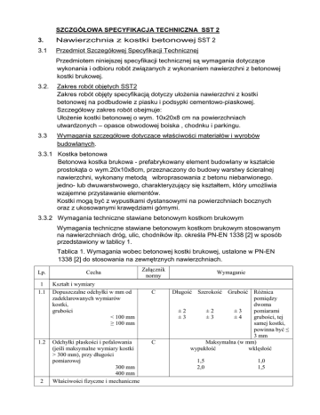 SZCZGÓŁOWA SPECYFIKACJA TECHNICZNA SST 2 3. Nawierzchnia z kostki betonowej SST 2 3.1 Przedmiot Szczegółowej Specyfikacji Technicznej Przedmiotem niniejszej specyfikacji technicznej są wymagania dotyczące wykonania i odbioru robót związanych z wykonaniem nawierzchni z betonowej kostki brukowej. 3.2. Zakres robót objętych SST2 Zakres robót objęty specyfikacją dotyczy ułożenia nawierzchni z kostki betonowej na podbudowie z piasku i podsypki cementowo-piaskowej. Szczegółowy zakres robót obejmuje: Ułożenie kostki betonowej o wym. 10x20x8 cm na powierzchniach utwardzonych – opasce obwodowej boiska , chodnku i parkingu. 3.3 Wymagania szczegółowe dotyczące właściwości materiałów i wyrobów budowlanych. 3.3.1 Kostka betonowa Betonowa kostka brukowa - prefabrykowany element budowlany w kształcie prostokąta o wym.20x10x8cm, przeznaczony do budowy warstwy ścieralnej nawierzchni, wykonany metodą wibroprasowania z betonu niebarwionego. jedno- lub dwuwarstwowego, charakteryzujący się kształtem, który umożliwia wzajemne przystawanie elementów. Kostki mogą być z wypustkami dystansowymi na powierzchniach bocznych oraz z ukosowanymi krawędziami górnymi. 3.3.2 Wymagania techniczne stawiane betonowym kostkom brukowym Wymagania techniczne stawiane betonowym kostkom brukowym stosowanym na nawierzchniach dróg, ulic, chodników itp. określa PN-EN 1338 [2] w sposób przedstawiony w tablicy 1. Tablica 1. Wymagania wobec betonowej kostki brukowej, ustalone w PN-EN 1338 [2] do stosowania na zewnętrznych nawierzchniach. Lp. Cecha 1 1.1 Kształt i wymiary Dopuszczalne odchyłki w mm od zadeklarowanych wymiarów kostki, grubości < 100 mm ≥ 100 mm 1.2 Odchyłki płaskości i pofalowania (jeśli maksymalne wymiary kostki > 300 mm), przy długości pomiarowej 300 mm 400 mm Właściwości fizyczne i mechaniczne 2 Załącznik normy C C Wymaganie Długość Szerokość Grubość Różnica pomiędzy dwoma ±2 ±2 ±3 pomiarami ±3 ±3 ±4 grubości, tej samej kostki, powinna być ≤ 3 mm Maksymalna (w mm) wypukłość wklęsłość 1,5 2,0 1,0 1,5 2.1 Odporność na zamrażanie/rozmrażanie z udziałem soli odladzających (wg klasy 3, zał. D) Wytrzymałość na rozciąganie przy rozłupywaniu D Ubytek masy po badaniu: wartość średnia ≤ 1,0 kg/m2, przy czym każdy pojedynczy wynik < 1,5 kg/m2 F 2.3 Trwałość (ze względu na wytrzymałość) F 2.4 Odporność na ścieranie (wg klasy 3 oznaczenia H normy) 2.5 Odporność na poślizg/poślizgnięcie Wytrzymałość charakterystyczna T ≥ 3,6 MPa. Każdy pojedynczy wynik ≥ 2,9 MPa i nie powinien wykazywać obciążenia niszczącego mniejszego niż 250 N/mm długości rozłupania Kostki mają zadawalającą trwałość (wytrzymałość) jeśli spełnione są wymagania pktu 2.2 oraz istnieje normalna konserwacja Pomiar wykonany na tarczy szerokiej ściernej, Böhmego, wg zał. G normy – wg zał. H mormy – badanie podstawowe badanie alternatywne ≤ 23 mm ≤20 000mm3/5000 mm2 a) jeśli górna powierzchnia kostki nie była szlifowana lub polerowana – zadawalająca odporność, b) jeśli wyjątkowo wymaga się podania wartości odporności na poślizg/poślizgnięcie – należy zadeklarować minimalną jej wartość pomierzoną wg zał. I normy (wahadłowym przyrządem do badania tarcia) 3 3.1 Aspekty wizualne Wygląd J 3.2 Tekstura J 3.3 Zabarwienie (barwiona może być warstwa ścieralna lub cały element) 2.2 GiH I a) górna powierzchnia kostki nie powinna mieć rys i odprysków, b) nie dopuszcza się rozwarstwień w kostkach dwuwarstwowych, c) ewentualne wykwity nie są uważane za istotne a) kostki z powierzchnią o specjalnej teksturze – producent powinien opisać rodzaj tekstury, b) tekstura lub zabarwienie kostki powinny być porównane z próbką producenta, zatwierdzoną przez odbiorcę, c) ewentualne różnice w jednolitości tekstury lub zabarwienia, spowodowane nieuniknionymi zmianami we właściwościach surowców i zmianach warunków twardnienia nie są uważane za istotne 3.3.3. Składowanie kostek Kostkę zaleca się pakować na paletach. Palety z kostką mogą być składowane na otwartej przestrzeni, przy czym podłoże powinno być wyrównane i odwodnione. 3.3.4. Podbudową pod nawierzchnię z betonowej kostki betonowej jest podsypka cem-piaskowa B 7,5 w kolejności warstw: a) 10 cm - warstwa odsączająca z piasku; b) 5 cm - podsypka cem-piaskowa pod chodnikiem i opasce (10 cm - podsypka cem-piaskowa pod miejsca parkingowe) 3.4 Wymagania szczegółowe dotyczące sprzętu i maszyn do robót budowlanych Ogólne wymagania dotyczące sprzętu i maszyn do robót budowlanych określone zostały w pkt. 3 ST - część ogólna. Do przycinania kostek można stosować specjalne narzędzia tnące (np. przycinarki, szlifierki z tarczą). Do zagęszczania nawierzchni z kostki należy stosować zagęszczarki wibracyjne (płytowe) z wykładziną elastomerową, chroniące kostki przed ścieraniem i wykruszaniem naroży. Wykonawca ma obowiązek użycia sprzętu do wykonania nawierzchni gwarantującej zachowanie niezbędnych parametrów techniczno-użytkowych i jakościowych. 3.5 Wymagania szczegółowe dotyczące środków transportowych Wymagania ogólne zostały określone w pkt. 4 ST - część ogólna. 3.5.1 Betonowe kostki brukowe mogą być przewożone na paletach - dowolnymi środkami transportowymi po osiągnięciu przez beton wytrzymałości na ściskanie co najmniej 15 MPa. Kostki w trakcie transportu powinny być zabezpieczone przed przemieszczaniem się i uszkodzeniem. 3.6 Wymagania szczegółowe wykonania robót budowlanych Ogólne wymagania dotyczące wykonania robót zostały określone w pkt. 5 ST - część ogólna. Wykonawca ma obowiązek dokonać sprawdzenia stanu technicznego podłoża i wnieść zamawiającemu ewentualne usterki które winny być usunięte przed wykonaniem nawierzchni . Dotyczy to przede wszystkim zgodności warstw podbudowy, równości płaszczyzny podbudowy i jej spadkó