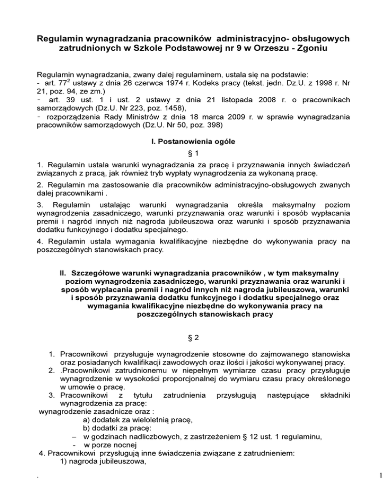 Regulamin wynagradzania pracowników administracyjno- obsługowych zatrudnionych w Szkole Podstawowej nr 9 w Orzeszu - Zgoniu Regulamin wynagradzania, zwany dalej regulaminem, ustala się na podstawie: - art. 772 ustawy z dnia 26 czerwca 1974 r. Kodeks pracy (tekst. jedn. Dz.U. z 1998 r. Nr 21, poz. 94, ze zm.) – art. 39 ust. 1 i ust. 2 ustawy z dnia 21 listopada 2008 r. o pracownikach samorządowych (Dz.U. Nr 223, poz. 1458), – rozporządzenia Rady Ministrów z dnia 18 marca 2009 r. w sprawie wynagradzania pracowników samorządowych (Dz.U. Nr 50, poz. 398) I. Postanowienia ogóle §1 1. Regulamin ustala warunki wynagradzania za pracę i przyznawania innych świadczeń związanych z pracą, jak również tryb wypłaty wynagrodzenia za wykonaną pracę. 2. Regulamin ma zastosowanie dla pracowników administracyjno-obsługowych zwanych dalej pracownikami . 3. Regulamin ustalając warunki wynagradzania określa maksymalny poziom wynagrodzenia zasadniczego, warunki przyznawania oraz warunki i sposób wypłacania premii i nagród innych niż nagroda jubileuszowa oraz warunki i sposób przyznawania dodatku funkcyjnego i dodatku specjalnego. 4. Regulamin ustala wymagania kwalifikacyjne niezbędne do wykonywania pracy na poszczególnych stanowiskach pracy. II. Szczegółowe warunki wynagradzania pracowników , w tym maksymalny poziom wynagrodzenia zasadniczego, warunki przyznawania oraz warunki i sposób wypłacania premii i nagród innych niż nagroda jubileuszowa, warunki i sposób przyznawania dodatku funkcyjnego i dodatku specjalnego oraz wymagania kwalifikacyjne niezbędne do wykonywania pracy na poszczególnych stanowiskach pracy §2 1. Pracownikowi przysługuje wynagrodzenie stosowne do zajmowanego stanowiska oraz posiadanych kwalifikacji zawodowych oraz ilości i jakości wykonywanej pracy. 2. .Pracownikowi zatrudnionemu w niepełnym wymiarze czasu pracy przysługuje wynagrodzenie w wysokości proporcjonalnej do wymiaru czasu pracy określonego w umowie o pracę. 3. Pracownikowi z tytułu zatrudnienia przysługują następujące składniki wynagrodzenia za pracę: wynagrodzenie zasadnicze oraz : a) dodatek za wieloletnią pracę, b) dodatki za pracę: − w godzinach nadliczbowych, z zastrzeżeniem § 12 ust. 1 regulaminu, - w porze nocnej 4. Pracownikowi przysługują inne świadczenia związane z zatrudnieniem: 1) nagroda jubileuszowa, . 1 2) dodatkowe wynagrodzenie roczne, 3) jednorazowa odprawa pieniężna w związku z przejściem na emeryturę lub rentę z tytułu niezdolności do pracy, 4) wynagrodzenie za czas urlopu wypoczynkowego, 5) ekwiwalent pieniężny za niewykorzystany urlop, 6) świadczenia za okres czasowej niezdolności do pracy. 5. Pracownikowi z tytułu zatrudnienia może być przyznany, jako składnik wynagrodzenia za pracę: 1) dodatek funkcyjny, 2) dodatek specjalny. 6. Pracownikowi mogą być przyznane inne świadczenia związane z zatrudnieniem: 1) nagroda, 2) premia uznaniowa 7. Rodzinie zmarłego pracownika przysługuje odprawa pośmiertna określana na warunkach i w wysokości wynikającej z art. 93 Kodeksu pracy. §3 1. Miesięczne wynagrodzenie zasadnicze pracownika określa się w umowie o pracę stosownie do zajmowanego stanowiska i posiadanych kwalifikacji. 2. Miesięczne wynagrodzenie zasadnicze pracownika zatrudnionego w pełnym wymiarze czasu pracy nie może być niższe od minimalnego poziomu wynagrodzenia zasadniczego dla pracowników samorządowych zatrudnionych na podstawie umowy o pracę określonego w załączniku nr 1 w części B do rozporządzenia Rady Ministrów z dnia 18 marca 2009 r. w sprawie wynagradzania pracowników samorządowych. 3. Stawki minimalnego i maksymalnego miesięcznego poziomu wynagrodzenia zasadniczego dla pracowników zatrudnionych na podstawie umowy o pracę określa tabela stanowiąca Załącznik nr 1 do regulaminu. 4.Pracownik otrzymuje wynagrodzenie netto po potrąceniu kwot określonych w ust. 5,6 i 7. 5. Pracownikowi potrąca się składki na ubezpieczenie emerytalne, rentowe, chorobowe i zdrowotne według przepisów o ubezpieczeniach społecznych i powszechnym ubezpieczeniu zdrowotnym. 6. Po odliczeniu należności określonych w ust. 5 oraz zaliczki na podatek dochodowy od osób fizycznych podlegają potrąceniu należności określone w art. 87 Kodeksie pracy. 7. Należności inne niż wymienione w ust. 5 i 6 mogą być potrącane z wynagrodzenia pracownika tylko za jego zgodą wyrażoną na piśmie. 8. Wypłata wynagrodzenia za pracę następuje formie i na zasadach określonych w regulaminie pracy obowiązującym w placówce. §4 1. Pracownikowi przysługuje dodatek za wieloletnią pracę ustalany na zasadach określonych w ustawie o pracownikach samorządowych i wypłacany według zasad określonych w rozporządzeniu Rady Ministrów z dnia 18 marca 2009 r. w sprawie wynagradzania pracowników samorządowych. 2. Dodatek za wieloletnią pracę przysługuje po 5 latach pracy w wysokości wynoszącej 5% miesięcznego wynagrodzenia zasadniczego. Dodatek ten wzrasta o 1 % za każdy dalszy rok pracy aż do osiągnięcia 20% miesięcznego wynagrodzenia zasadniczego. 3. Dodatek za wieloletnią pracę wypłacany jest w terminie wypłaty wynagrodzenia: 1) począwszy od pierwszego dnia miesiąca kalendarzowego następującego po miesiącu, w którym pracownik nabył prawo do dodatku lub wyższej stawki dodatku, jeżeli nabycie prawa nastąpiło w ciągu miesiąca; . 2 2) za dany miesiąc, jeżeli nabycie prawa do dodatku lub wyższej stawki dodatku nastąpiło pierwszego dnia miesiąca. 4. Dodatek za wieloletnią pracę przysługuje pracownikowi za dni, za które otrzymuje wynagrodzenie, oraz za dni nieobecności w pracy z powodu niezdolności do pracy wskutek choroby albo konieczności osobistego sprawowania opieki nad dzieckiem lub chorym członkiem rodziny, za które pracownik otrzymuje z tego tytułu zasiłek z ubezpieczenia społecznego. §5 1. Pracownikowi przysługuje nagroda jubileuszowa w wysokości ustalane