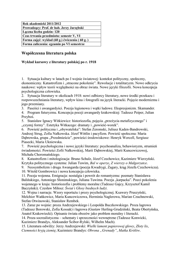 Rok akademicki 2011/2012 Prowadzący: Prof. dr hab. Jerzy Jarzębski Łączna liczba godzin: 120 Czas trwania przedmiotu: semestr V, VI Forma zajęć: wykład (60 g.) ćwiczenia ( 60 g. ) Forma zaliczenia: egzamin po VI semestrze Współczesna literatura polska Wykład kursowy z literatury polskiej po r. 1918 1. Sytuacja kultury w latach po I wojnie światowej: kontekst polityczny, społeczny, ekonomiczny. Katastrofizm i „stracone pokolenie”. Rewolucje i totalitaryzm. Nowe odkrycia naukowe: wpływ teorii względności na obraz świata. Nowe języki filozofii. Nowa koncepcja psychologiczna człowieka. 2. Sytuacja literatury w okolicach 1918: nowi odbiorcy literatury, nowe środki przekazu i rozpowszechniania literatury, wpływ kina i fotografii na język literacki. Pojęcie modernizmu i jego przemiany. 3. Paseiści i awangardyści. Poezja legionowa i wątki ludowe. Ekspresjonizm. Skamander. 4. Program futuryzmu. Koncepcja poezji awangardy krakowskiej: Tadeusz Peiper, Julian Przyboś. 5. Stanisław Ignacy Witkiewicz: historiozofia, pojęcia „przeŜycia metafizycznego” i „czystej formy”. Estetyka Witkacego: dramaty i „powieść-worek”. 6. Powieść polityczna i „obywatelska”: Stefan śeromski, Juliusz Kaden-Bandrowski, Andrzej Strug, Zofia Nałkowska. Józef Wittlin i pacyfizm. Powieść społeczna: Maria Dąbrowska, grupa „Przedmieście”, powieści środowiskowe: Henryk Worcell, Sergiusz Piasecki, Maria Ukniewska. 7. Powieść psychologiczna i nowe języki literatury: psychoanaliza, behawioryzm, strumień świadomości. Powieści Zofii Nałkowskiej, Marii Dąbrowskiej, Marii Kuncewiczowej, Michała Choromańskiego. 8. Katastrofizm i mitologizacja: Bruno Schulz, Józef Czechowicz, Kazimierz Wierzyński. Krytyka politycznego systemu: Julian Tuwim, Bal w operze, Z wierszy o Małgorzatce. 9. Neosymbolizm i druga Awangarda (poezja Kwadrygi, śagary, krąg Józefa Czechowicza). 10. Witold Gombrowicz i nowa koncepcja człowieka. 11. Poezja wojenna. Emigracja: nostalgia i powrót do romantyzmu: poematy Stanisława Balińskiego, Antoniego Słonimskiego, Juliana Tuwima. Poezja „karpacka”. Poeci pokolenia wojennego w kraju: historiozofia i problemy moralne (Tadeusz Gajcy, Krzysztof Kamil Baczyński). Czesław Miłosz: Świat i Głosy biednych ludzi. 12. Wojna i narracje. Wzory reportaŜu i prozy psychologicznej. Ksawery Pruszyński, Melchior Wańkowicz, Maria Kuncewiczowa, Herminia Naglerowa, Marian Czuchnowski, Stefan Otwinowski, Stanisław Rembek. 13. Zaraz po wojnie: proza Andrzejewskiego i Leopolda Buczkowskiego. Proza lagrowa (Tadeusz Borowski, Zofia Kossak) i łagrowa (Gustaw Herling-Grudziński, Beata Obertyńska, Anatol Krakowiecki). Opisanie świata obozów jako problem moralny i literacki. 14. Proza socrealistyczna – schematy i sprzeczności wewnętrzne (Tadeusz Konwicki, Kazimierz Brandys, Aleksander Ścibor-Rylski, Wilhelm Mach). 15. Literatura odwilŜy: Jerzy Andrzejewski: Wielki lament papierowej głowy, Złoty lis, Ciemności kryją ziemię; Kazimierz Brandys: Obrona „Grenady”, Matka Królów. 16. Odrzucenie socrealizmu: proza Leopolda Tyrmanda (Zły) i Marka Hłaski (Pierwszy krok w chmurach, Cmentarze, Następny do raju, Drugie zabicie psa, Brudne czyny, Nawrócony w Jaffie). 17. Poezja po październiku 1956: spóźnione debiuty i pokolenie „Współczesności”; poezja wyzwolonej wyobraźni, lingwizm, moralizm, klasycyzm (Miron Białoszewski, Tymoteusz Karpowicz, Zbigniew Herbert, Jarosław Marek Rymkiewicz, Stanisław Grochowiak, Tadeusz Nowak, Jerzy Harasymowicz). 18. Poezja Czesława Miłosza: traktaty poetyckie, „forma bardziej pojemna”. 19. Proza Stanisława Lema: nowy język fantastyki. 20. Poezja Wisławy Szymborskiej: ontologia, przypadek, kondycja człowieka, Eros i Tanatos, historia. 21. Próby opisania rzeczywistości: parabola historyczna i pamięć przeszłości (Jerzy Andrzejewski, Bramy raju; Hanna Malewska, Apokryf rodzinny, Jacek Bocheński, Boski Juliusz, Kazimierz Brandys, Wariacje pocztowe, Rondo, Andrzej Szczypiorski, Msza za miasto Arras, Tadeusz Konwicki, Dziura w niebie, Sennik współczesny, Wniebowstąpienie, Andrzej Kuśniewicz, Król Obojga Sycylii, Lekcja martwego języka, Strefy, Gustaw HerlingGrudziński, Skrzydła ołtarza, KsiąŜę niezłomny, Julian Stryjkowski, Głosy w ciemności, Austeria). 22. Dzienniki i łŜe-dzienniki: Witold Gombrowicz, Dziennik, Gustaw Herling-Grudziński, Dziennik pisany nocą, Kazimierz Brandys, cykl Wspomnienia z teraźniejszości, Tadeusz Konwicki, Kalendarz i klepsydra. 23. Mały realizm i wołanie o realizm prawdziwy. Poezja i proza Nowej Fali (Stanisław Barańczak, Adam Zagajewski, Julian Kornhauser, Ewa Lipska, Ryszard Krynicki). 24. Wydarzenia marcowe 1968, grudniowe 1970, czerwiec 1976 i ich wpływ na kulturę. Powstanie opozycji politycznej i podziemnego ruchu wydawniczego („Zapis”, „Puls”, oficyna Nowa). Pierwsze ksiąŜki wydane najpierw w drugim obiegu: Tadeusz Konwicki, Kompleks polski, Mała Apokalipsa, Julian Stryjkowski, Wielki strach, Jerzy Andrzejewski, Miazga. 25. Czasy „Solidarności” i literatura stanu wojennego (Zbigniew Herbert, Tadeusz Konwicki, Marek Nowakowski, Janusz Anderman, Jan Polkowski, Bronisław Maj). Powstanie „NaGłosu”, „bruLionu”, „Czasu Kultury”, „Arki”. Wejście do literatury nowego „pokolenia bruLionu”: Marcin Świetlicki, Marcin Baran, Manuela Gretkowska, Krzysztof Koehler. 26. Proza okresu rodzenia się niepodległości: Stefan Chwin, Jerzy Pilch, Paweł Huelle, Andrzej Stasiuk, Olga Tokarczuk. Konwersatorium z literatury po r. 1918 1. Futuryzm jako poezja nowej przestrzeni (nasycenie znakami, problemy komunikacji, słowo na wolności i słowo jako przedmiot, wpływ widzenia filmowego, urbanizm i ruralizm). Przykłady: Jerzy Jankowski, Maggi, Stanisław MłodoŜeniec: Anarchiści, Moskwa; Tytus CzyŜewski: Płomień i studnia, Bruno Jasieński: Przejechali (kinematograf), Adam WaŜyk: Tramwaj, Anatol Stern: