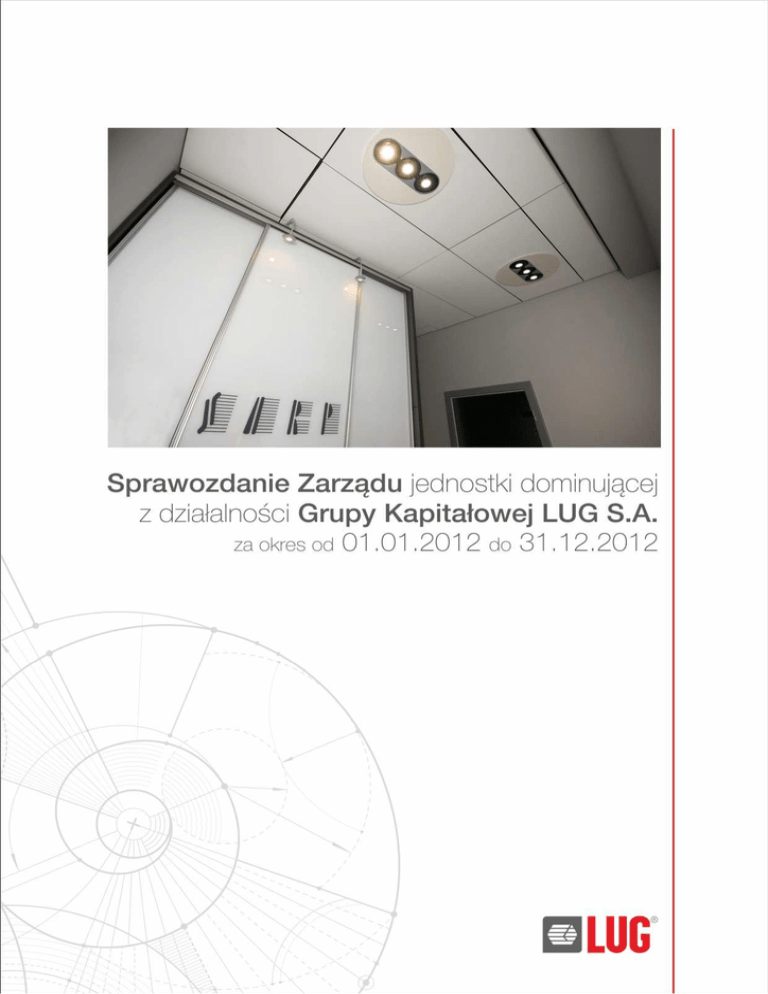15 1. PODSTAWOWE DANE 1.1. Opis organizacji Grupy Kapitałowej LUG S.A. Jednostką dominującą Grupy Kapitałowej LUG S.A. („Grupa”, „Grupa Kapitałowa”) jest spółka LUG S.A. („Spółka”, „Emitent”). Kraj siedziby: Polska Siedziba Spółki: Zielona Góra Forma prawna: Spółka akcyjna Przepisy prawa: Prawo polskie, zgodnie z Kodeksem Spółek Handlowych Adres siedziby: ul. Gorzowska 11, 65-127 Zielona Góra Numery telekomunikacyjne: tel. (068) 45 33 200, fax. (068) 45 33 201 Poczta elektroniczna: [email protected] Strona internetowa: www.lug.com.pl REGON: 080201644 NIP: 929-16-72-920 Spółka jest zarejestrowana w rejestrze przedsiębiorców Krajowego Rejestru Sądowego, prowadzonym przez Sąd Rejonowy w Zielonej Górze, VIII Wydział Gospodarczy Krajowego Rejestru Sądowego pod nr KRS 0000287791. Na dzień 31.12.20121r. jednostka dominująca objęła konsolidacją następujące jednostki zależne: • LUG Light Factory Sp. z o.o.; • LUG GmbH; • T.O.W. LUG Ukraina (działalność zawieszona) • LUG do Brazil Ltda. Wykres 1 Struktura Grupy Kapitałowej LUG S.A. Źródło: LUG S.A. 16 Tabela 10 Dane jednostek powiązanych kapitałowo z Emitentem Nazwa jednostki LUG Light Factory Sp. z o. o. Siedziba ul. Gorzowska 11, 65-127 Zielona Góra Przedmiot przeważającej działalności Produkcja elektrycznego sprzętu oświetleniowego. Produkcja sprzętu oświetleniowego i lamp elektrycznych. Organ rejestrowy Sąd Rejonowy w Zielonej Górze, VIII Wydział Gospodarczy Krajowego Rejestru Sądowego, KRS 0000290498 NIP 929-17-85-452 REGON 080212116 Charakter dominacji Zależna Metoda konsolidacji Pełna Procent posiadanego kapitału zakładowego 100% Procentowy udział w ogólnej liczbie głosów na zgromadzeniu wspólników 100% Nazwa jednostki LUG GmbH Siedziba Karl Marx Strasse 7, 15230 Frankfurt (Oder) Przedmiot działalności Produkcja, dystrybucja i instalacje opraw oraz urządzeń elektrycznych. Organ rejestrowy Amtsgericht: Frankfurt (Oder) HRB 12835 Ust-IdNr DE262127740 Charakter dominacji Zależna Metoda konsolidacji Wyłączenie z konsolidacji z powodu zawieszenia działalności Procent posiadanego kapitału zakładowego 100% Procentowy udział w ogólnej liczbie głosów na zgromadzeniu wspólników 100% Nazwa jednostki T.O.W. LUG Ukraina Siedziba ul. Diehtiariwska 62A, 03040 Kijów Przedmiot działalności Projektowanie, produkcja i handel sprzętem oświetleniowym Organ rejestrowy Administracja Państwowa rejonu Szewczenkowskiego m. Kijowa Nr identyfikacyjny 34190214 Charakter dominacji Zależna Metoda konsolidacji Pełna Procent posiadanego kapitału zakładowego Procentowy udział w ogólnej liczbie głosów na zgromadzeniu wspólników 100% 100% 17 Informacja dodatkowa Emitent zawiesił działalność spółki z powodu trudnych warunków prowadzenia działalności gospodarczej na Ukrainie wynikających ze złej sytuacji finansowej kraju, powszechności łamania przepisów prawnych i zjawisk korupcyjnych. Nazwa jednostki LUG do Brazil Artigos de iluminação Ltda. Siedziba Rua Fidêncio Ramos, 223, 3 Andar – Vila Olimpia São Paulo, 04551-010, Brasil Przedmiot działalności Wprowadzenie marek LUG na rynek brazylijski, import, eksport i sprzedaż opraw oświetleniowych. Nr identyfikacyjny CNPJ/MF 15.805.349/0001-78 NIRE 3522671933-1 Charakter dominacji Zależna Metoda konsolidacji Pełna Procent posiadanego kapitału zakładowego 65% Procentowy udział w ogólnej liczbie głosów na zgromadzeniu wspólników 65% Informacja dodatkowa Rejestracja spółki i rozpoczęcie działalności miało miejsce w dniu 28.06.2012 roku. Oficjalne otwarcie siedziby nastąpiło 24.04.2013r. Źródło: LUG S.A. W 2012 roku miały miejsce następujące zmiany w organizacji Grupy Kapitałowej LUG S.A.: • 28.06.2012r. – została zarejestrowana nowa spółka zależna w Grupie Kapitałowej LUG S.A. – LUG do Brazil - Artigos de Iluminação Ltda. (LUG do Brazil Ltda.). Udziałowcami LUG do Brazil Ltda. są: LUG S.A. (65% udziałów), Eryk Wtorkowski (20% udziałów), Andrzej Barski (15% udziałów). Kapitał zakładowy spółki wynosi 150.000 reali brazylijskich (słownie: sto pięćdziesiąt tysięcy reali brazylijskich). Spółka LUG do Brazil Ltda. będzie zajmowała się dystrybucją produktów marki LUG na terenie Ameryki Południowej. Utworzenie nowej spółki zależnej jest elementem realizacji strategii Emitenta polegającej na geograficznej ekspansji Grupy Kapitałowej LUG S.A. na nowy kontynent w celu systematycznego zwiększania udziałów w światowym rynku oświetleniowym. W ocenie Zarządu LUG S.A. powołanie spółki LUG do Brazil Ltda. istotnie wpłynie na rozwój Grupy Kapitałowej LUG S.A. oraz pozwoli wprowadzić markę LUG na rynek brazylijski oraz na inne rynki Ameryki Południowej, a w konsekwencji zwiększyć wolumen sprzedaży. 1.2. Przedmiot działalności wg PKD Przedmiotem przeważającej działalności Grupy Kapitałowej LUG S.A. wg PKD jest: • produkcja elektrycznego sprzętu oświetleniowego (wg PKD 2007 – 27.4); Sektor działalności Emitenta wg klasyfikacji GPW – budownictwo. 18 1.3. Czas trwania LUG S.A. jest spółką utworzoną na czas nieokreślony. LUG Light Factory Sp. z o.o. jest spółką utworzoną na czas nieokreślony. LUG GmbH jest spółką utworzoną na czas nieokreślony. T.O.W. LUG Ukraina jest spółką utworzoną na czas nieokreślony, na dzień 31.12.2012 r. jej działalność była zawieszona. LUG do Brazil Artigos de iluminação Ltda. jest spółką utworzoną na czas nieokreślony. 1.4. Organy zarządzające podmiotów z Grupy Kapitałowej LUG S.A. W skład Zarządu Emitenta na dzień 31.12.2012r. wchodziły 3 osoby: • Pan Ryszard Wtorkowski - Prezes Zarządu, • Pan Mariusz Ejsmont – Wiceprezes Zarządu, • Pani Małgorzata Konys - Członek Zarządu. Tabela 11 Skład Zarządu LUG S.A. w okresie 01.01.2012r. – 31.12.2012r. Imię i nazwisko 1) Ryszard Wtorkowski Mariusz Ejsmont 2) 3) Małgorzata Konys Funkcja w 