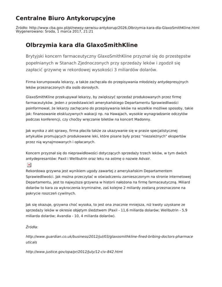 Centralne Biuro Antykorupcyjne Źródło: http://www.cba.gov.pl/pl/newsy-serwisu-antykorup/2026,Olbrzymia-kara-dla-GlaxoSmithKline.html Wygenerowano: Środa, 1 marca 2017, 21:21 Olbrzymia kara dla GlaxoSmithKline Brytyjski koncern farmaceutyczny GlaxoSmithKline przyznał się do przestępstw popełnianych w Stanach Zjednoczonych przy sprzedaży leków i zgodził się zapłacić grzywnę w rekordowej wysokości 3 miliardów dolarów. Firma korumpowała lekarzy, a także zachęcała do przepisywania młodzieży antydepresyjnych leków przeznaczonych dla osób dorosłych. GlaxoSmithKline przekupywał lekarzy, by zwiększyć sprzedaż produkowanych przez firmę farmaceutyków. Jeden z przedstawicieli amerykańskiego Departamentu Sprawiedliwości poinformował, że lekarzy zachęcano do przepisywania leków na wszelkie możliwe sposoby, takie jak: finansowanie ekskluzywnych wakacji np. na Hawajach, wysokie wynagradzanie odczytów podczas konferencji, czy choćby wręczanie biletów na koncert Madonny. Jak wynika z akt sprawy, firma płaciła także za ukazywanie się w prasie specjalistycznej artykułów promujących produkowane leki, które pisane były przez "niezależnych" ekspertów przez nią wynajmowanych i opłacanych. Koncern przyznał się do nieprawidłowości dotyczących sprzedaży trzech leków, w tym dwóch antydepresantów: Paxil i Wellbutrin oraz leku na astmę o nazwie Advair. Rekordowa grzywna jest wynikiem ugody zawartej z amerykańskim Departamentem Sprawiedliwości. Jak można przeczytać w oświadczeniu zamieszczonym na stronie internetowej Departamentu, jest to najwyższa grzywna w historii nałożona na firmę farmaceutyczną. Miliard dolarów to kara za wykroczenia kryminalne, zaś kolejne 2 miliardy zostaną przeznaczone na pokrycie roszczeń cywilnych. Jak się okazuje, grzywna choć wysoka, to jest ona znacznie mniejsza, niż kwoty uzyskane ze sprzedaży leków w okresie objętym śledztwem (Paxil - 11,6 miliarda dolarów; Wellbutrin - 5,9 miliarda dolarów; Avandia - 10, 4 miliarda dolarów). Źródła: http://www.guardian.co.uk/business/2012/jul/03/glaxosmithkline-fined-bribing-doctors-pharmace uticals http://www.justice.gov/opa/pr/2012/July/12-civ-842.html Opublikowano 6.07.2012 na www.antykorupcja.edu.pl oprac. Wydział Informacji i Edukacji Antykorupcyjnej GSz CBA