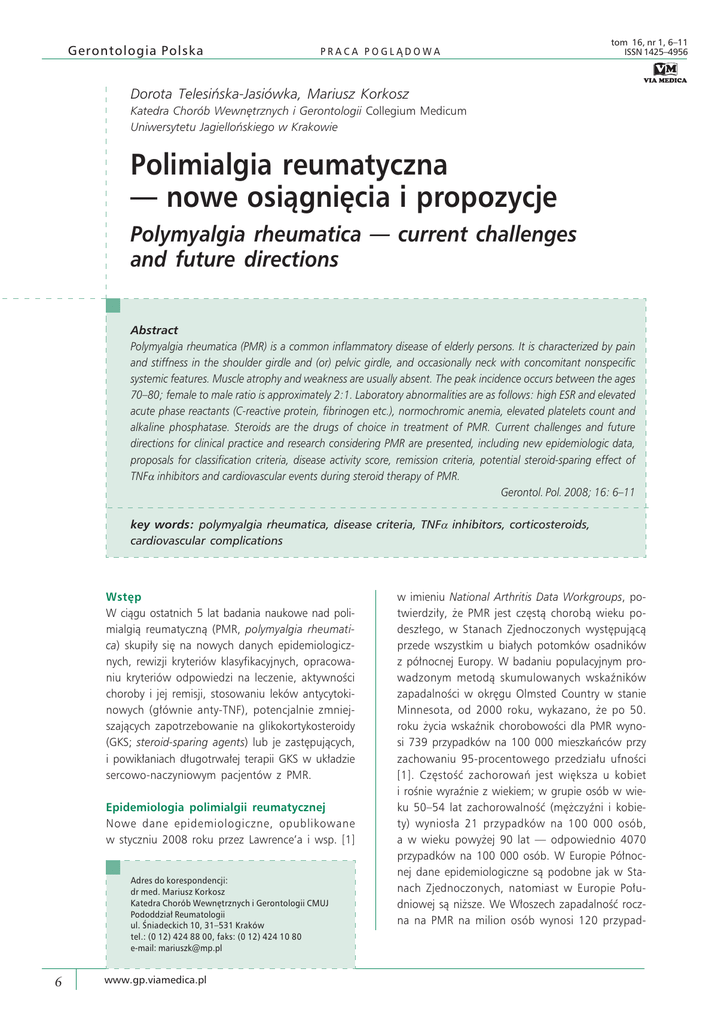 Gerontologia Polska PRACA POGLĄDOWA tom 16, nr 1, 6–11 ISSN 1425–4956 Dorota Telesińska-Jasiówka, Mariusz Korkosz Katedra Chorób Wewnętrznych i Gerontologii Collegium Medicum Uniwersytetu Jagiellońskiego w Krakowie Polimialgia reumatyczna — nowe osiągnięcia i propozycje Polymyalgia rheumatica — current challenges and future directions Abstract Polymyalgia rheumatica (PMR) is a common inflammatory disease of elderly persons. It is characterized by pain and stiffness in the shoulder girdle and (or) pelvic girdle, and occasionally neck with concomitant nonspecific systemic features. Muscle atrophy and weakness are usually absent. The peak incidence occurs between the ages 70–80; female to male ratio is approximately 2:1. Laboratory abnormalities are as follows: high ESR and elevated acute phase reactants (C-reactive protein, fibrinogen etc.), normochromic anemia, elevated platelets count and alkaline phosphatase. Steroids are the drugs of choice in treatment of PMR. Current challenges and future directions for clinical practice and research considering PMR are presented, including new epidemiologic data, proposals for classification criteria, disease activity score, remission criteria, potential steroid-sparing effect of TNFα inhibitors and cardiovascular events during steroid therapy of PMR. Gerontol. Pol. 2008; 16: 6–11 key words: polymyalgia rheumatica, disease criteria, TNFα inhibitors, corticosteroids, cardiovascular complications Wstęp W ciągu ostatnich 5 lat badania naukowe nad polimialgią reumatyczną (PMR, polymyalgia rheumatica) skupiły się na nowych danych epidemiologicznych, rewizji kryteriów klasyfikacyjnych, opracowaniu kryteriów odpowiedzi na leczenie, aktywności choroby i jej remisji, stosowaniu leków antycytokinowych (głównie anty-TNF), potencjalnie zmniejszających zapotrzebowanie na glikokortykosteroidy (GKS; steroid-sparing agents) lub je zastępujących, i powikłaniach długotrwałej terapii GKS w układzie sercowo-naczyniowym pacjentów z PMR. Epidemiologia polimialgii reumatycznej Nowe dane epidemiologiczne, opublikowane w styczniu 2008 roku przez Lawrence’a i wsp. [1] Adres do korespondencji: dr med. Mariusz Korkosz Katedra Chorób Wewnętrznych i Gerontologii CMUJ Pododdział Reumatologii ul. Śniadeckich 10, 31–531 Kraków tel.: (0 12) 424 88 00, faks: (0 12) 424 10 80 e-mail: [email protected] 6 www.gp.viamedica.pl w imieniu National Arthritis Data Workgroups, potwierdziły, że PMR jest częstą chorobą wieku podeszłego, w Stanach Zjednoczonych występującą przede wszystkim u białych potomków osadników z północnej Europy. W badaniu populacyjnym prowadzonym metodą skumulowanych wskaźników zapadalności w okręgu Olmsted Country w stanie Minnesota, od 2000 roku, wykazano, że po 50. roku życia wskaźnik chorobowości dla PMR wynosi 739 przypadków na 100 000 mieszkańców przy zachowaniu 95-procentowego przedziału ufności [1]. Częstość zachorowań jest większa u kobiet i rośnie wyraźnie z wiekiem; w grupie osób w wieku 50–54 lat zachorowalność (mężczyźni i kobiety) wyniosła 21 przypadków na 100 000 osób, a w wieku powyżej 90 lat — odpowiednio 4070 przypadków na 100 000 osób. W Europie Północnej dane epidemiologiczne są podobne jak w Stanach Zjednoczonych, natomiast w Europie Południowej są niższe. We Włoszech zapadalność roczna na PMR na milion osób wynosi 120 przypad- Dorota Telesińska-Jasiówka, Mariusz Korkosz, Polimialgia reumatyczna ków [2], a w Norwegii 1120 [3]. W Europie przyjmuje się, że wskaźnik chorobowości dla PMR wynosi 0,1–0,5% dla populacji po 50. roku życia [4, 5]. Kryteria klasyfikacyjne polimialgii reumatycznej W lutym 2008 roku Dasgupta i wsp. [6] opublikowali raport podsumowujący 3-letnią pracę nad nowymi, potencjalnymi kryteriami klasyfikacyjnymi PMR, prowadzoną 3-etapową metodą Delphi (3-stage Delphi hybryd consensus approach). Polega ona na systematycznej analizie kolejnych spotkań ekspertów (face-to-face) i respondentów (listownie) w celu wyłonienia kryteriów o największej sile diagnostycznej, w odróżnieniu od tradycyjnej metody opracowywanych kryteriów klasyfikacyjnych wykorzystującej wyliczenie czułości i swoistości danego kryterium chorobowego w porównaniu z grupą kontrolną. W pierwszym etapie 27-osobowa anonimowa grupa ekspertów nadała rangę 1–3 punktów 68 potencjalnym kryteriom. W drugim etapie opracowane wyniki pierwszego etapu przedstawiono ponownie tej samej grupie ekspertów w celu ponownego nadania rangi i wyłonienia kryteriów, które uzyskają poparcie ponad 50% ekspertów. W ten sposób uzyskano 43 kryteria, które przedstawiono listownie do oceny 111 reumatologom i 53 innym specjalistom z Europy, Stanów Zjednoczonych i Kanady. Spośród 43 kryteriów 10 uzyskało 100-procentowe poparcie (core criteria). W trzecim etapie ponad 70% respondentów zawęziło core criteria do 7 (tab. 1). Ponad 70% respondentów zgodziło się, że w badaniu fizykalnym ważna jest ocena bólu i ograniczenia zakresu ruchów barków (84%) i/ /lub bioder (76%), natomiast ocena innych objawów obwodowych, na przykład zespołu cieśni Tabela 1. Kryteria klasyfikacyjne polimialgii reumatycznej opracowane przez Dasguptę i wsp. [6] Table 1. Criteria of classification for Polymyalgia rheumatica according to Dasgupt et al. [6] 1 2 3 4 5 6 7 Wiek ≥ 50 lat Czas występowania objawów ≥ 2 tygodnie Ból obręczy barkowej i/lub biodrowej Sztywność poranna > 45 min Przyspieszony odczyn Biernackiego Zwiększone stężenie CRP Szybka poprawa (75% przypadków w ciągu tygodnia) po zastosowaniu 15–20 mg/d. prednizonu CRP (C-reactive protein) — białko C-reaktywne nadgarstka, zapalenia pochewek ścięgnistych czy zapalenia stawów obwodowych, nie była jednoznaczna. W podsumowaniu autorzy podkreślili, że w celu walidacji proponowanych kryteriów konieczne jest przeprowadzenie wieloośrodkowego, międzynarodowego badania prospektywnego 
